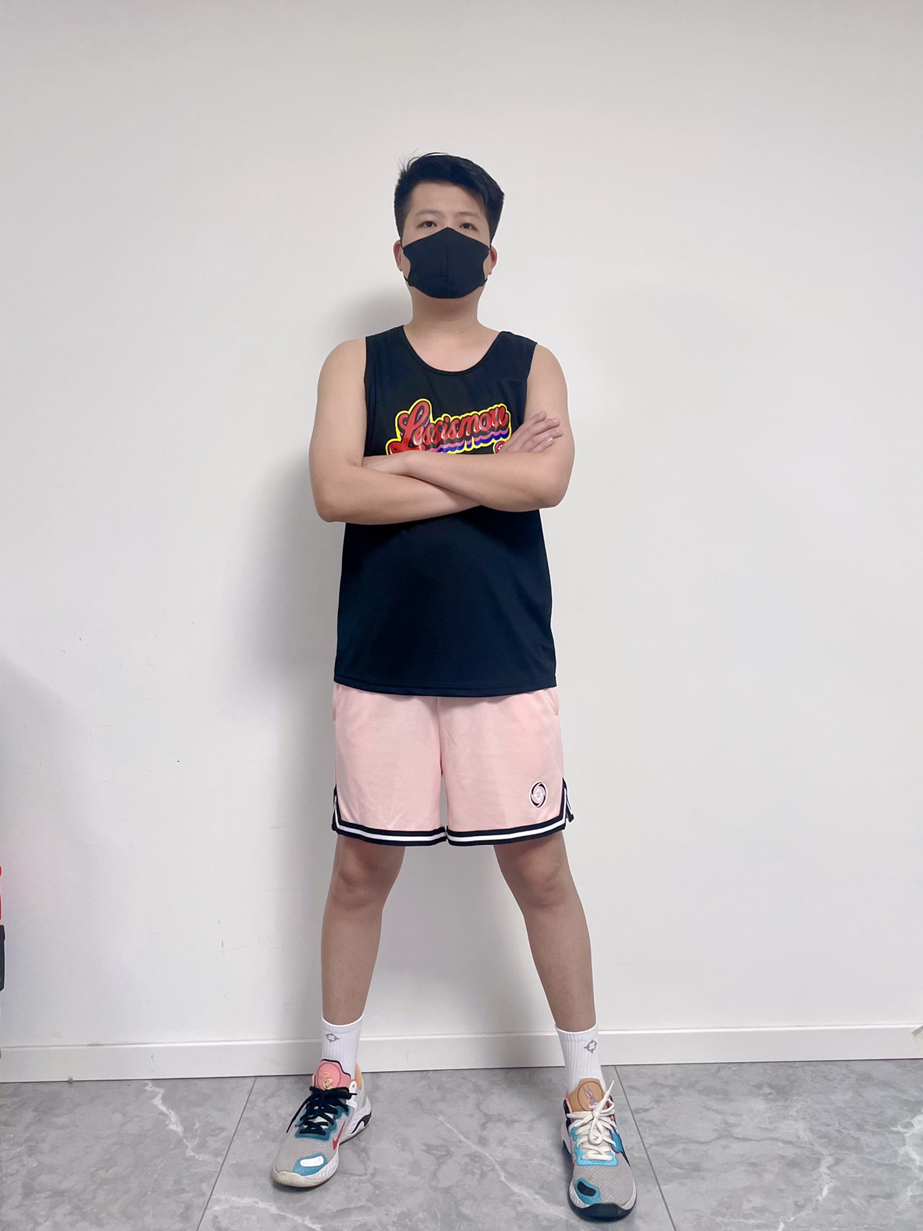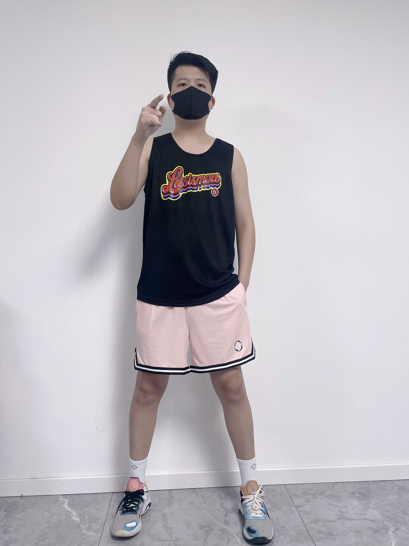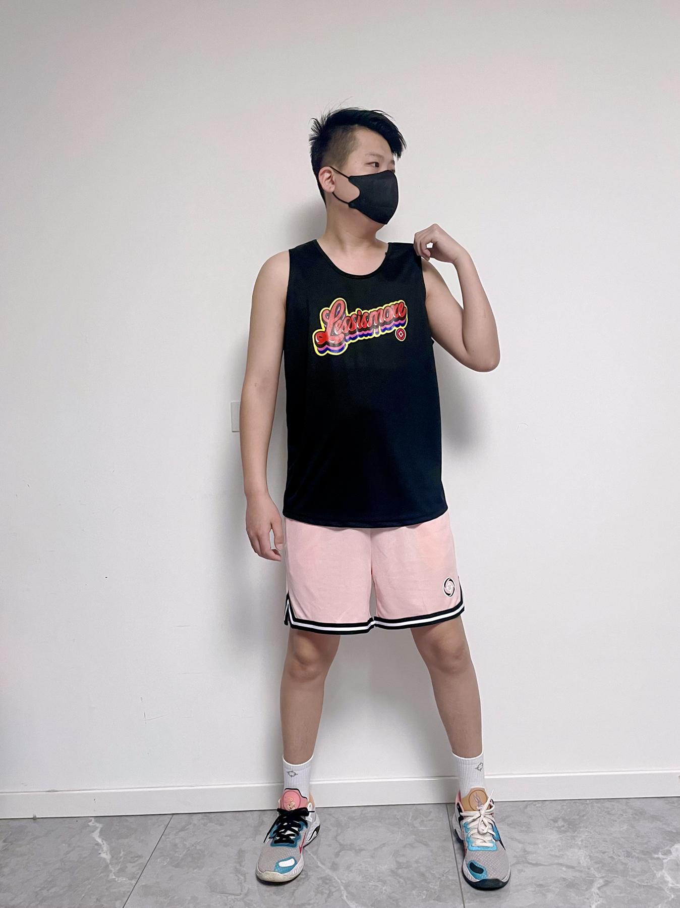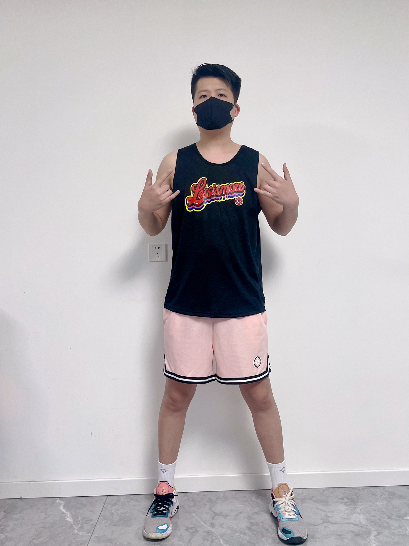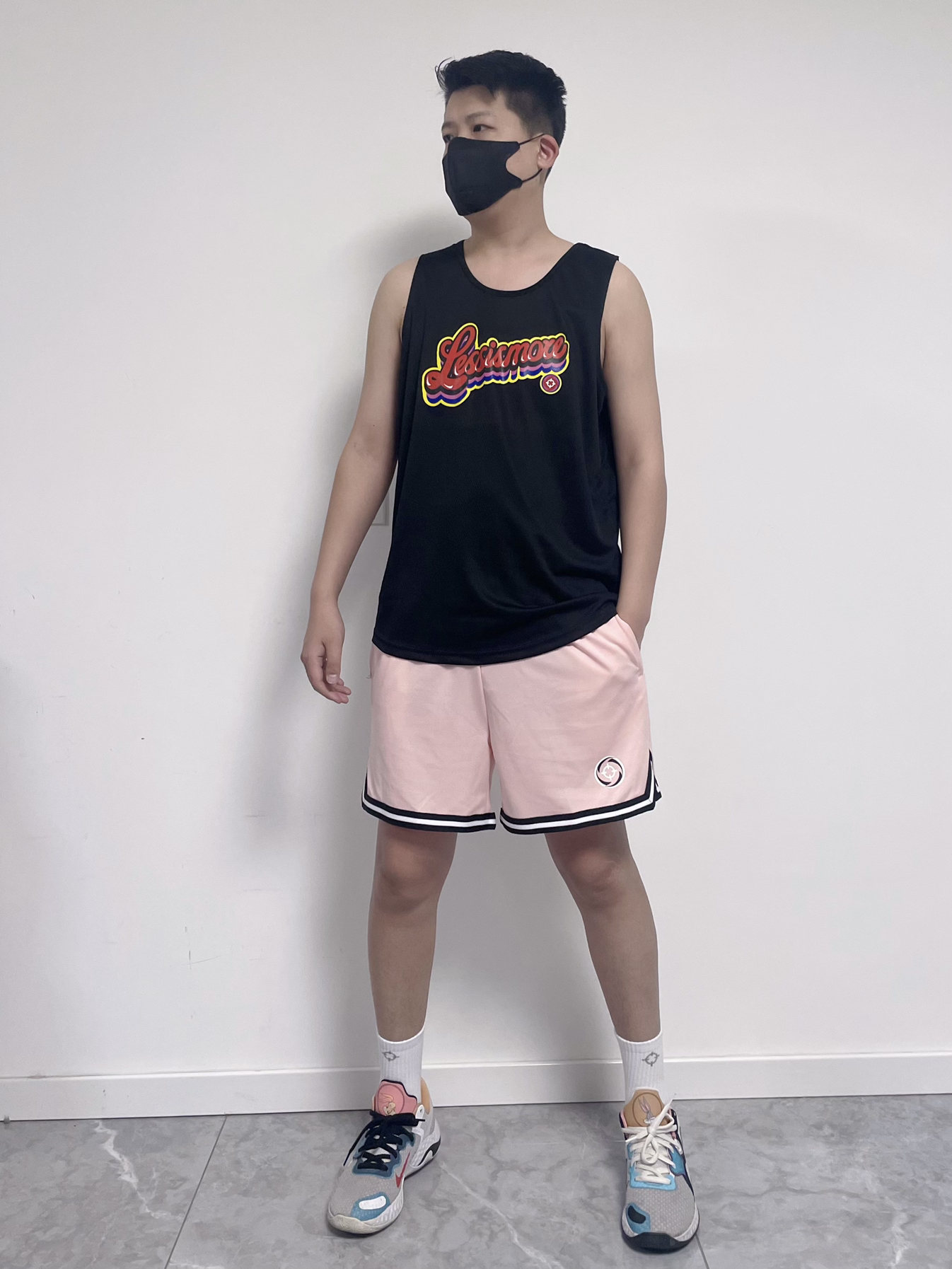 上衣选择了黑色的背心,特别清凉舒适 裤子原色了粉色的篮球裤 鞋子是能和裤子粉色搭配的篮球鞋
