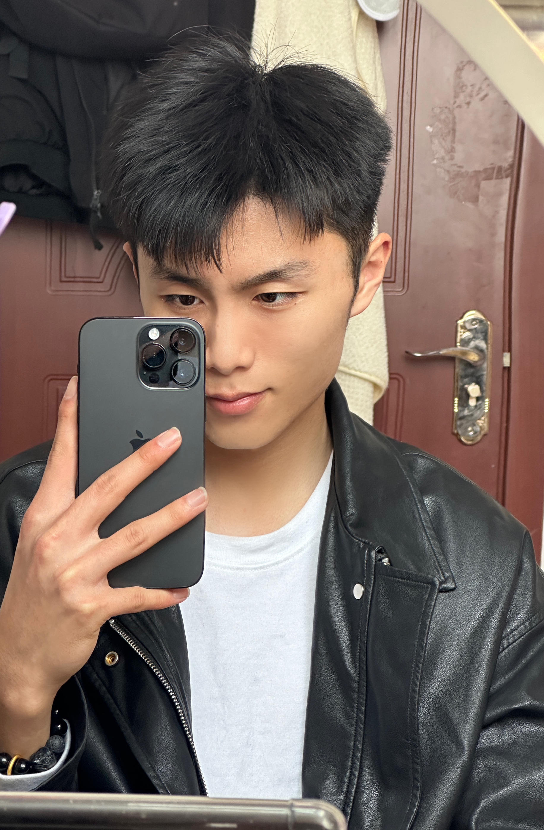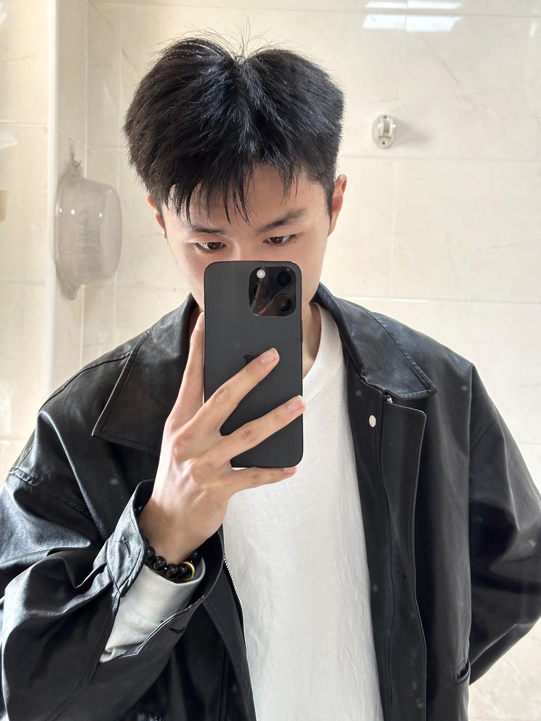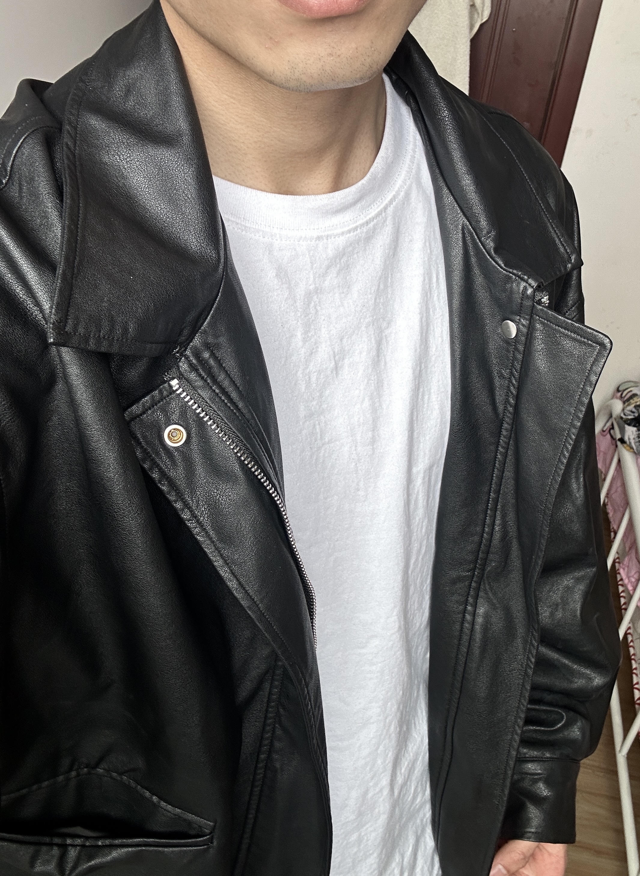黑色皮衣夹克真的帅,痞帅男生冲心这款黑色皮夹克质感真的很棒,材质舒适亲肤,穿上版型很挺阔,男生秒变型男,很有痞帅风。 拍照也很出片,搭配黑色的iphone 15pro Max,瞬间提升气质,帅哥们都去入手吧,你会感谢我的