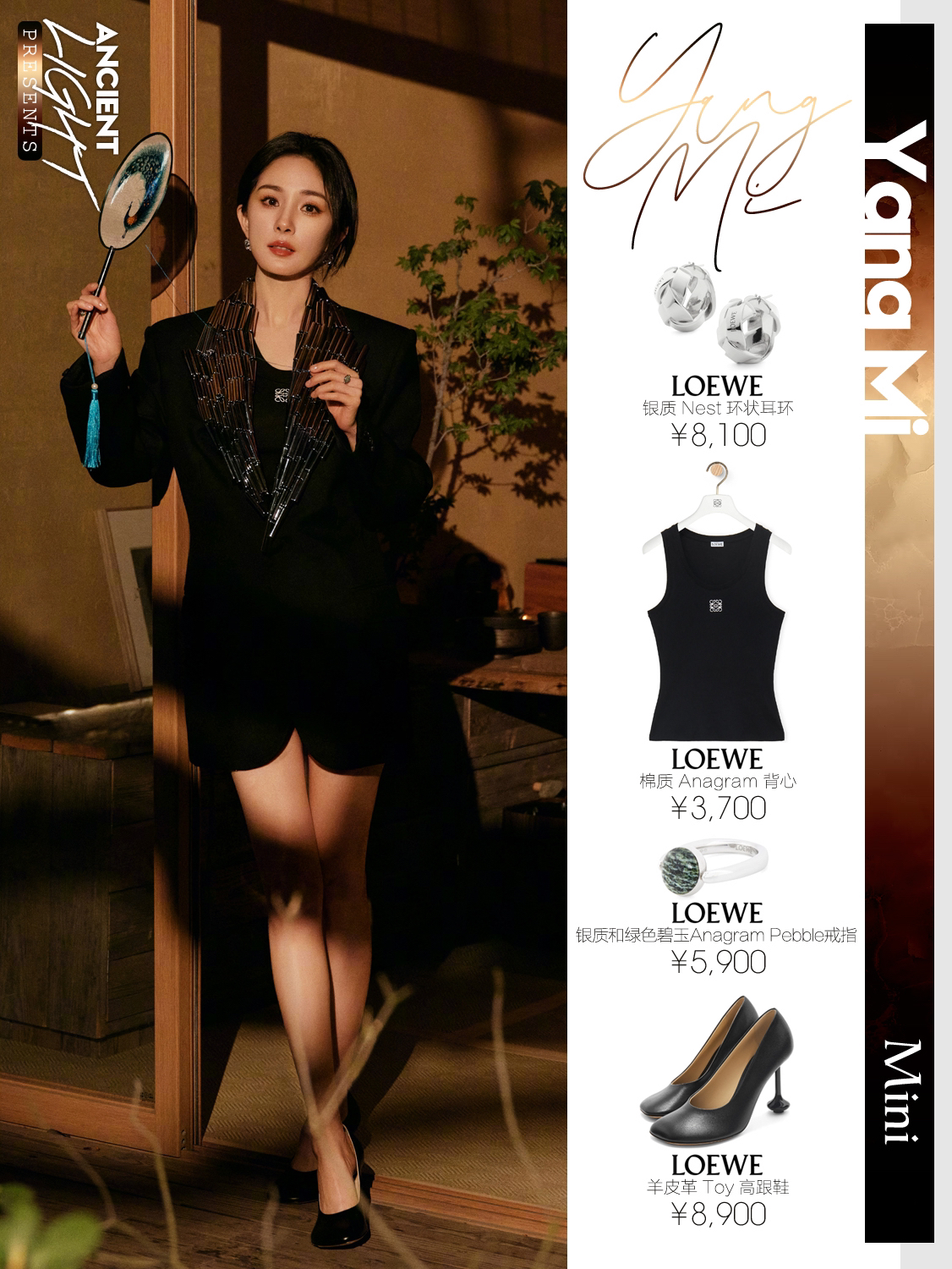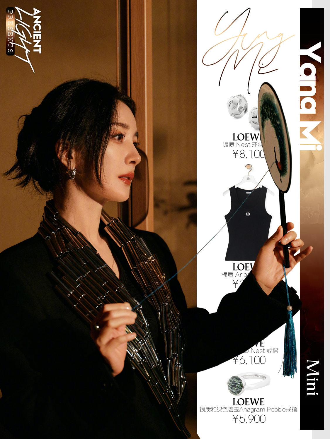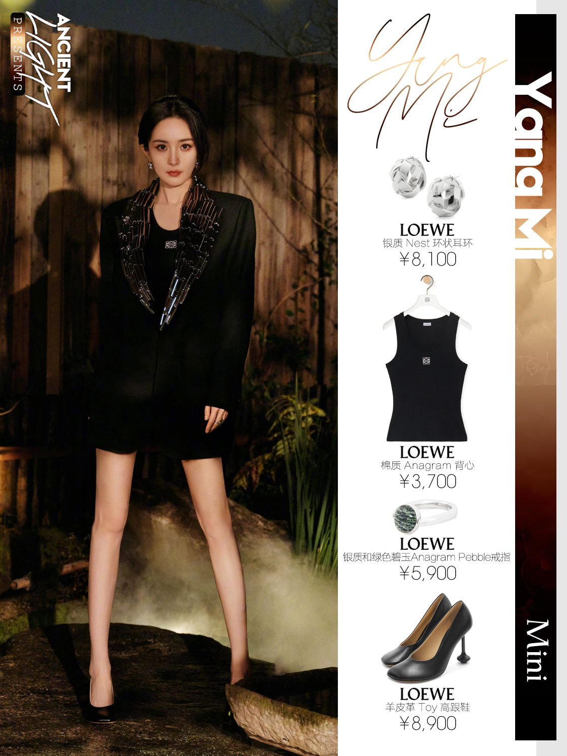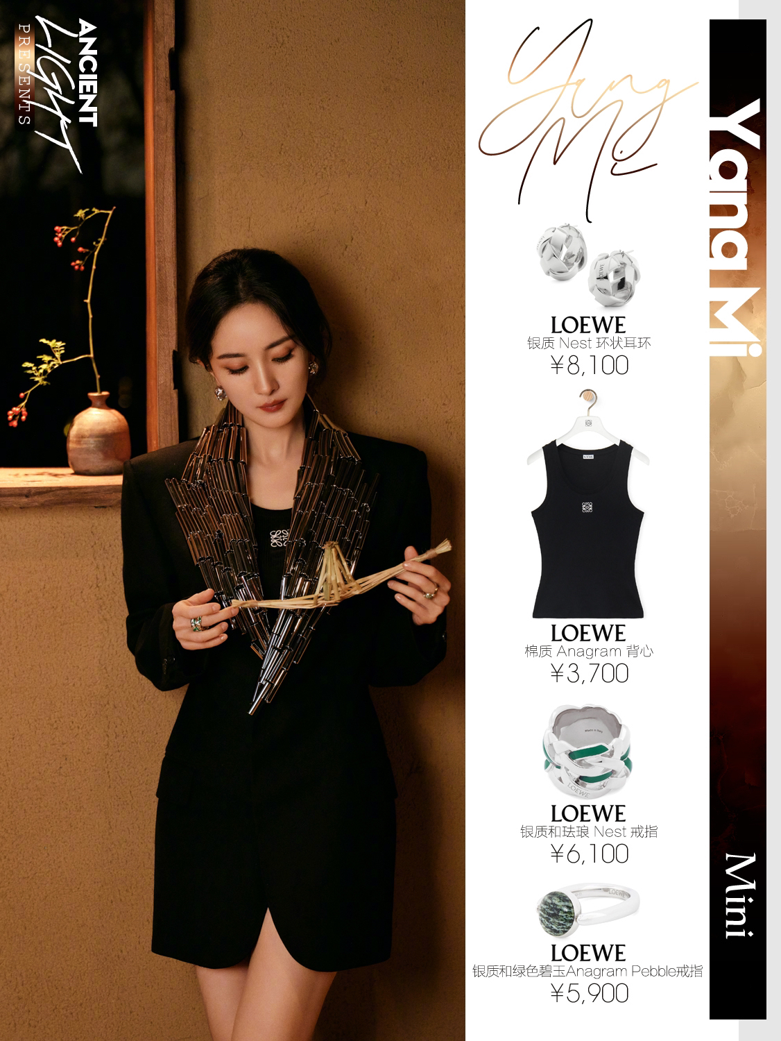 一草一木皆有灵,享受大自然的巧夺天工,及赋予人类的恩泽,杨幂再次刷新东方美学,大写是CHINA,小写是瓷器,文字之美,独树一帜的中国味道,纵享自然之古朴。 上装|LOEWE 2024秋冬女装系列 LOOK44 背心|LOEWE 棉质 Anagram 背心 货号S540Y07XA2 耳饰|LOEWE 银质 Nest 环状耳环 货号JN01239X02 戒指|LOEWE 银质和珐琅 Ne...