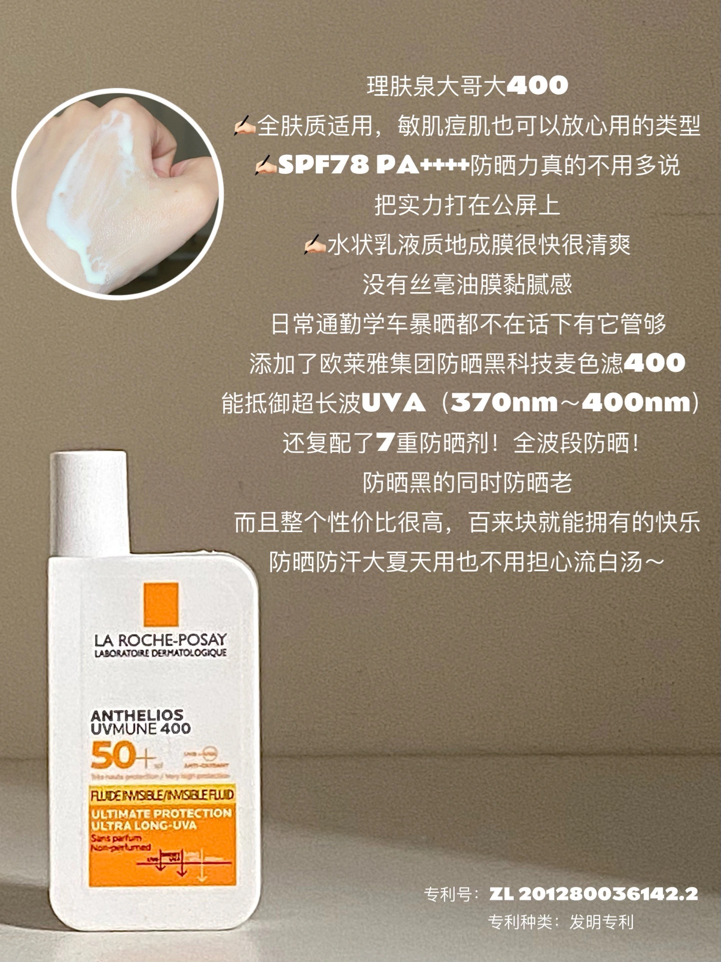 一些自用防晒分享 每一个都是精挑细选的类型 用对了才能晒不黑、晒不老 - 理肤泉大哥大400 ✍🏻全肤质适用,敏肌痘肌也可以放心用的类型 ✍🏻SPF78 PA++++防晒力真的不用多说 把实力打在公屏上 ✍🏻水状乳液质地,流动性很强 成膜很快很清爽,没有丝毫油膜黏腻感 日常通勤、学车暴晒都不在话下,有它管够 添加了欧莱雅集团防晒黑科技麦色滤400 能抵御超长波UVA(370nm~400nm) 还复...