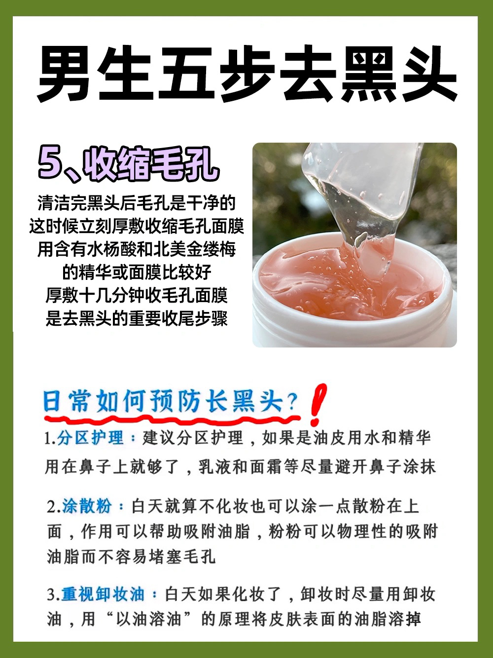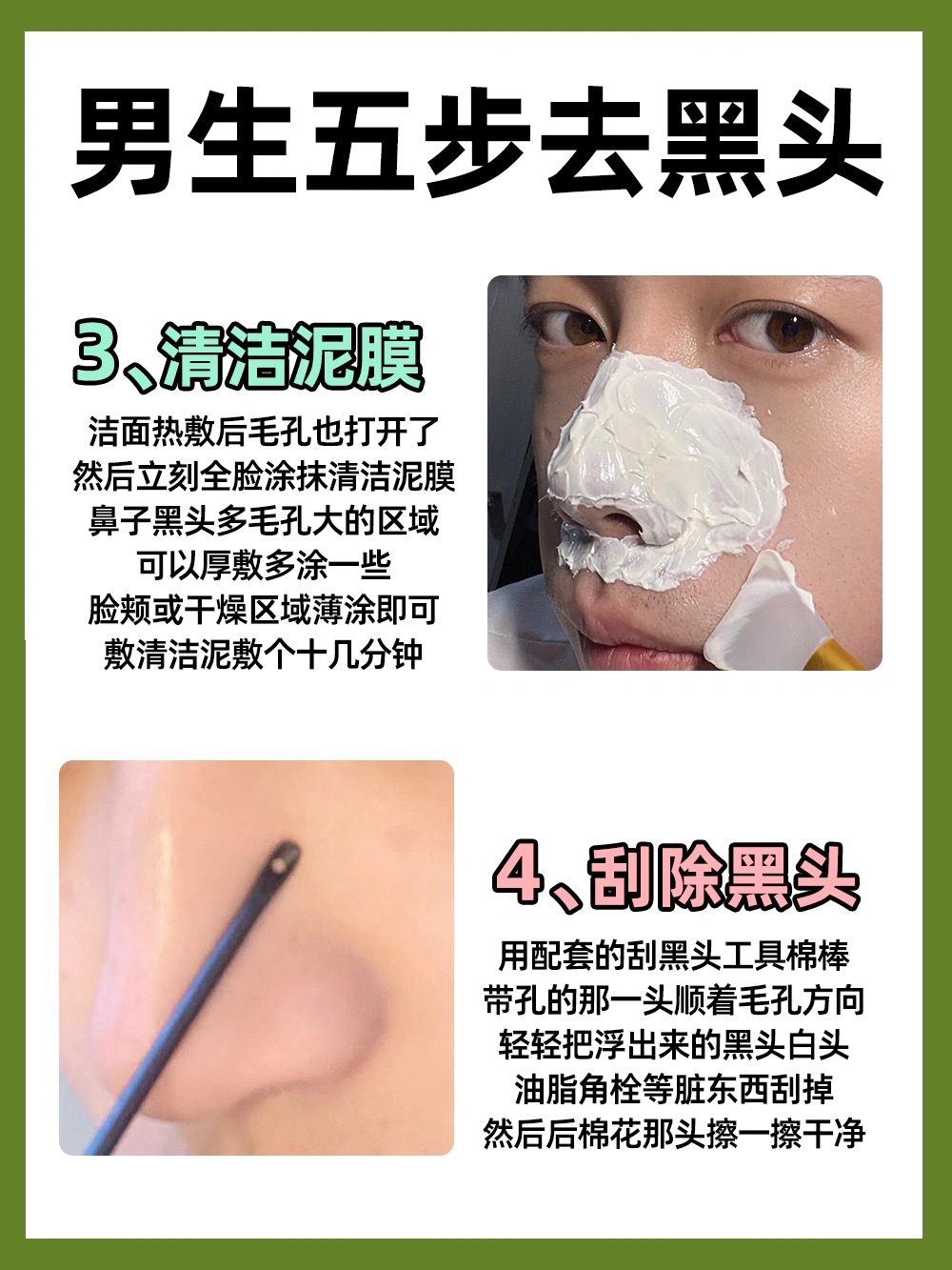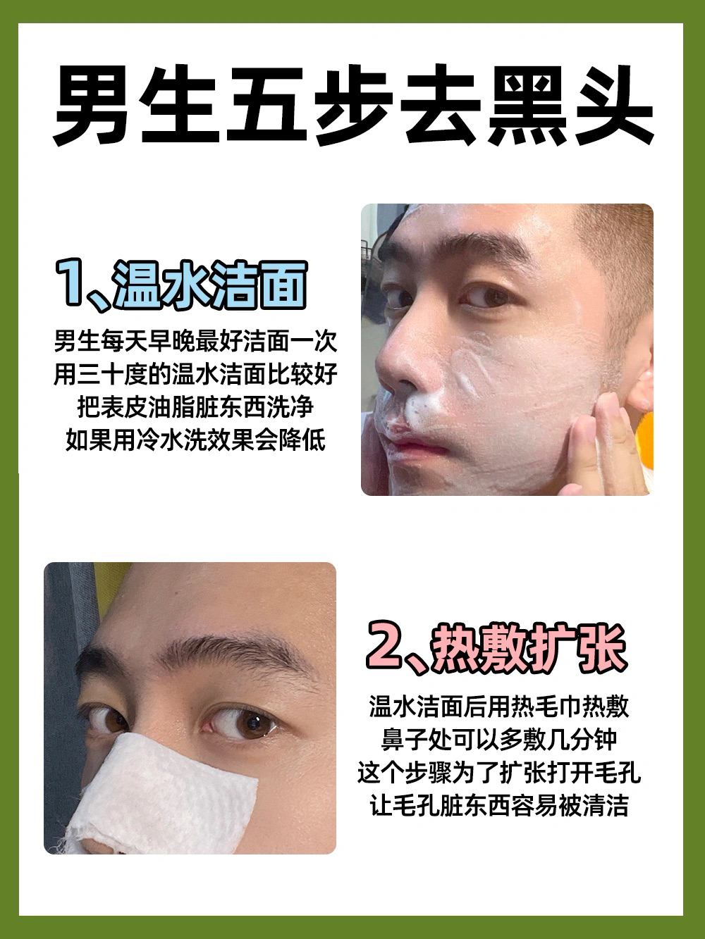 男孩子有黑头难去?其实不难! 要用对方法然后贵在坚持! 五个步骤的保姆级教程学会就能去黑头 - 1️⃣温水洁面 男生别再用冷水洗脸了,效果真的不如温水,改用三十度温度的温水洗脸你信我! - 2️⃣热敷扩张毛孔 洗完脸用热毛孔敷两三分钟让毛孔打开,尤其是鼻子可以多敷一会,这样清洁黑头变得容易了 - 3️⃣敷清洁泥膜 用一款温和不刺激去黑头能力又强的清洁泥膜,比如AYBB的321清洁面膜,三泥二酸一油...