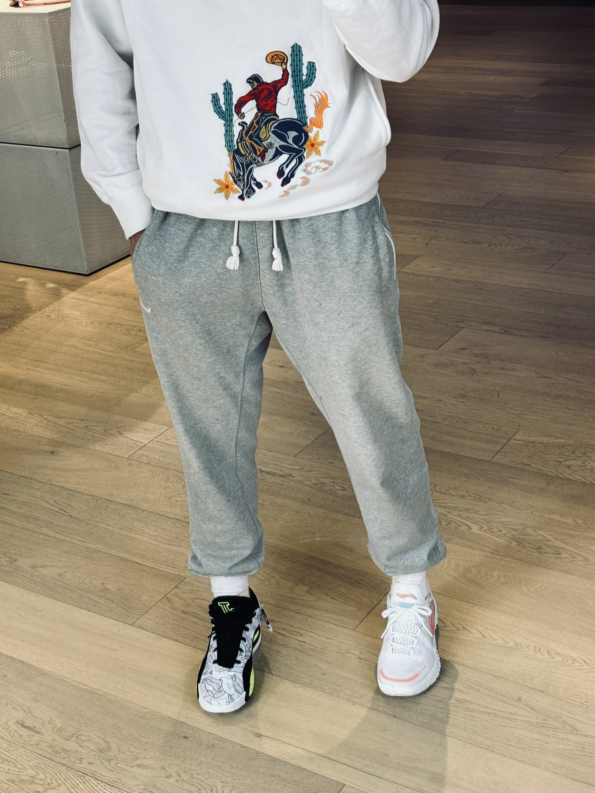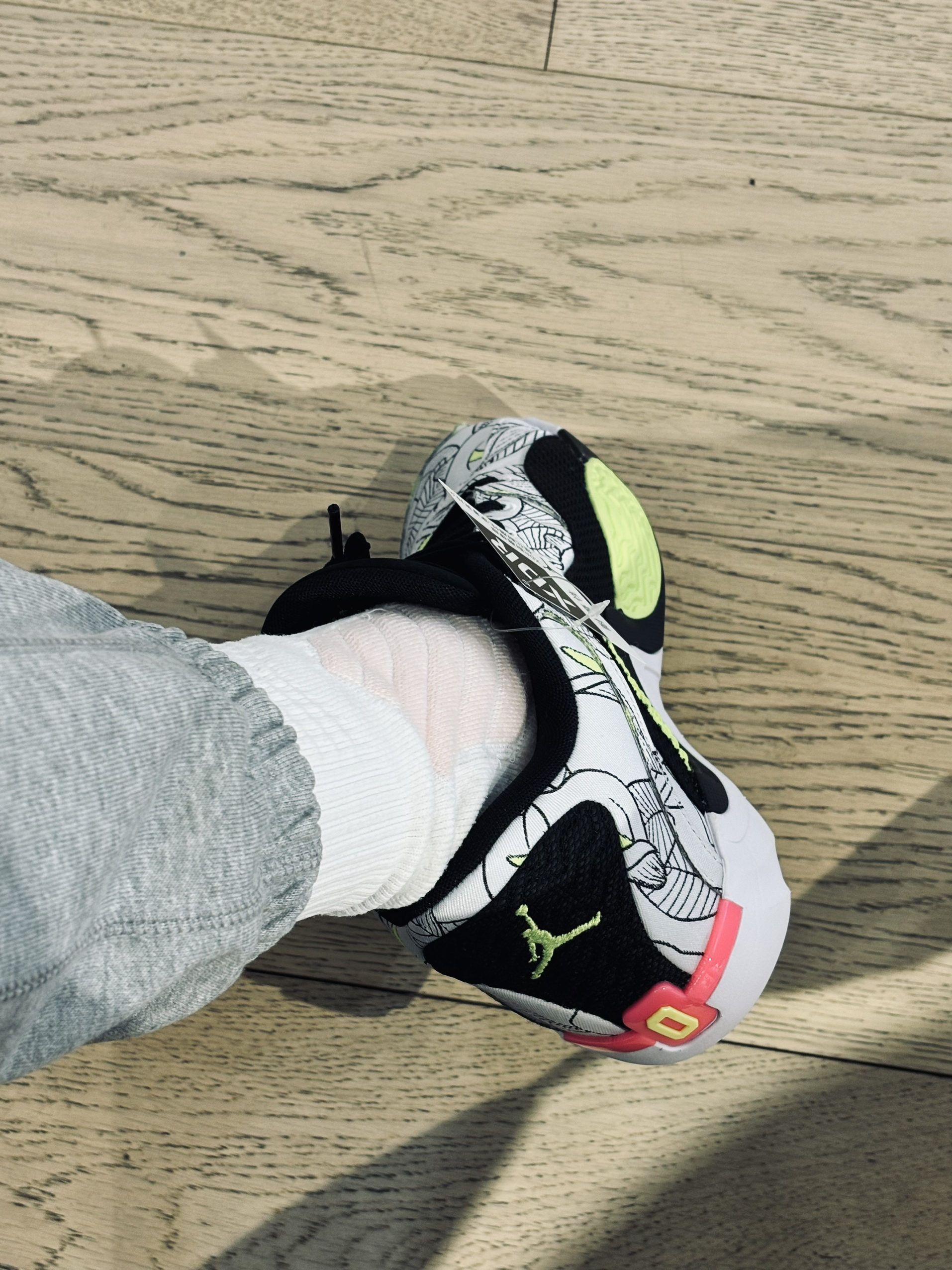 #试衣间里的时尚觉醒 #春天要把彩色穿个遍 #休闲运动风 #当我学会了有效穿搭 #我预测这鞋能火 兄弟们塔图姆二代真的是把春天穿在脚上了 鞋面的花卉装饰图案真的很有意思 就是有点花哨我这个年纪还好能驾驭得住 搭配灰色束脚裤运动风这不就来了 蹲下拍也不错 束脚裤你们可以把袜子放到下面一点这样最好看 不要把袜子扎在外面会很抓,别问我怎么知道? 鞋的配色有点多就用身上呼应它 再用纯色系搭配就行...