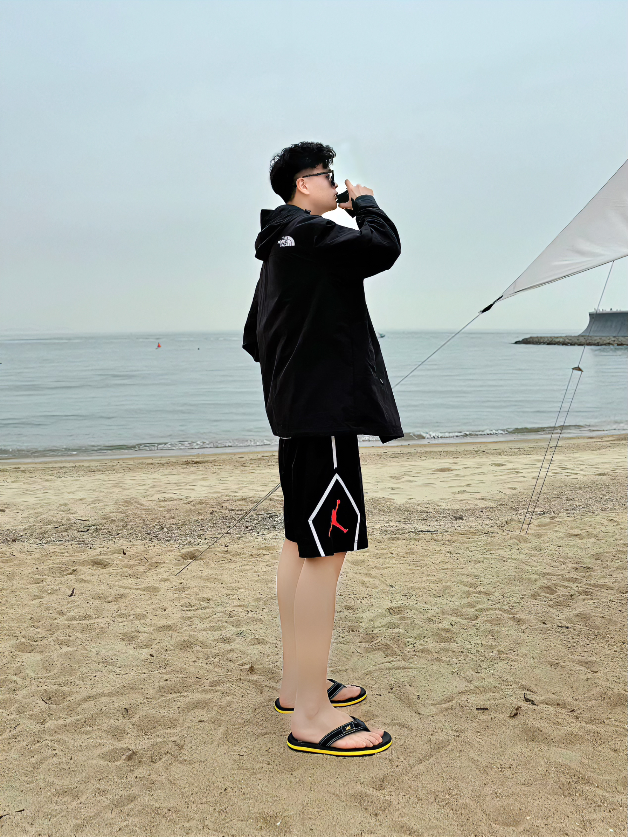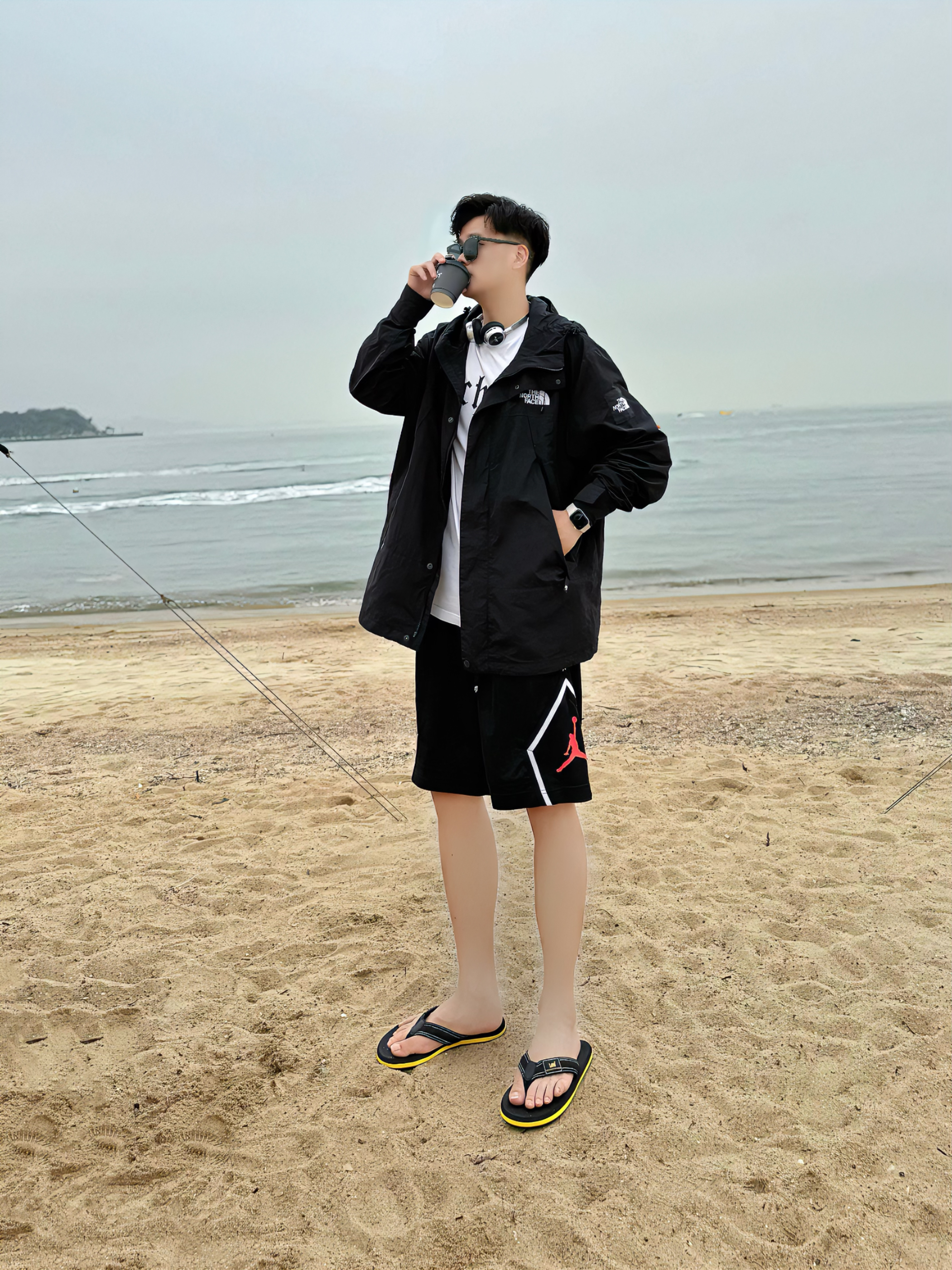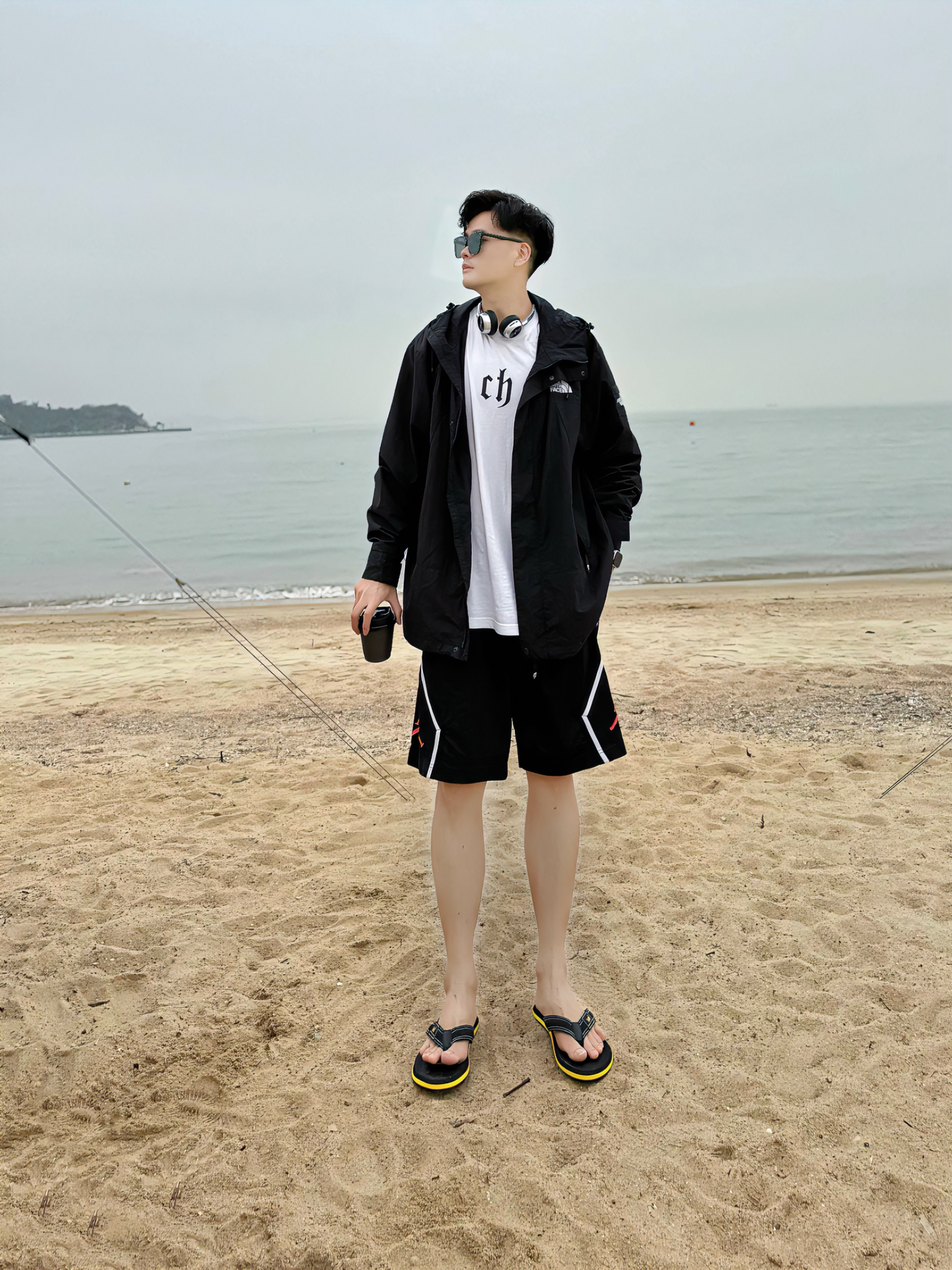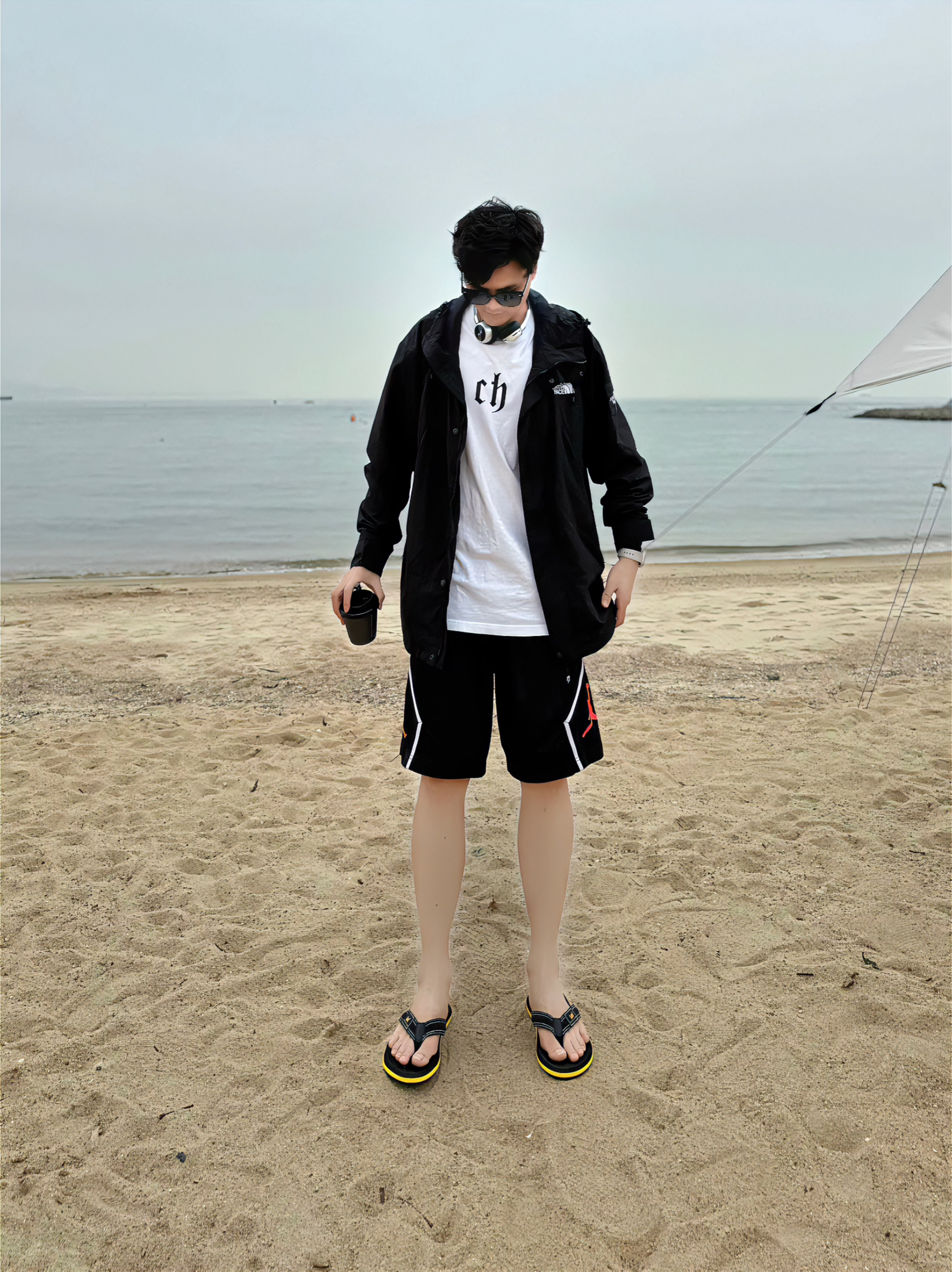 哈喽哈喽耶,我是阿b仔 Today去沙滩玩,分享我的穿搭ootd 👕上身先来一件白色短袖打底 🧥然后外穿一件黑色冲锋衣 简单又带点酷,潮男轻松拿捏了 🩳下身搭了一条黑色短裤 搭我的冲锋衣ok的,户外感满满 🩴鞋子穿了一双黑色人字拖 简单logo外观颜值很高,上脚潮流帅气 穿着也还挺舒服的,质感还不错蛮nice - 180cm/72kg