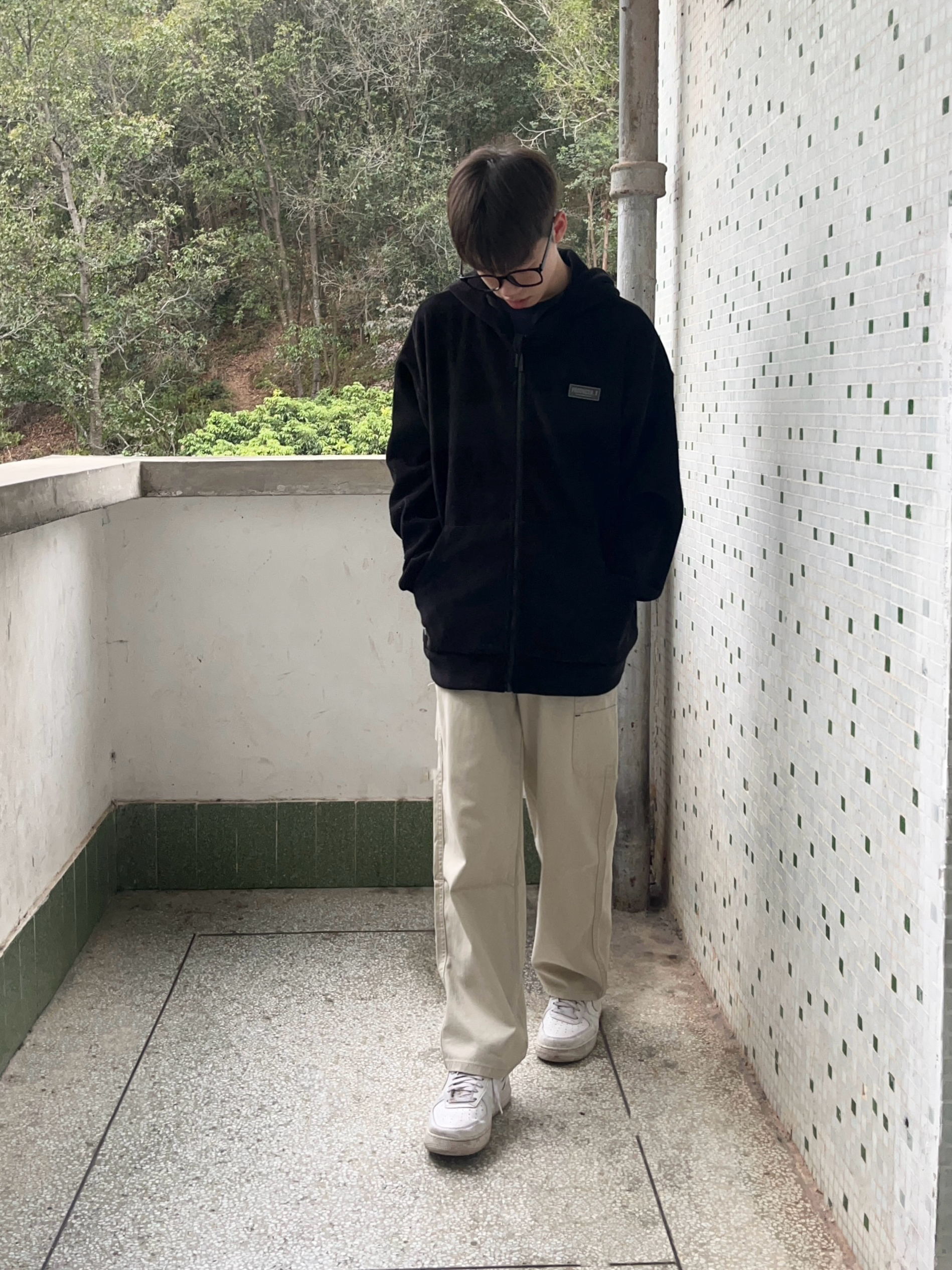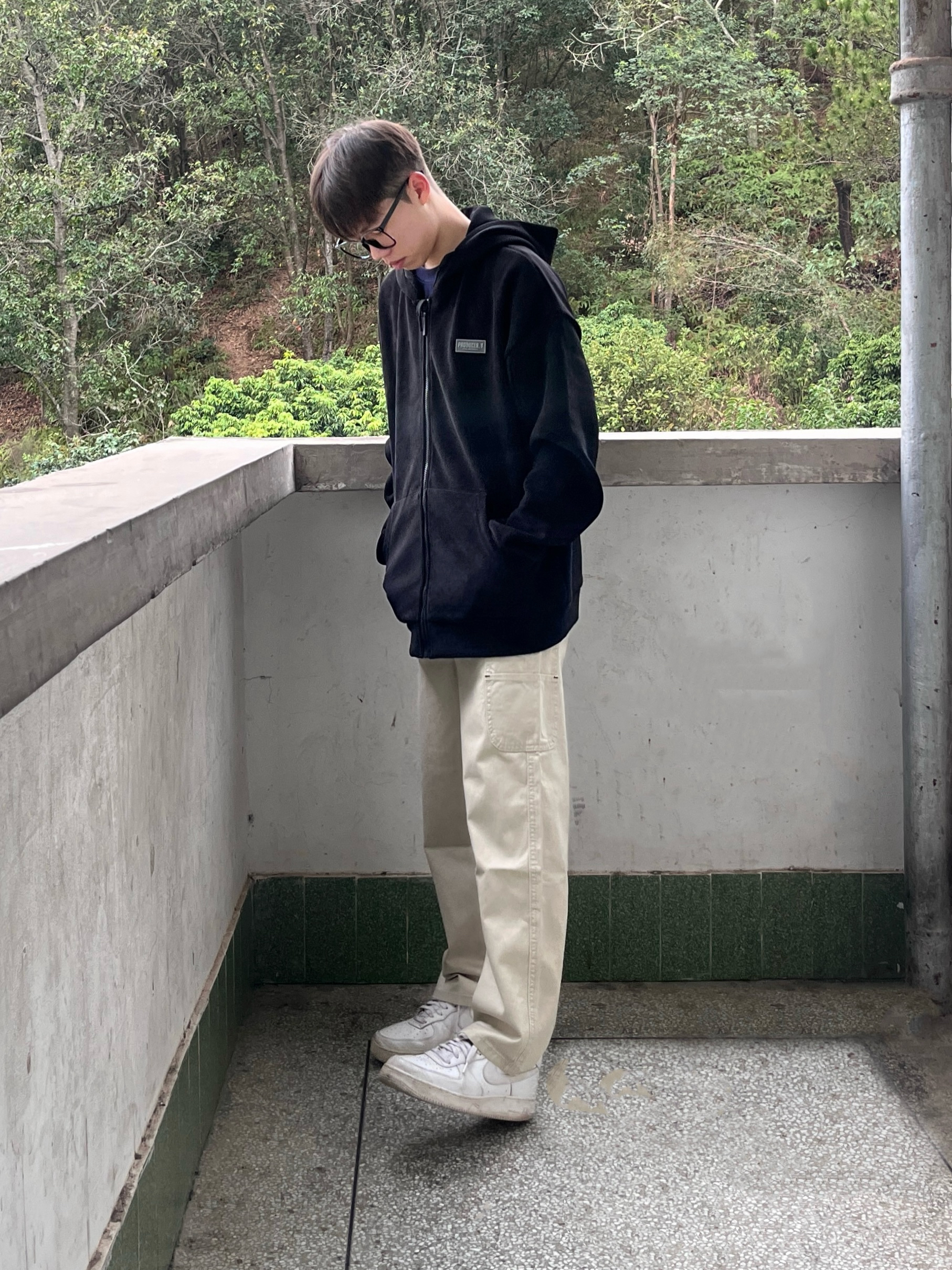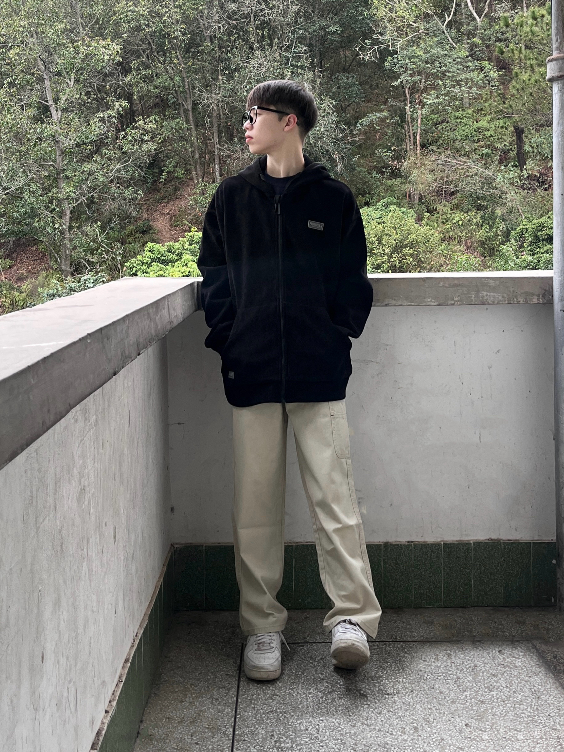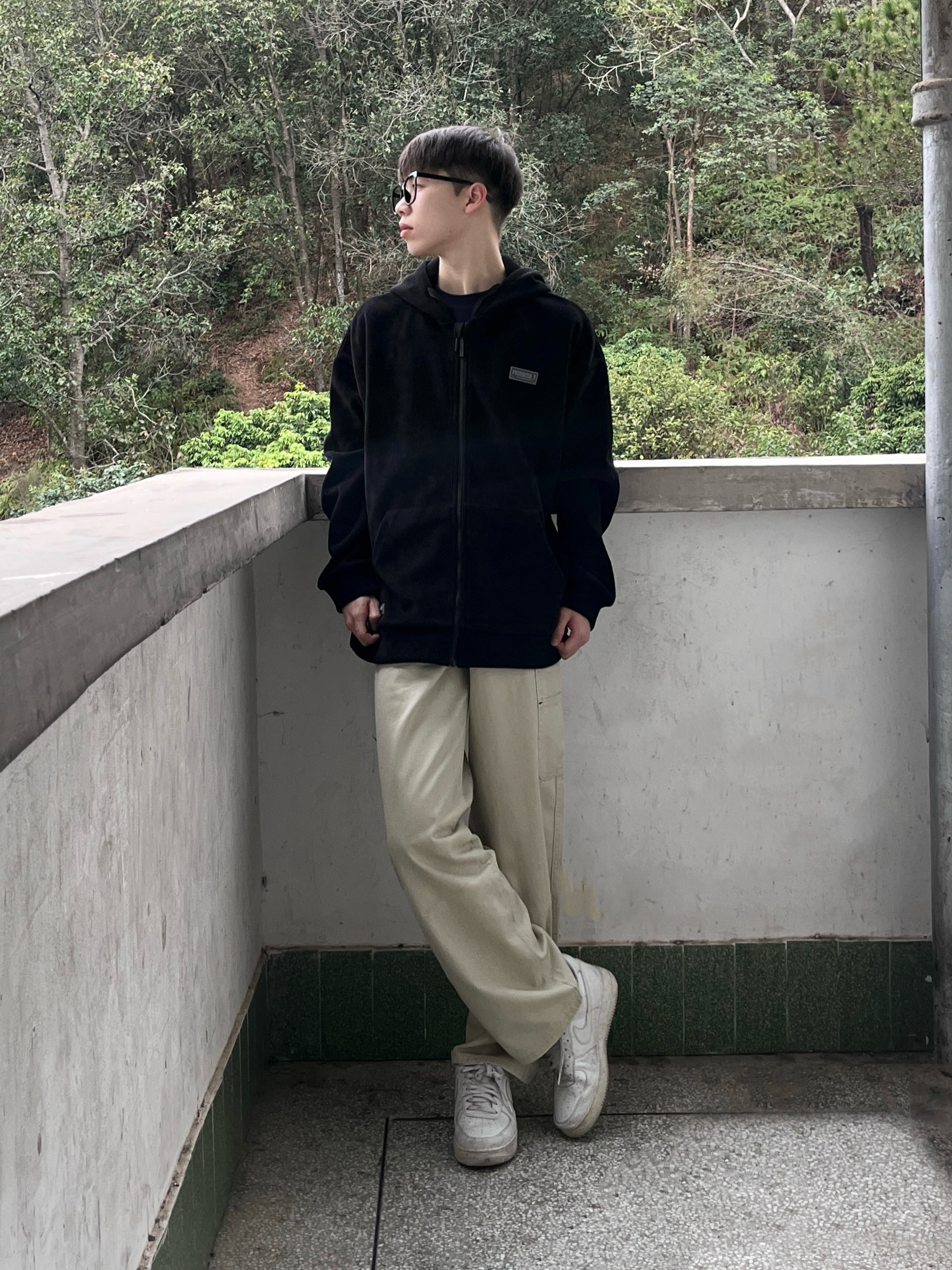 今日份穿搭分享look👀 衣服是黑色的简约连帽卫衣 面料柔软舒适 穿上很有oversize感 再搭配一条浅杏色工装直筒裤修饰腿型 版型宽松显瘦 最后上脚一双经典空军一号板鞋点缀 鞋底防滑耐磨 穿上后脚感舒适透气 一套搭配下来 日系风拉满