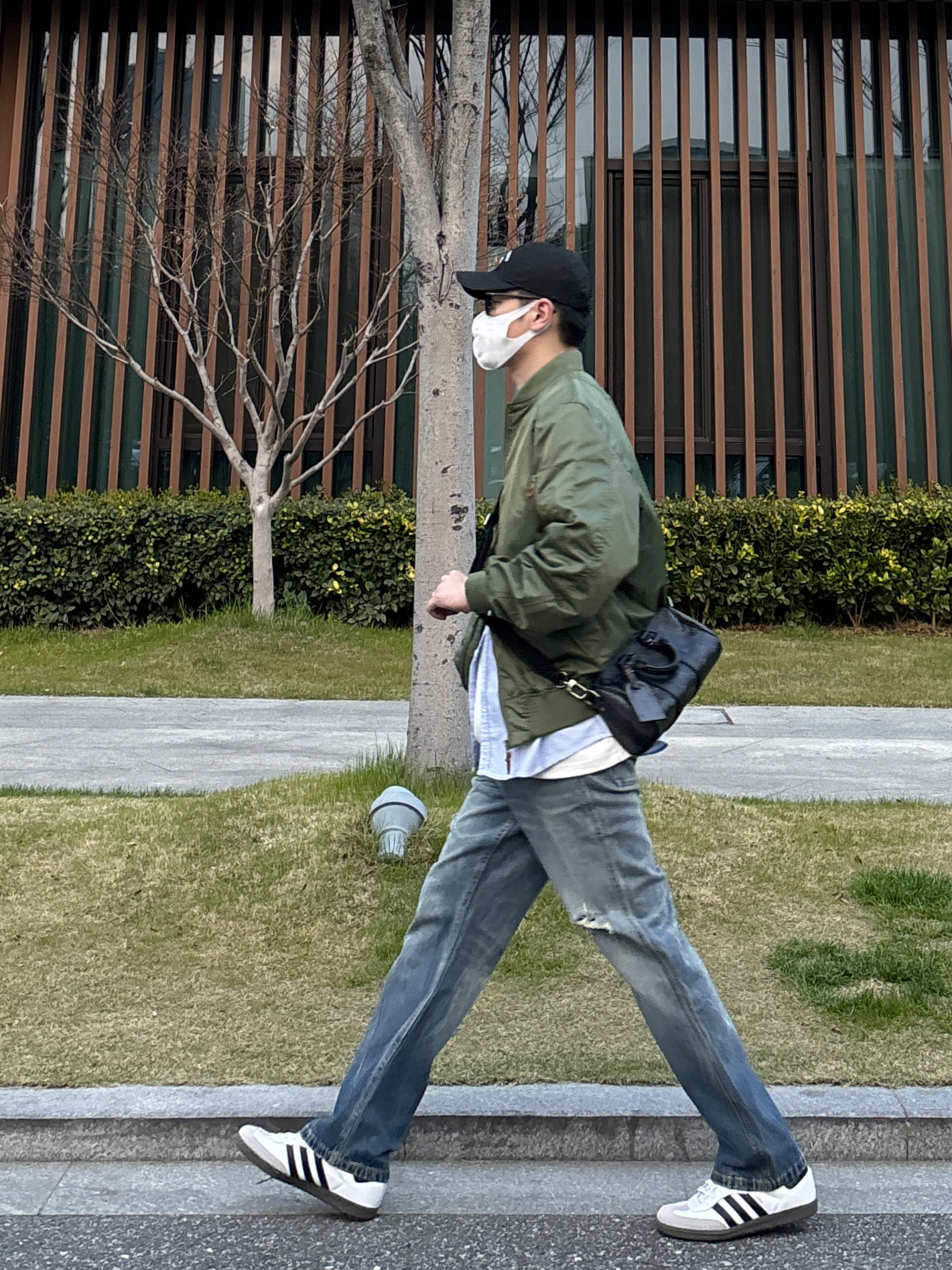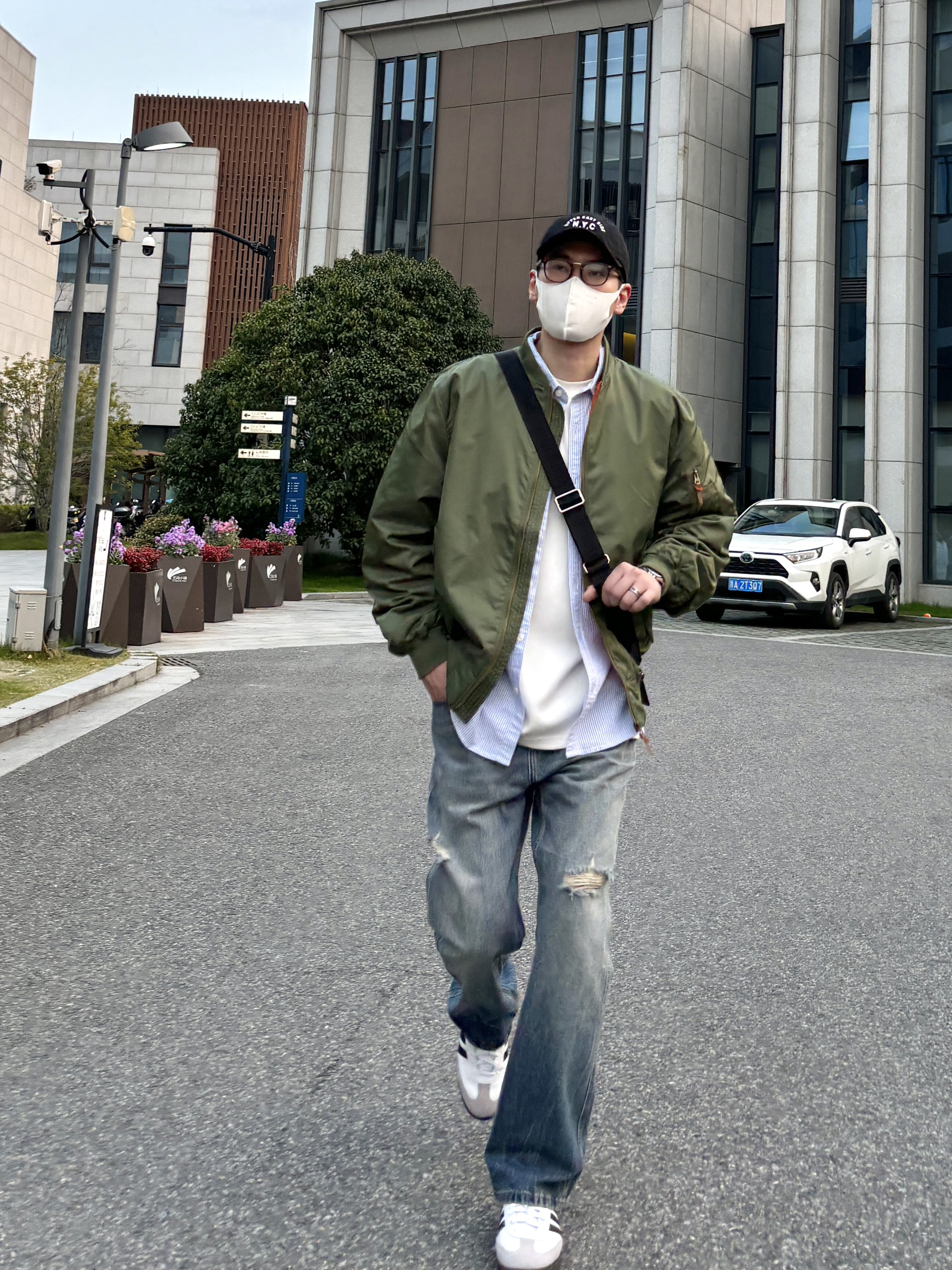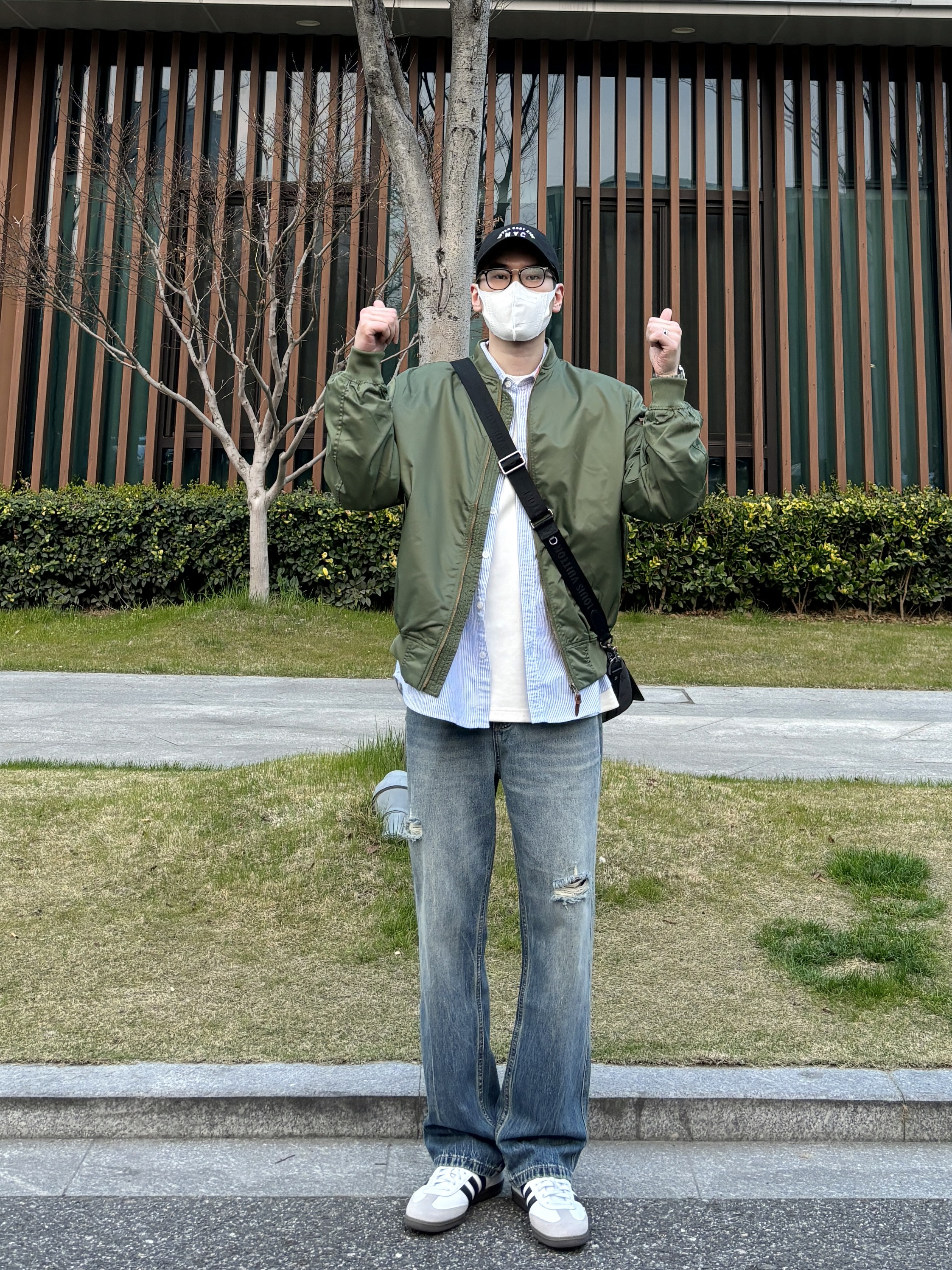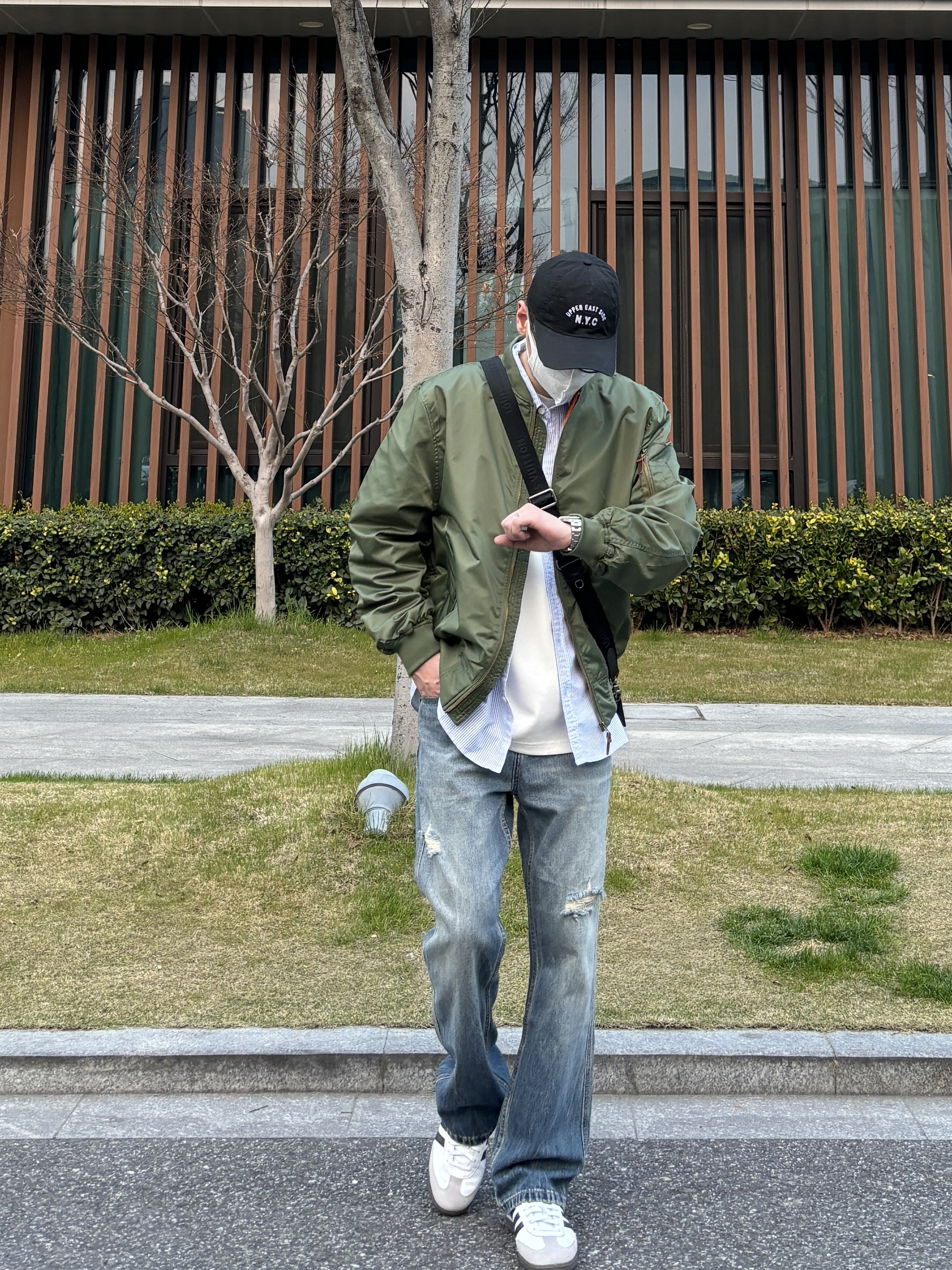 今天这套先用蓝色条纹口袋衬衫做叠穿 ⬇️ 裤子选择显腿长的直筒水洗破洞牛仔裤 ⬇️ 鞋子上脚简约百搭的黑白samba德训鞋 ⬇️ 接着套上军绿色宽松阔版棒球领MA1空军夹克 ⬇️ 最后背一个精致的皮质斜挎包 - 今日搭配 衣服裤子都来自:NICE LILI 鞋子:adidas samba