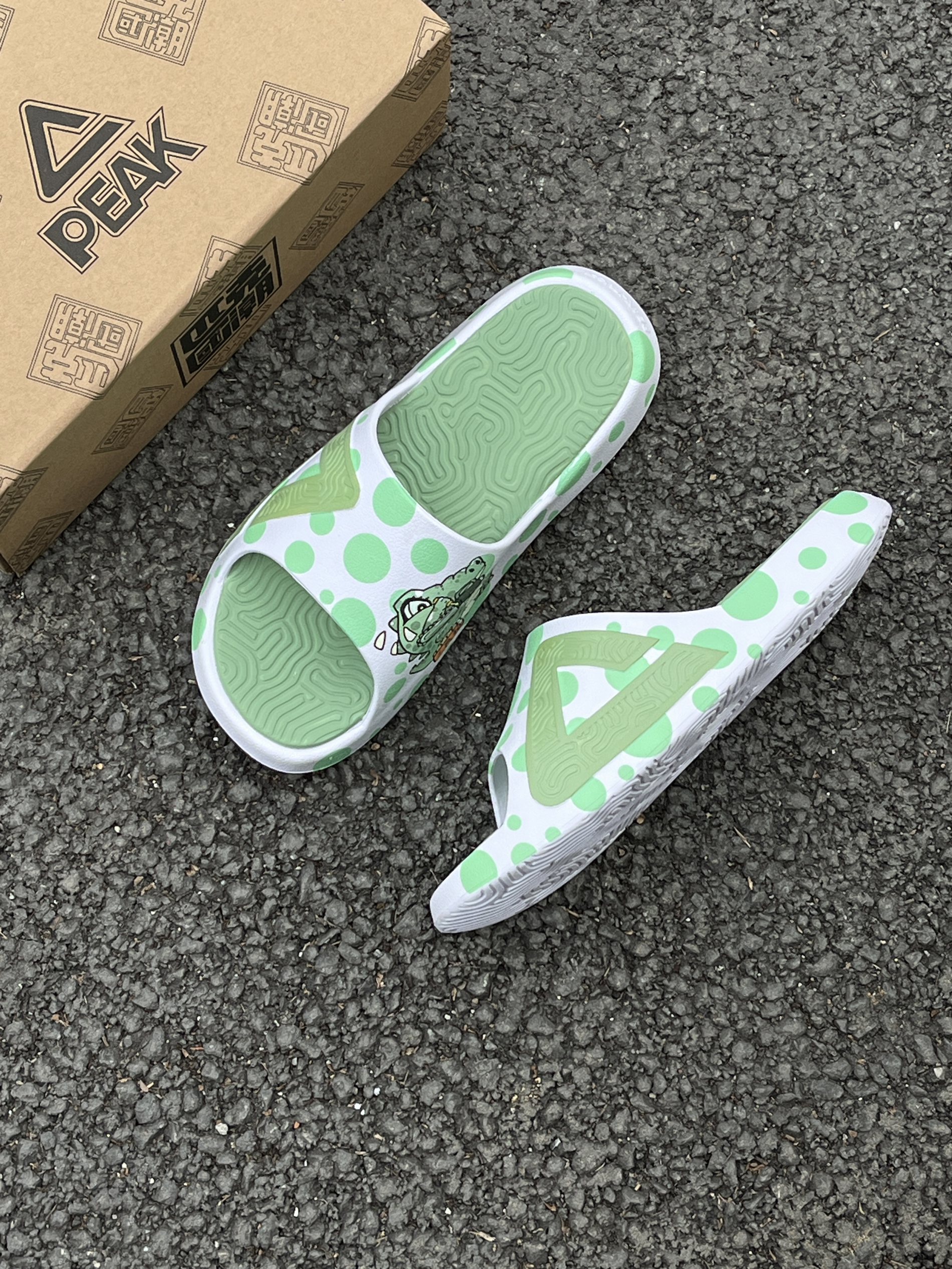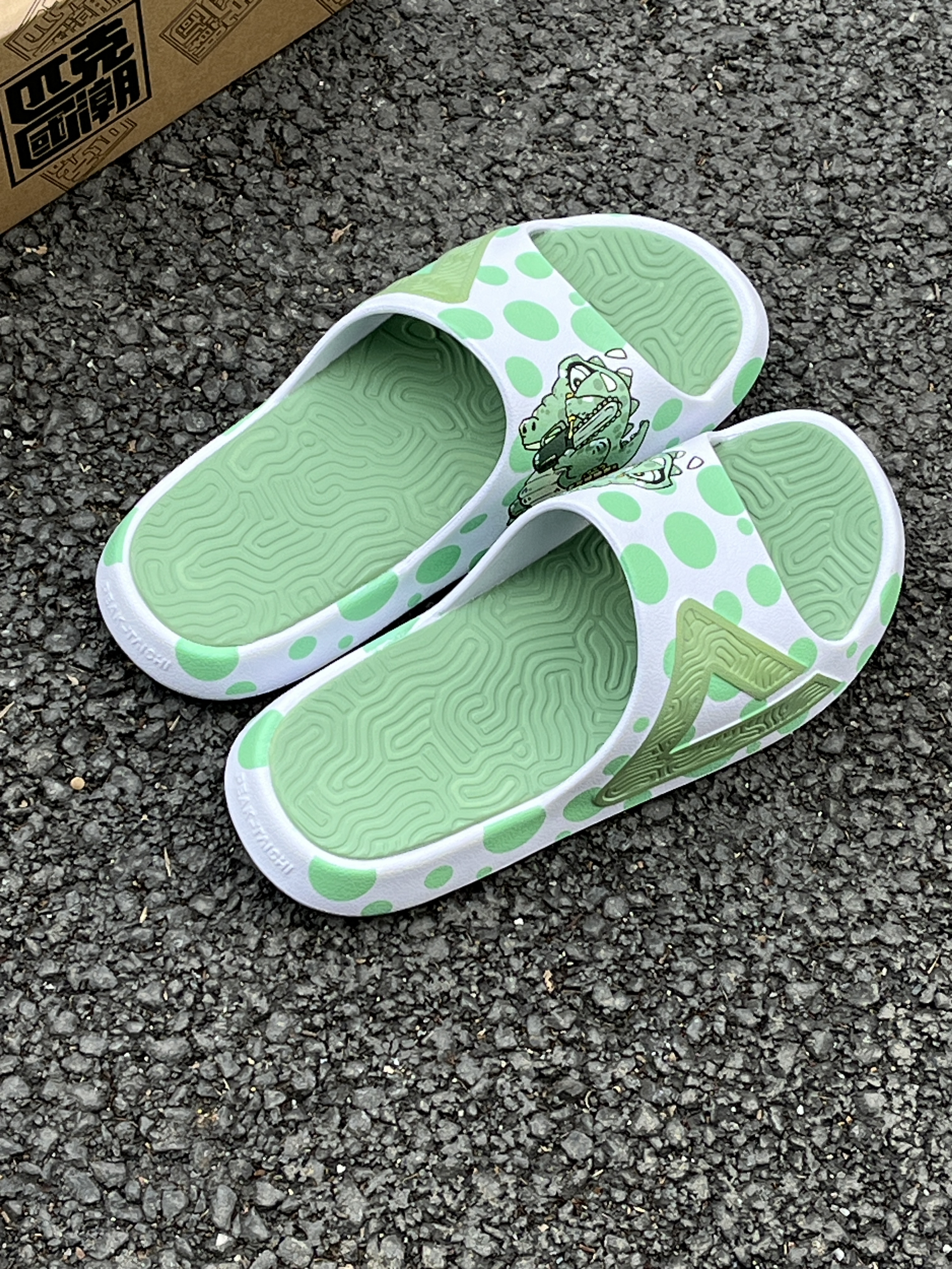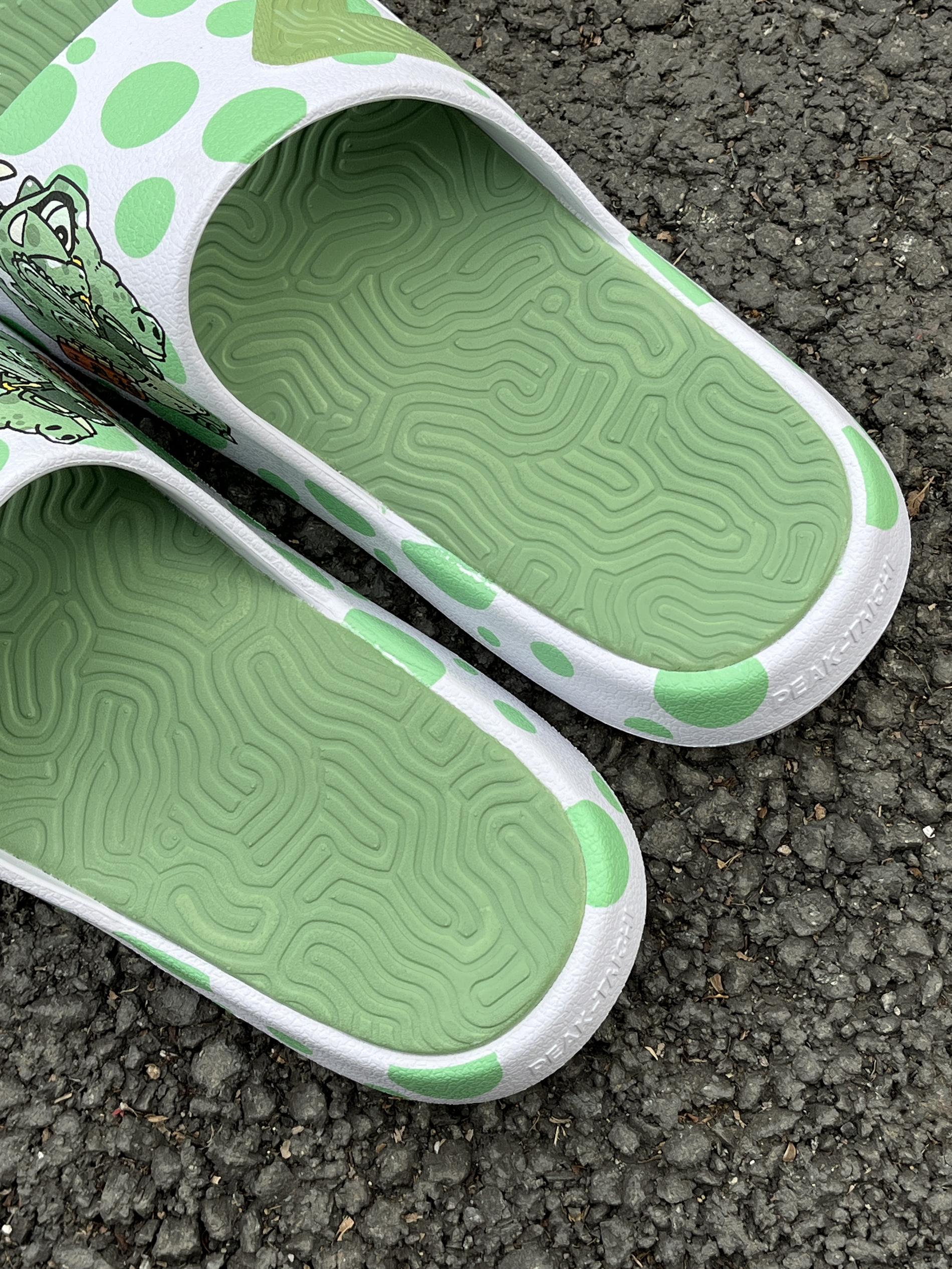 哈喽购大家好,这里是CC_同学 今天给大家分享一双很有创意的拖鞋 就是这双 匹克国创系列 态极拖鞋 小鳄鱼涂鸦 实物收到手有种专门定制鞋的视觉感! 白色十绿色的组合也太有夏天的感觉了吧! 干干净净有活力! 穿腻了黑白色不妨尝试一下它吧! 绿色小鳄鱼的四涂鸦也太有童话感了! 可谓个性十足! 上脚脚感。也很舒适,踩鱼感很足! 日常出行或者运动完穿着都很合适! 尺码建议拍大一码脚感更佳!