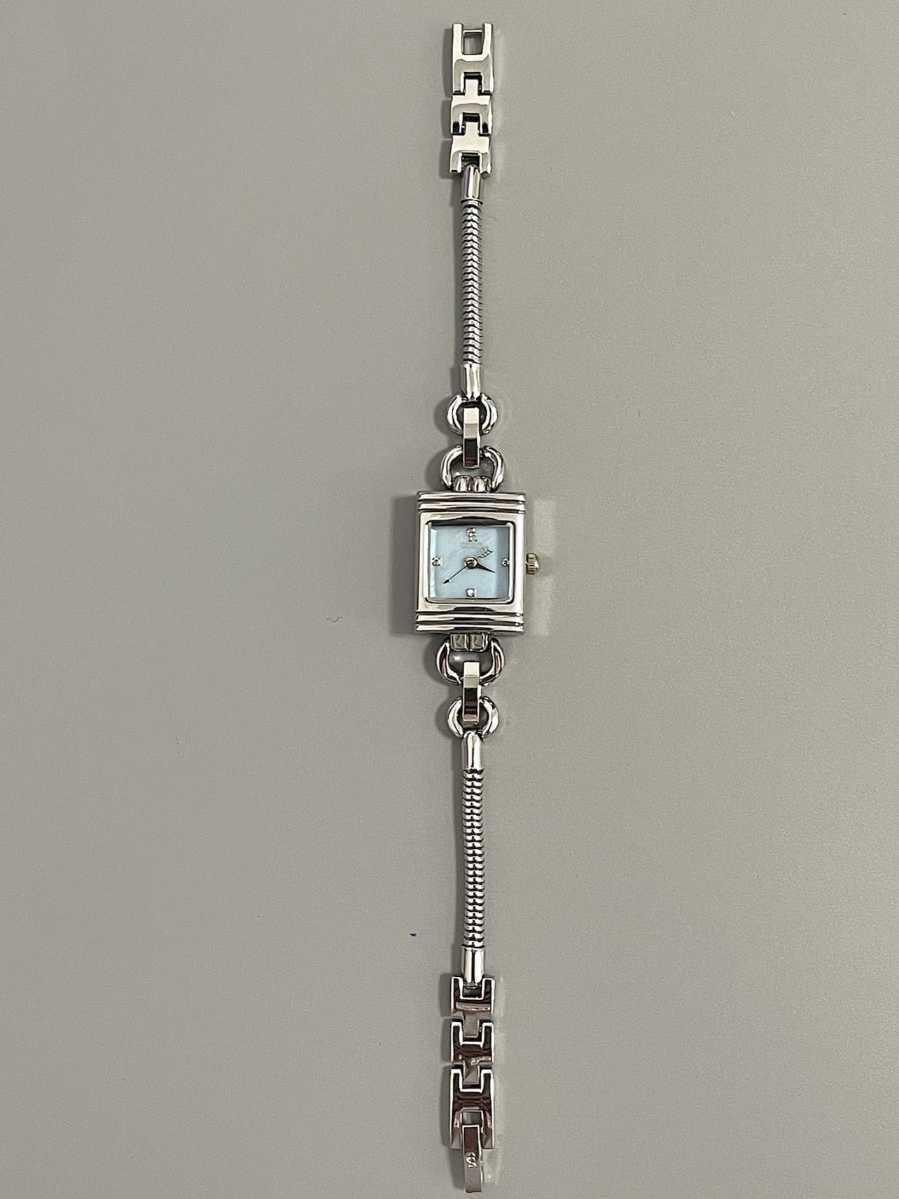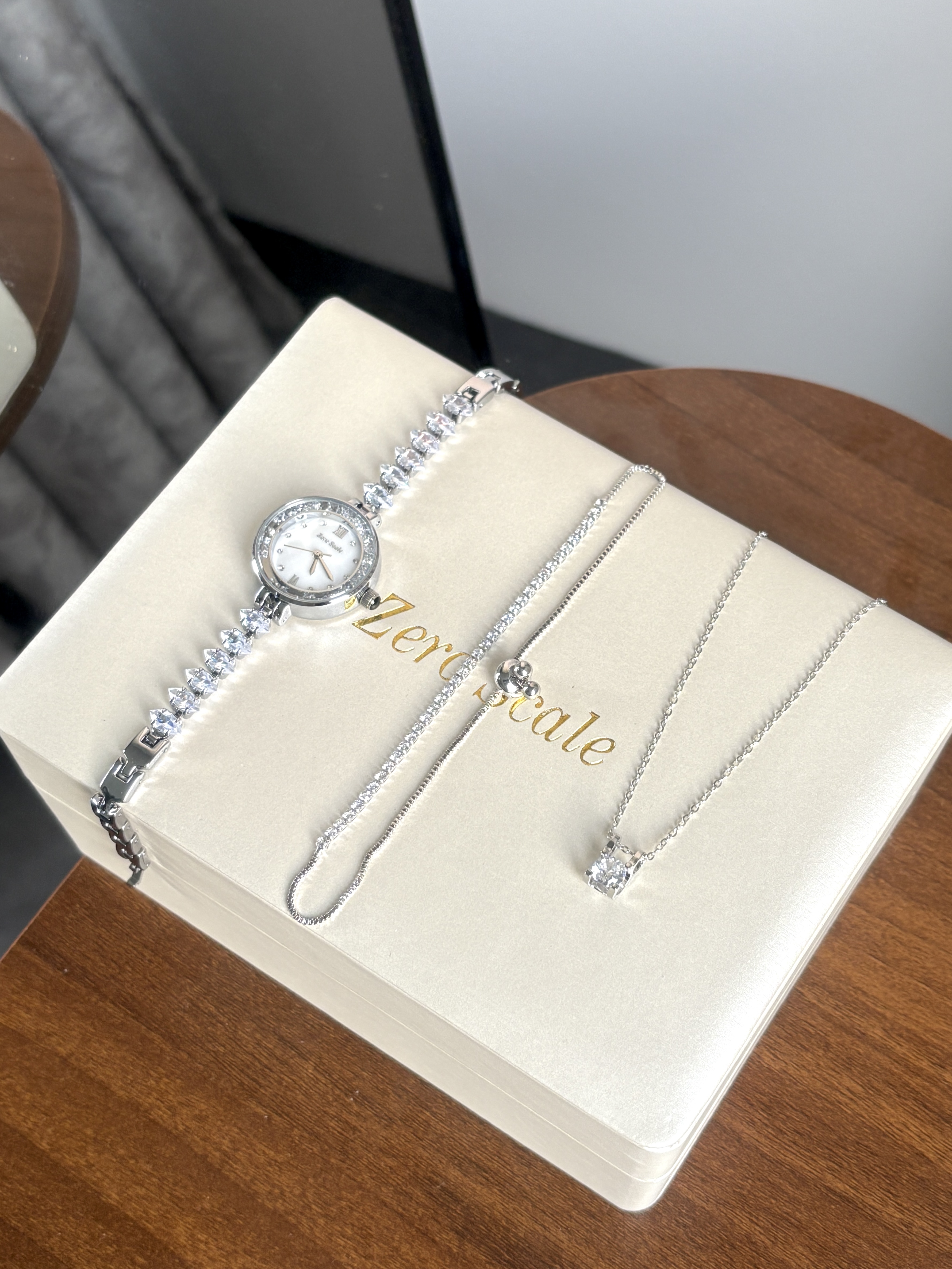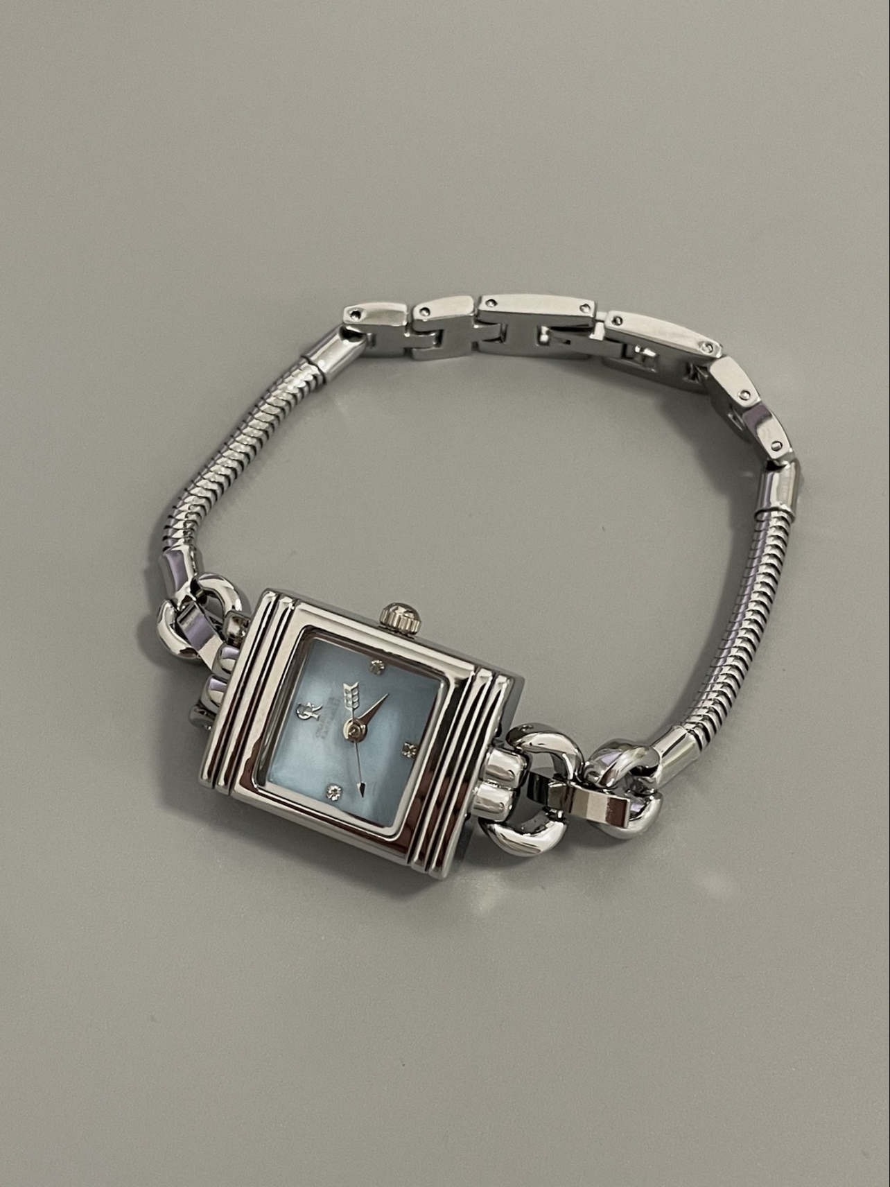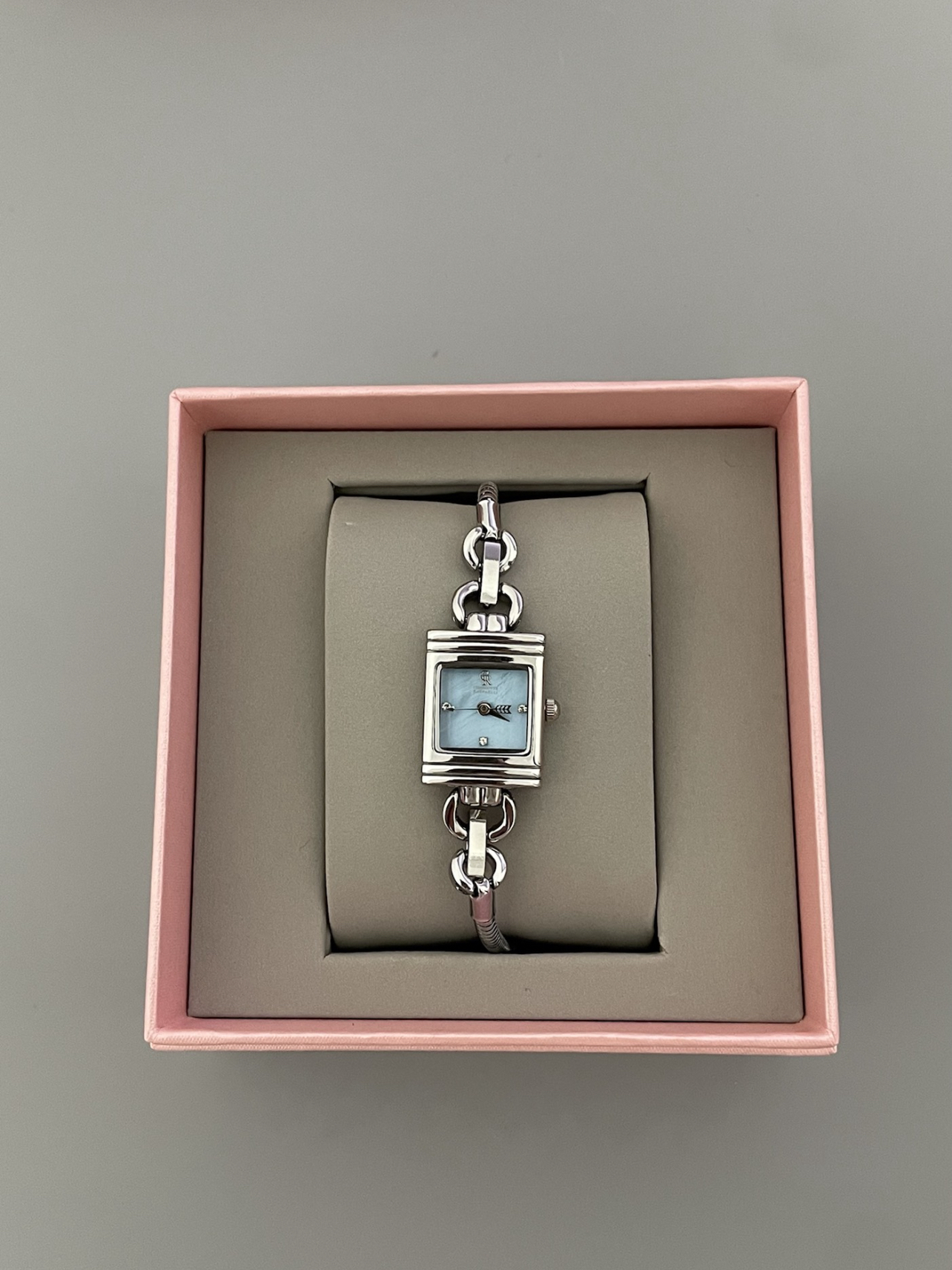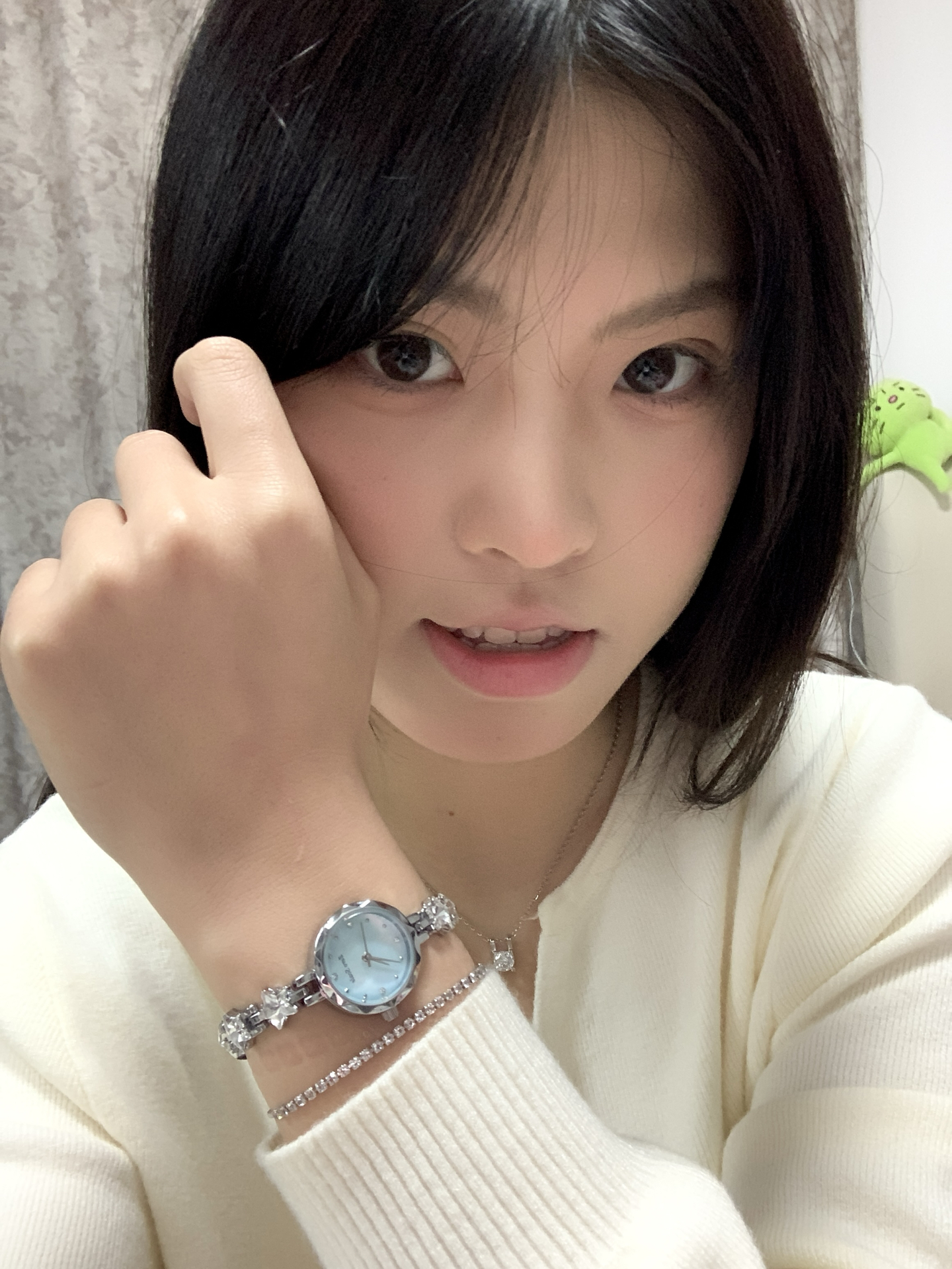 送女朋友的生日礼物,女朋友感动到哭了~银色的表带十蓝色的表盘配色真的很piu亮~ 女朋友佩戴上手很漂亮显得手很纤细表盘奶呼呼的蓝色很像海洋~ 设计感优雅大方适合各种场合佩戴怎么搭都很好看哦~