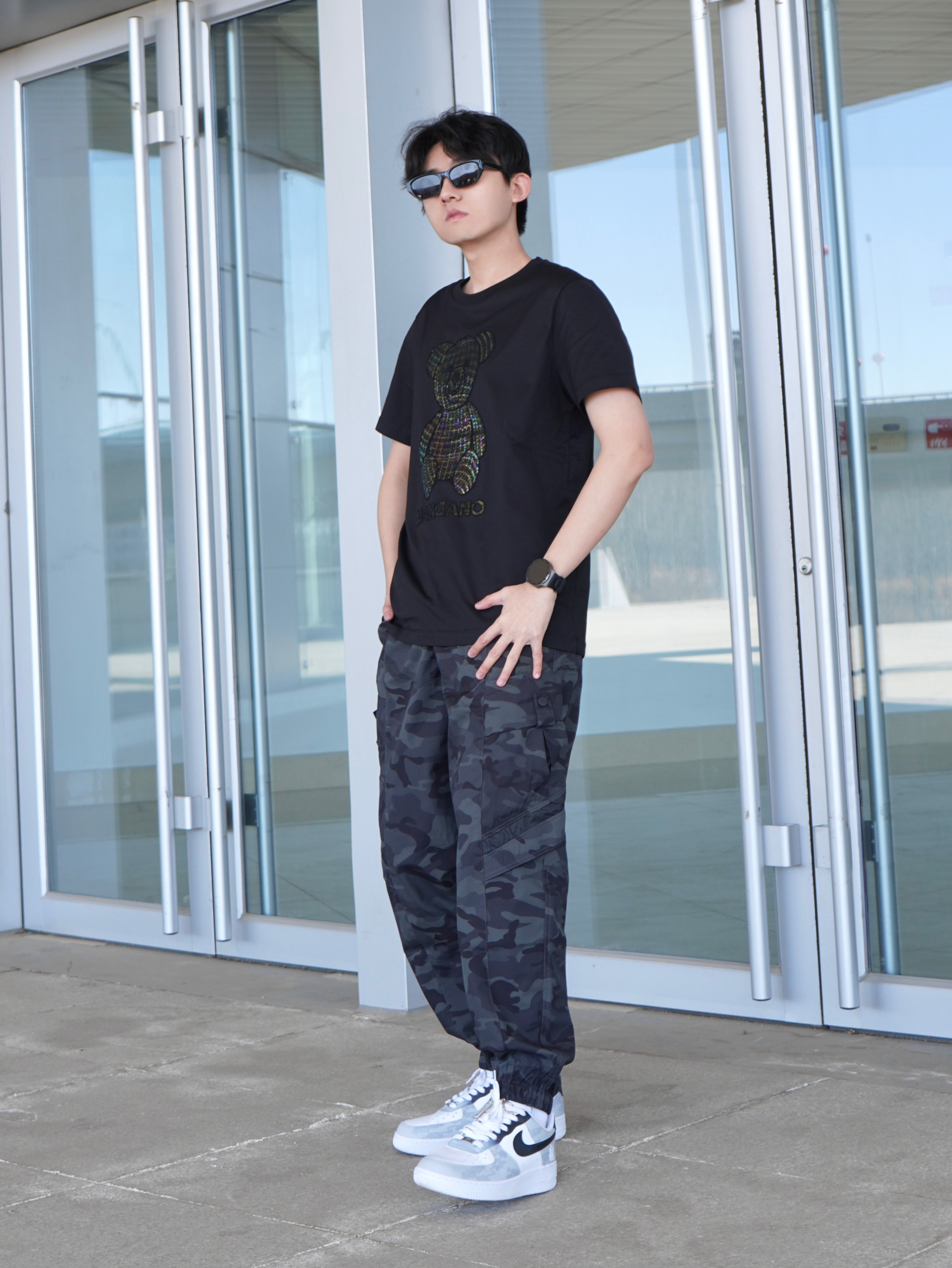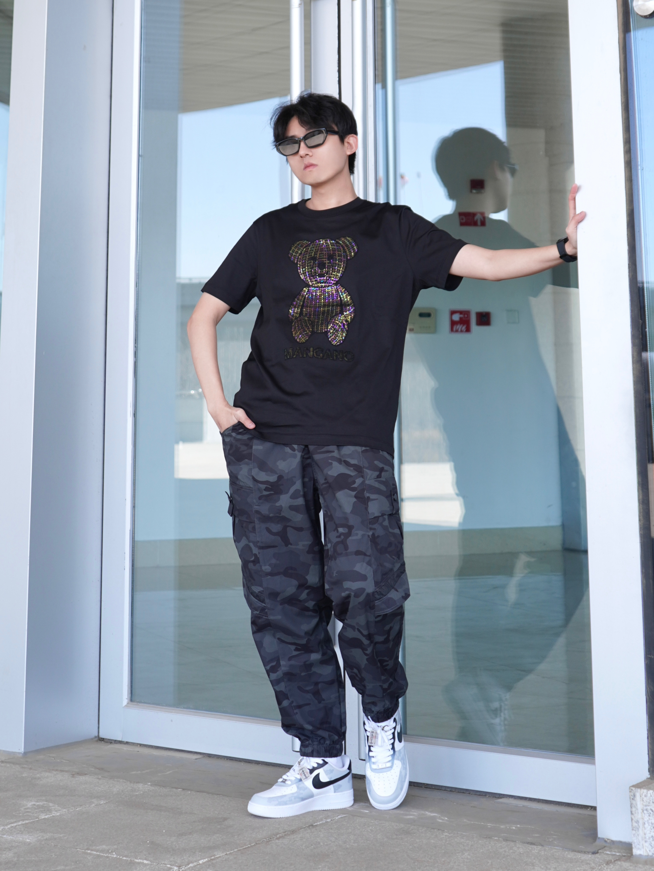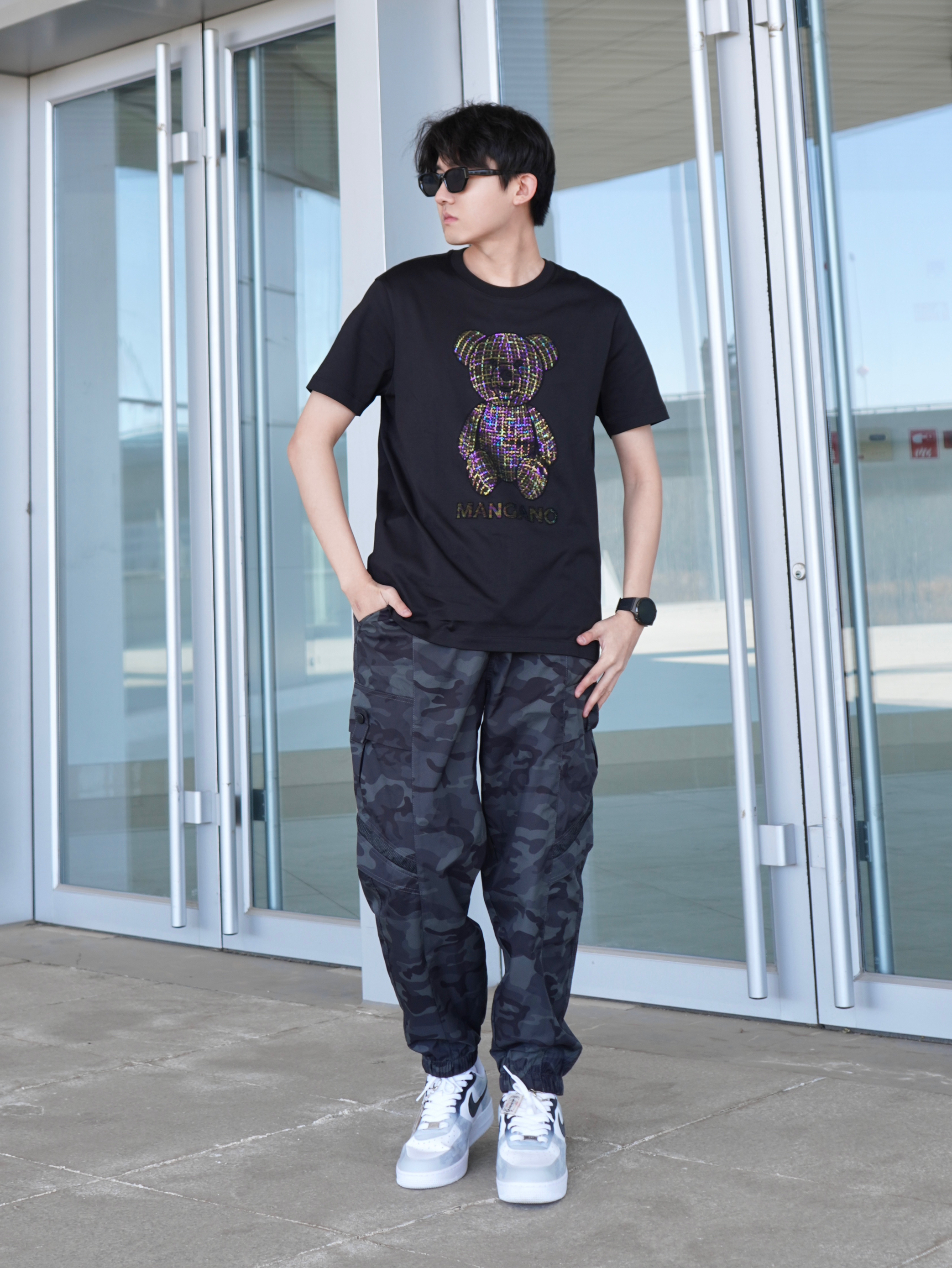 黑白配真的能提升高级感🖤🤍 T恤是来自MANGANO家的小熊满钻图案阳光下很闪 面烙柔软舒适 做工细腻亲肤 弹性也很不错 纯棉透气 - 再搭配一双定制版AF1 龙年限定配色和印花 上脚时尚脚感舒适~ - 参考:身高178cm/体重65kg 上衣:MANGANO 裤子:JEEP 鞋子:定制版AF1