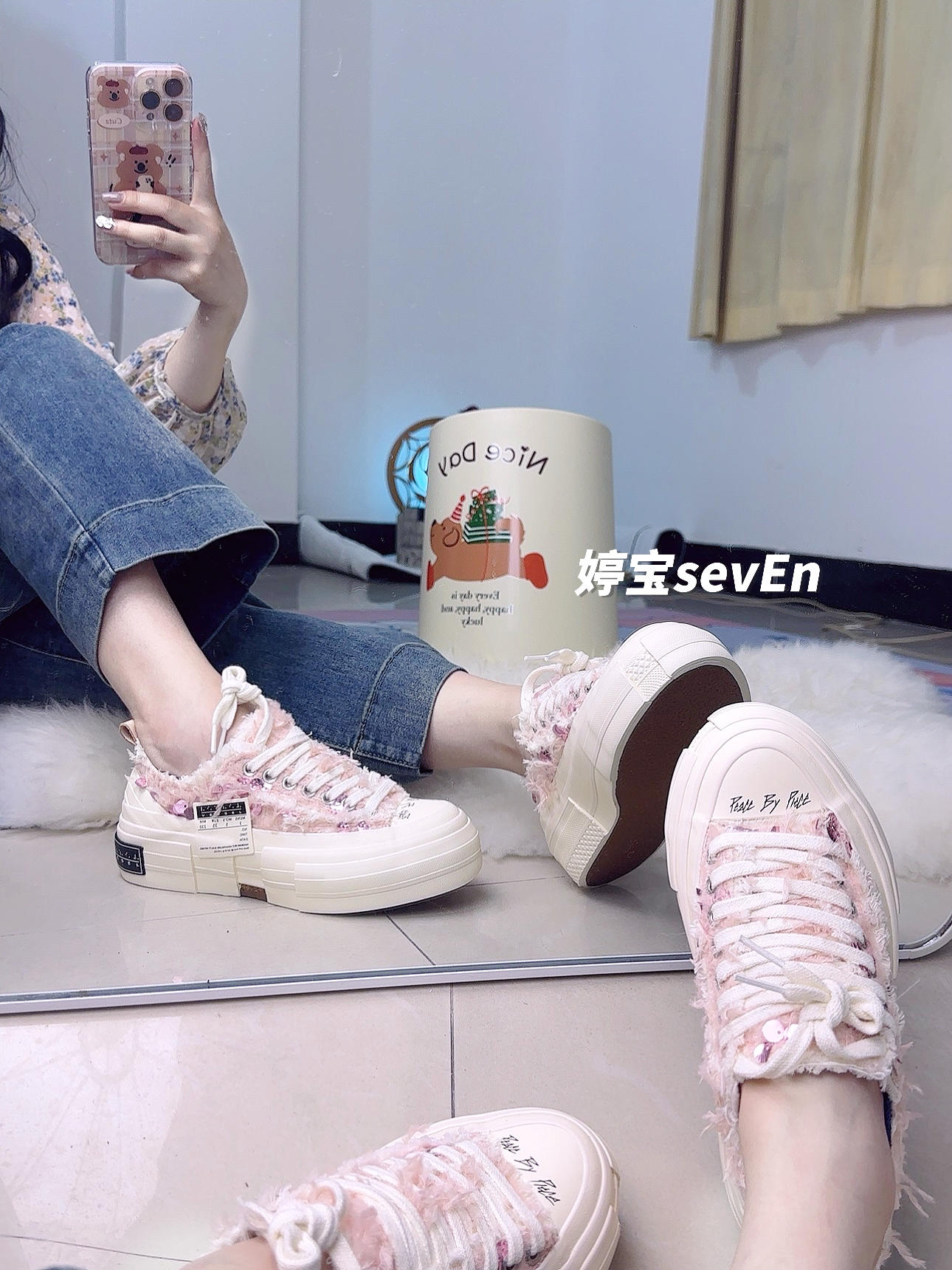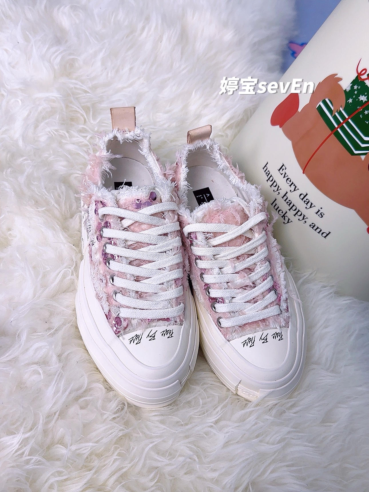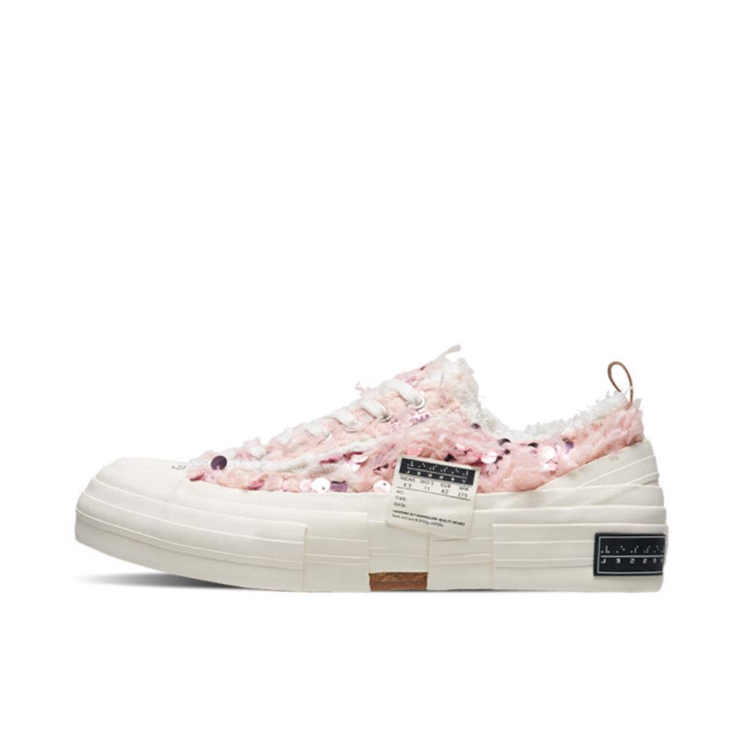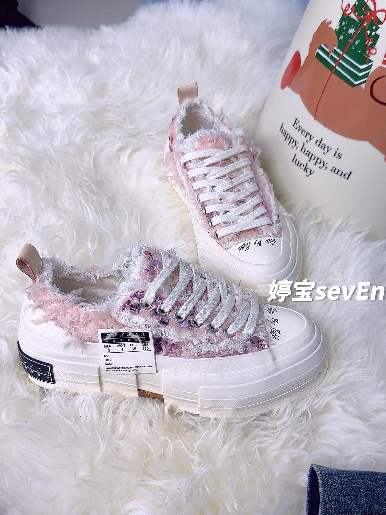 吴建豪的帆布鞋,人称乞丐鞋,但这款多了几分奢华感。鞋面采用粉色长毛绒面料打造,自带小香风轻奢高雅气质,拼接上复古做旧的白色帆布流苏,将复古与轻奢风格完美结合。 鞋舌双层设计的,这样的设计,相比于其他帆布鞋,这个鞋面柔软的多,不会有磨脚的问题。 xVESSEL帆布鞋除了看着破破烂烂的拼接鞋面设计外,鞋底造型也尤为独特,采取多层次的立体设计,看上去像是这里缺一块那里缺一块的感觉,整体是重工软木硫化鞋底...