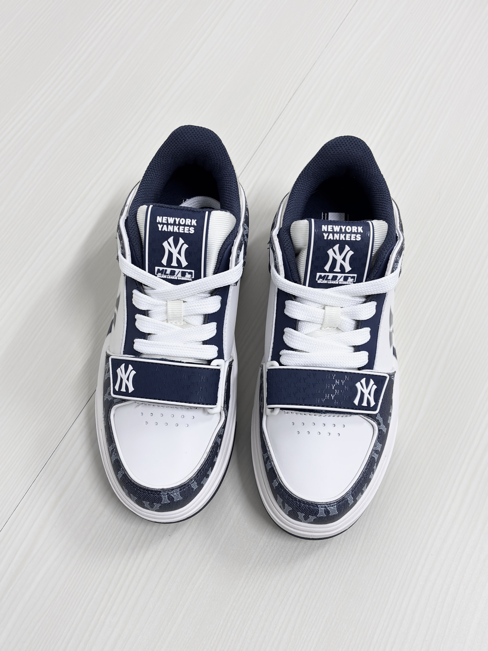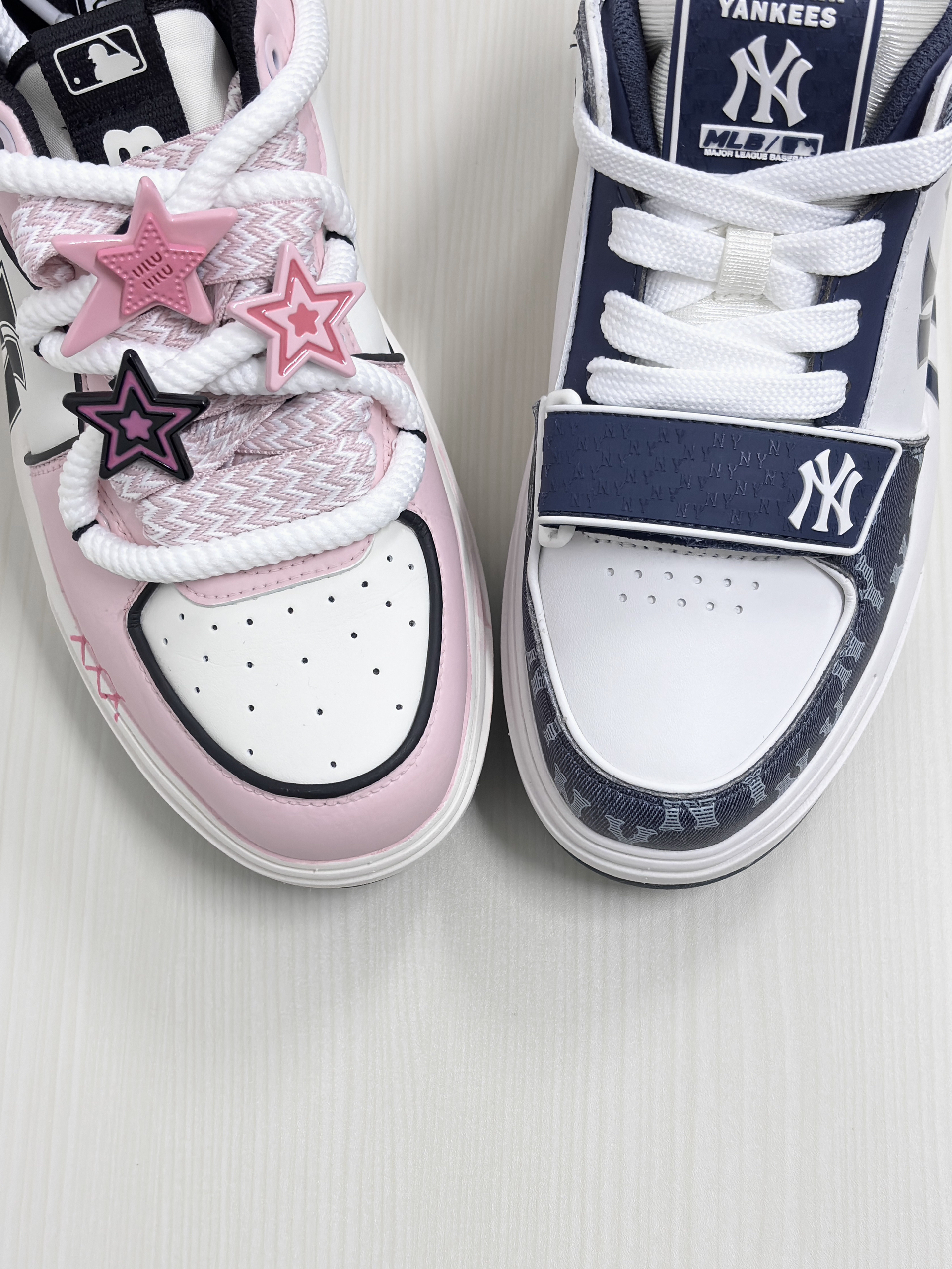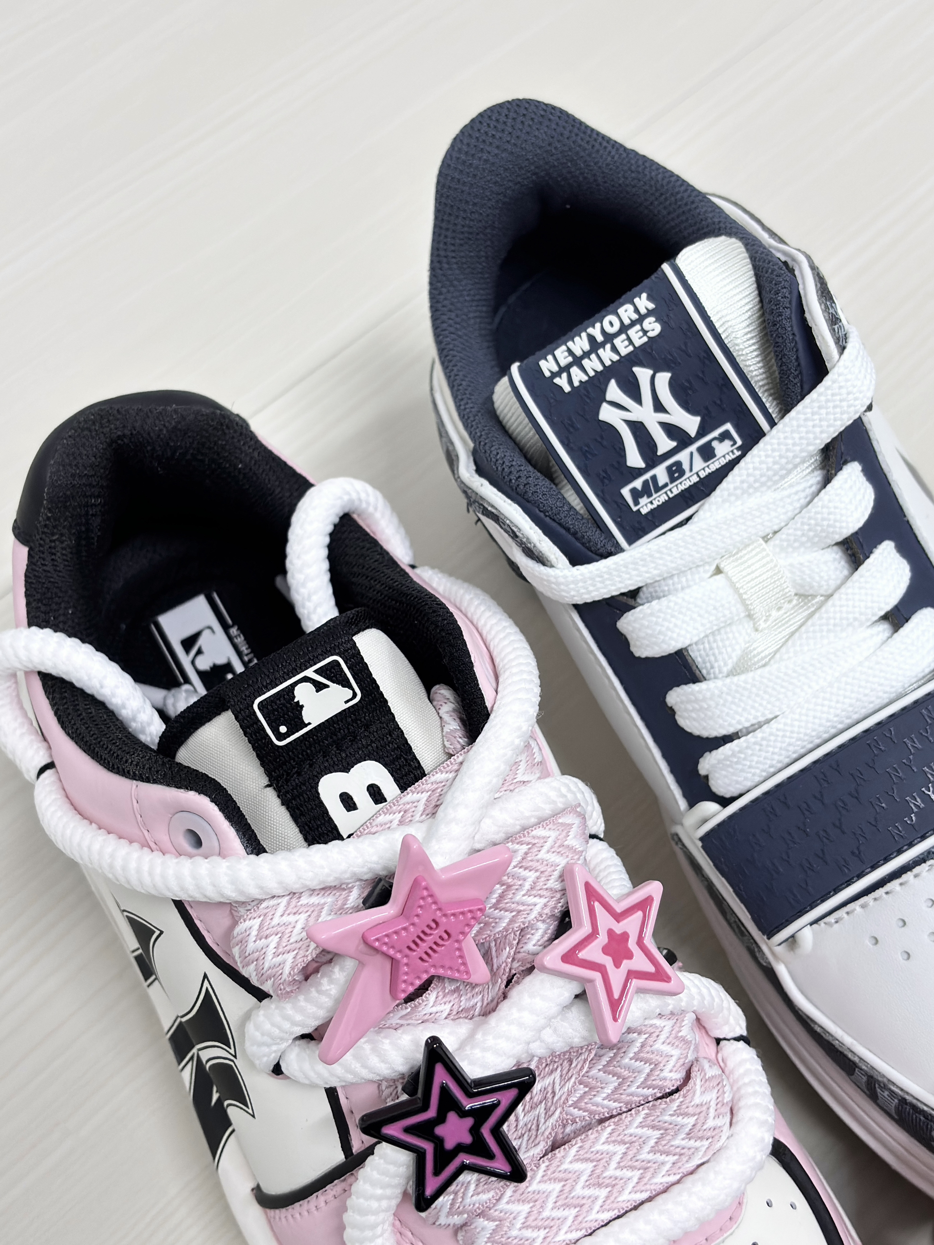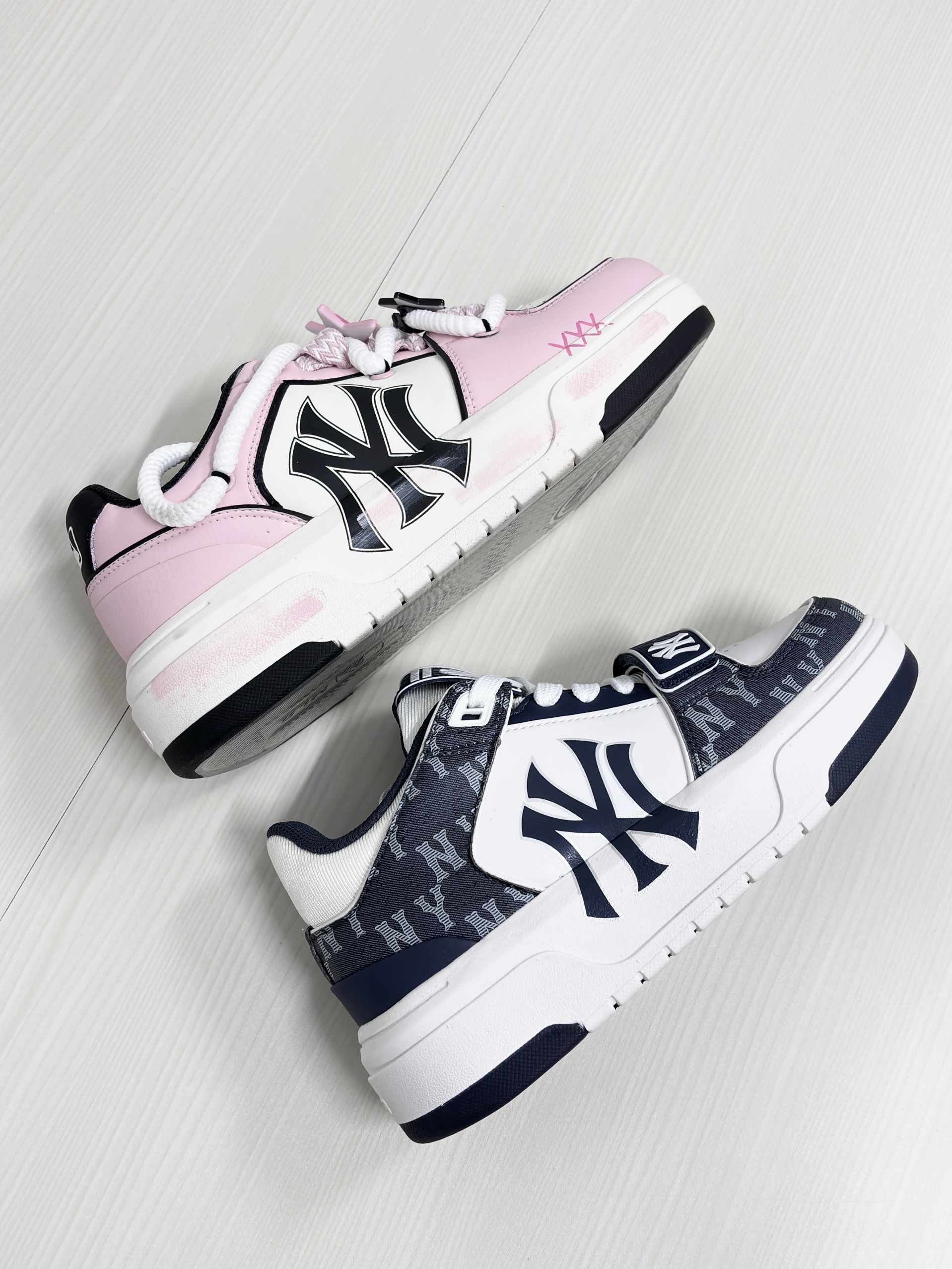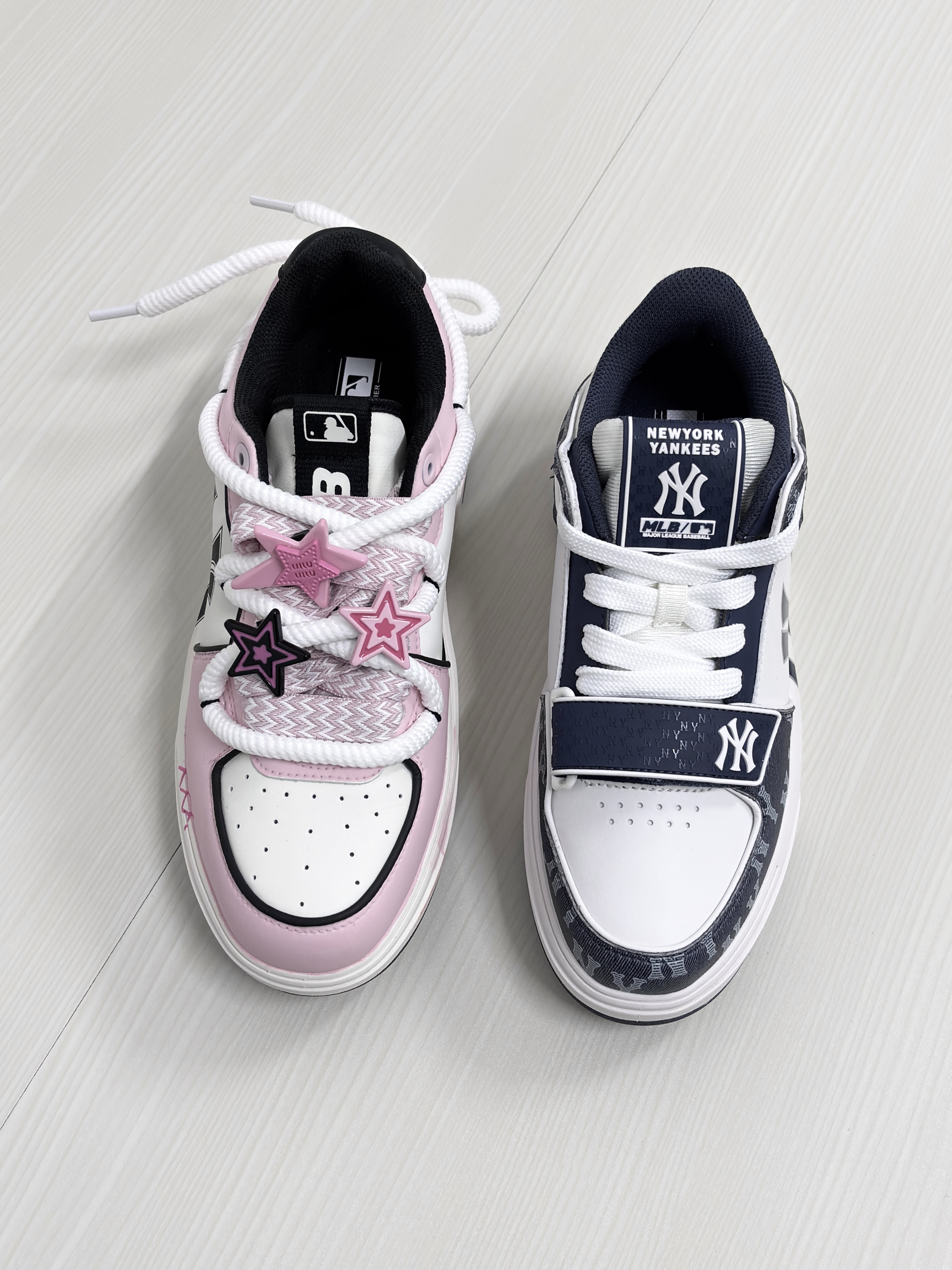 💁♂️:Hi~这里是大大纳mi~ 👟:MLB纽约洋基队 定制款粉色甜心 这双是用了白粉的💞配色! 加上鞋帯处的★挂件装饰 可爱又少女心!真的有被甜到! 👟:MLB纽约洋基队 复古老花海军蓝 这双采用了z海军蓝+白色! 大面积'NY'老花字母点缀魔术贴设计 整体复古又百搭! 所以,大家更喜欢哪双一些呢?