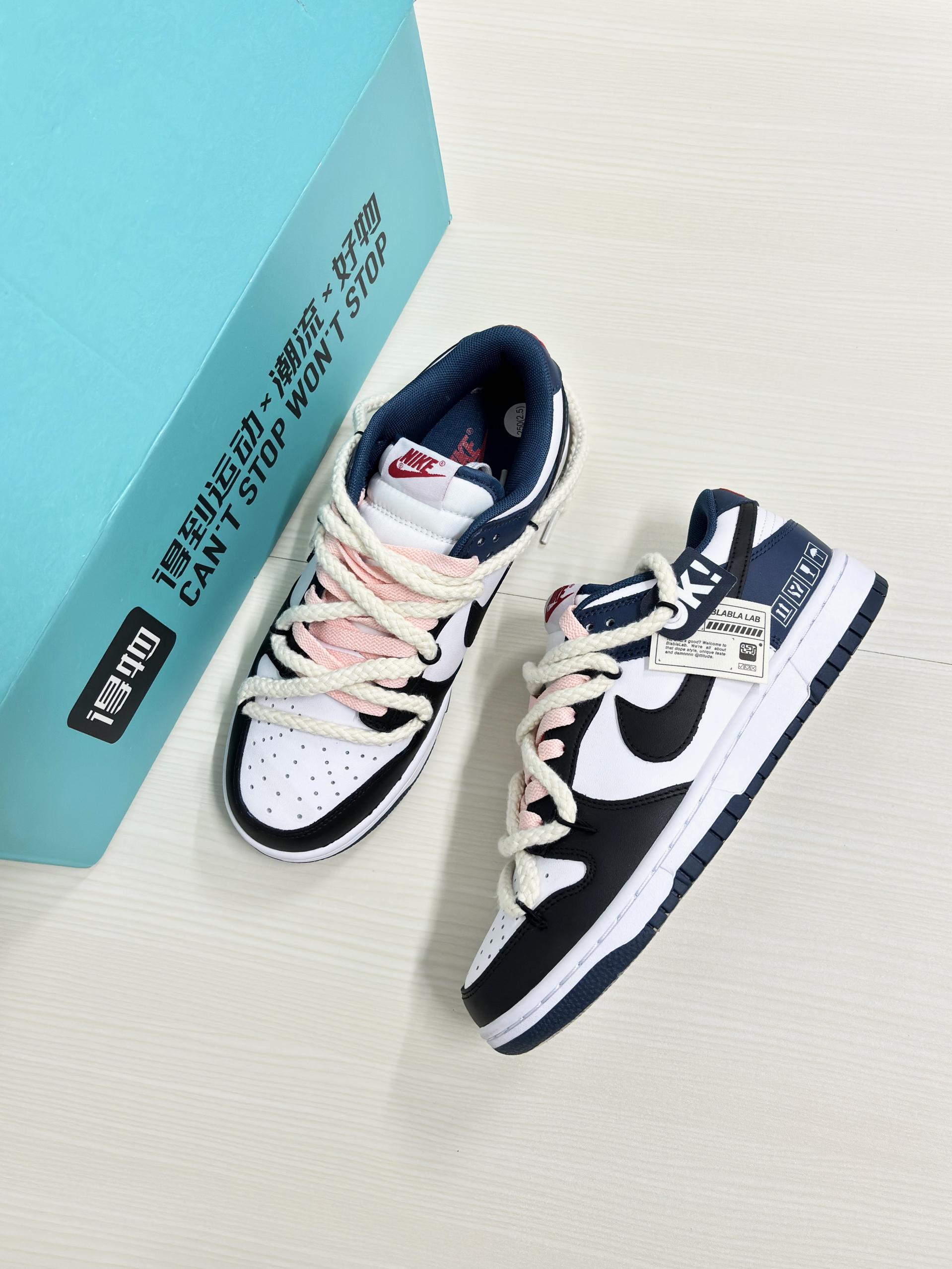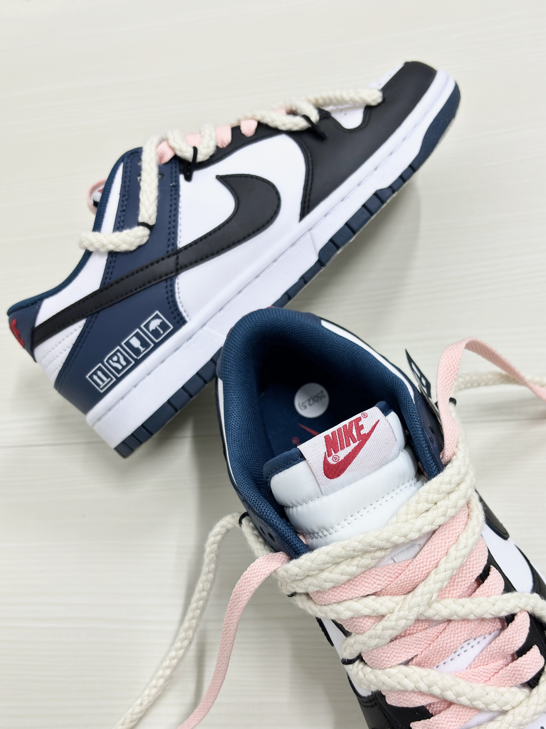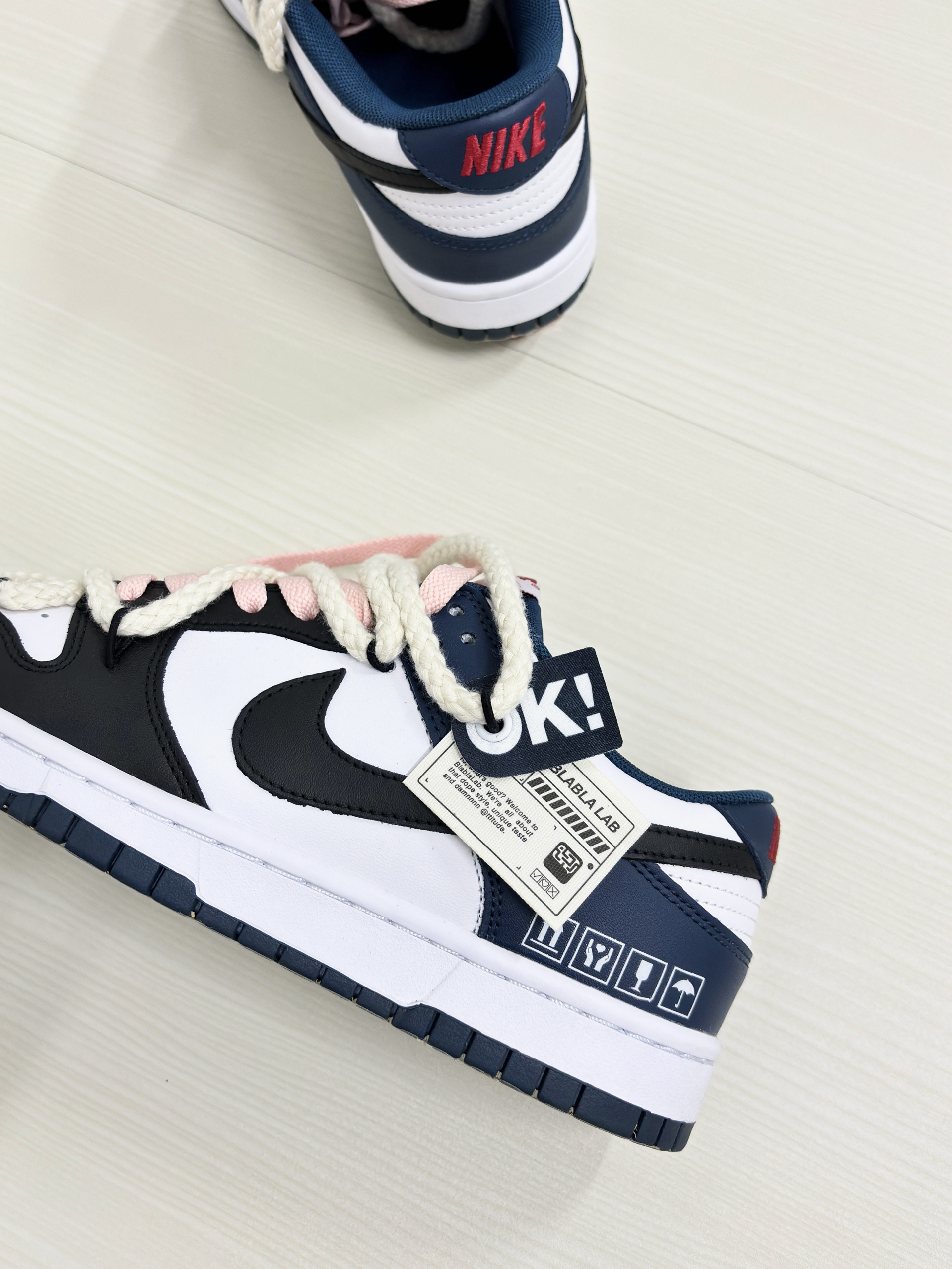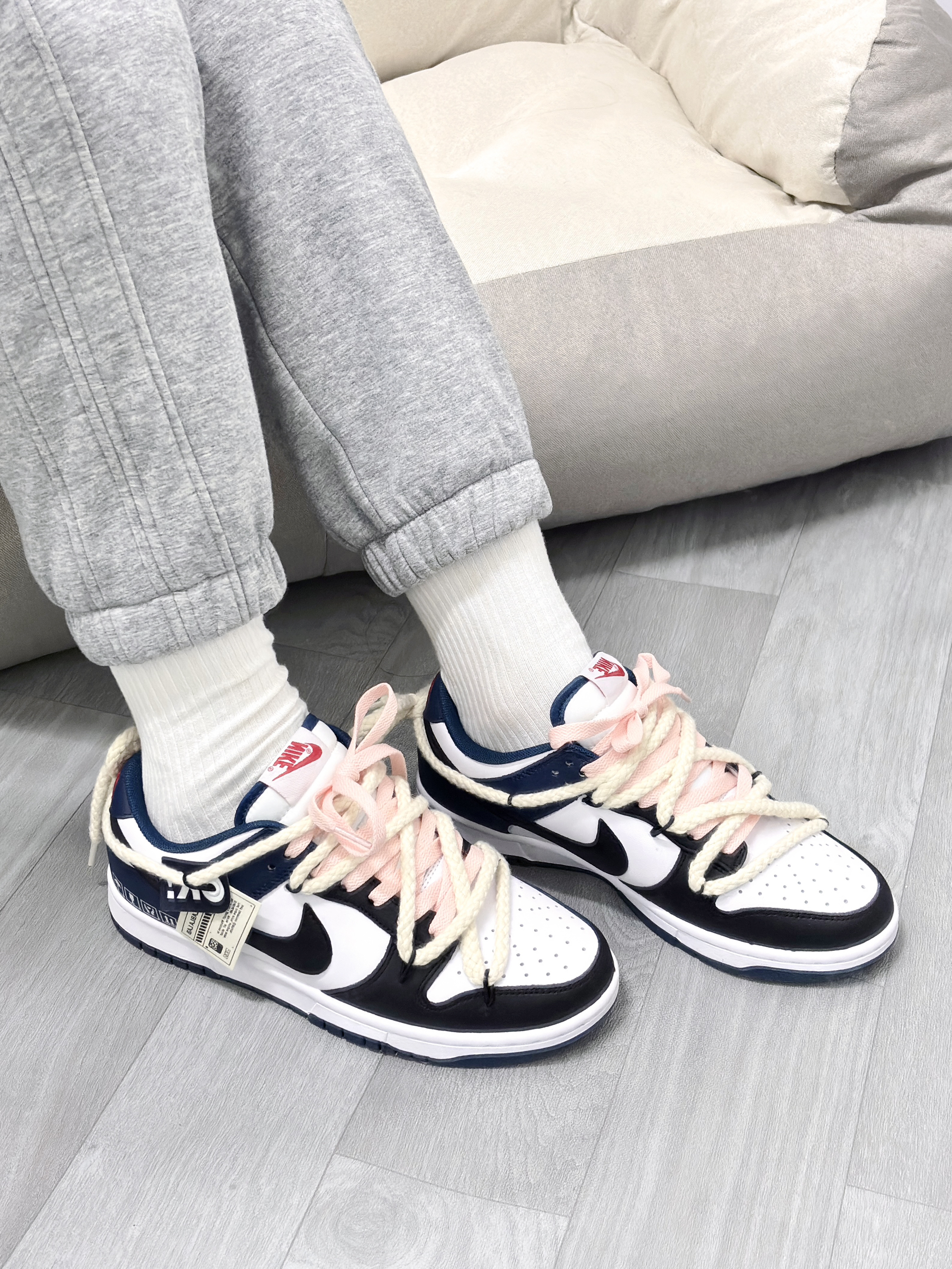 💁♂️:Hi~ 这里是大大纳mi ~ 👟:Nike Dunk Low定制黑曜石高街 板鞋 原鞋就是耐看的白色+海军蓝💤 这双把鞋头和swoosh定制成曜石黑 质感方面提升了不少,属于是锦上添花! 另外白粉双鞋带、图标及涂鸦装饰 个性又突出层次感,妥妥高街风 经典的Dunk版型不挑衣服 简单搭休闲裤、卫裤都很好看~ 尺码不偏码✅正常选择就可以!