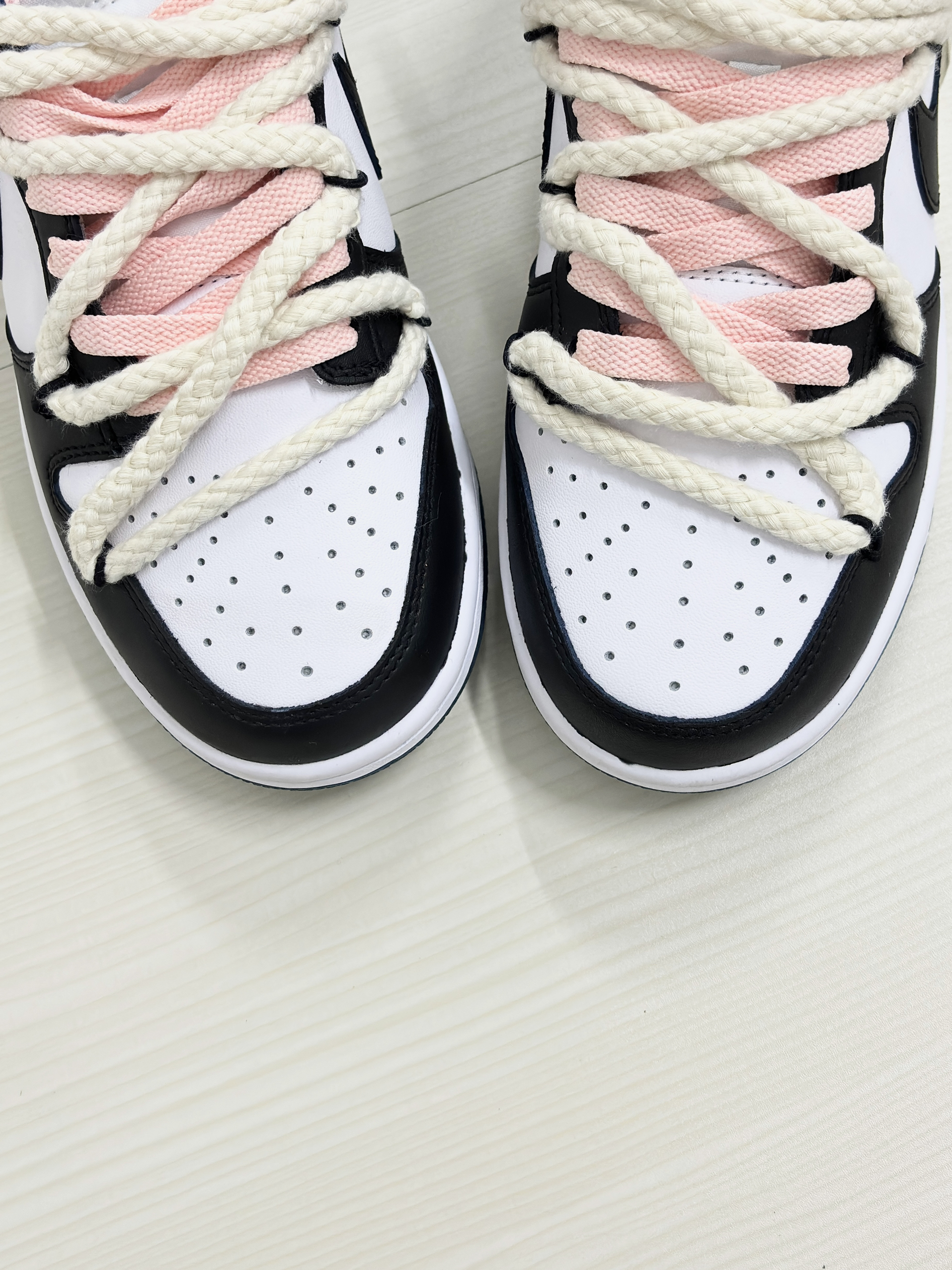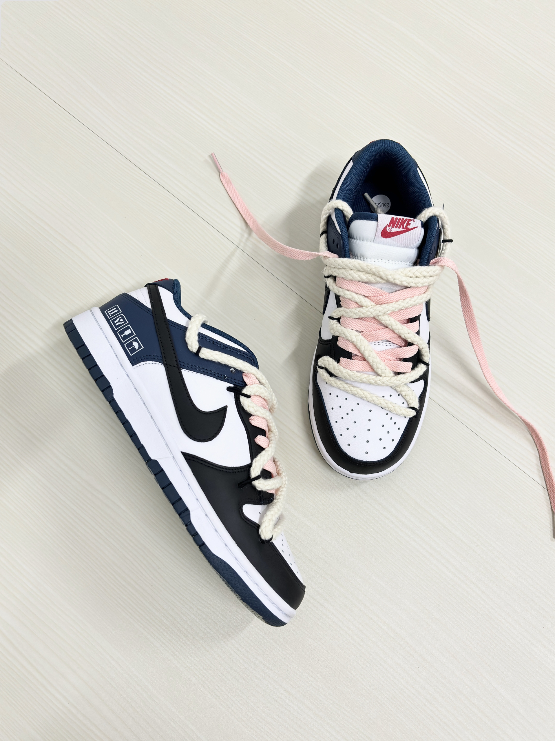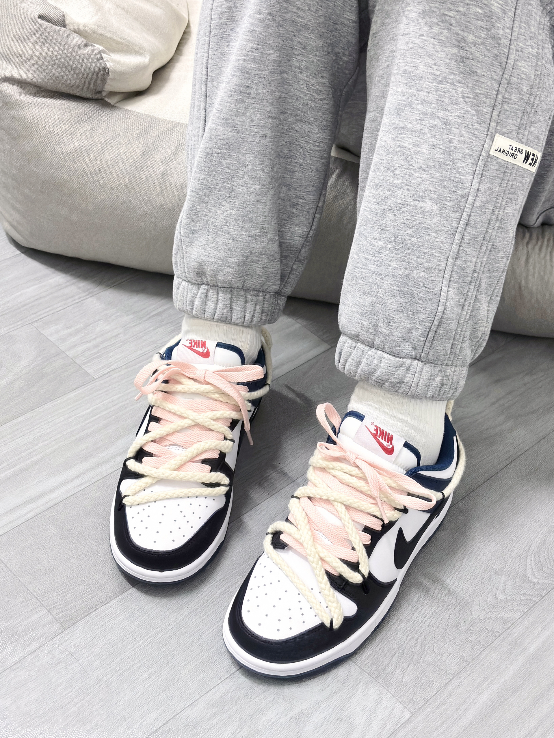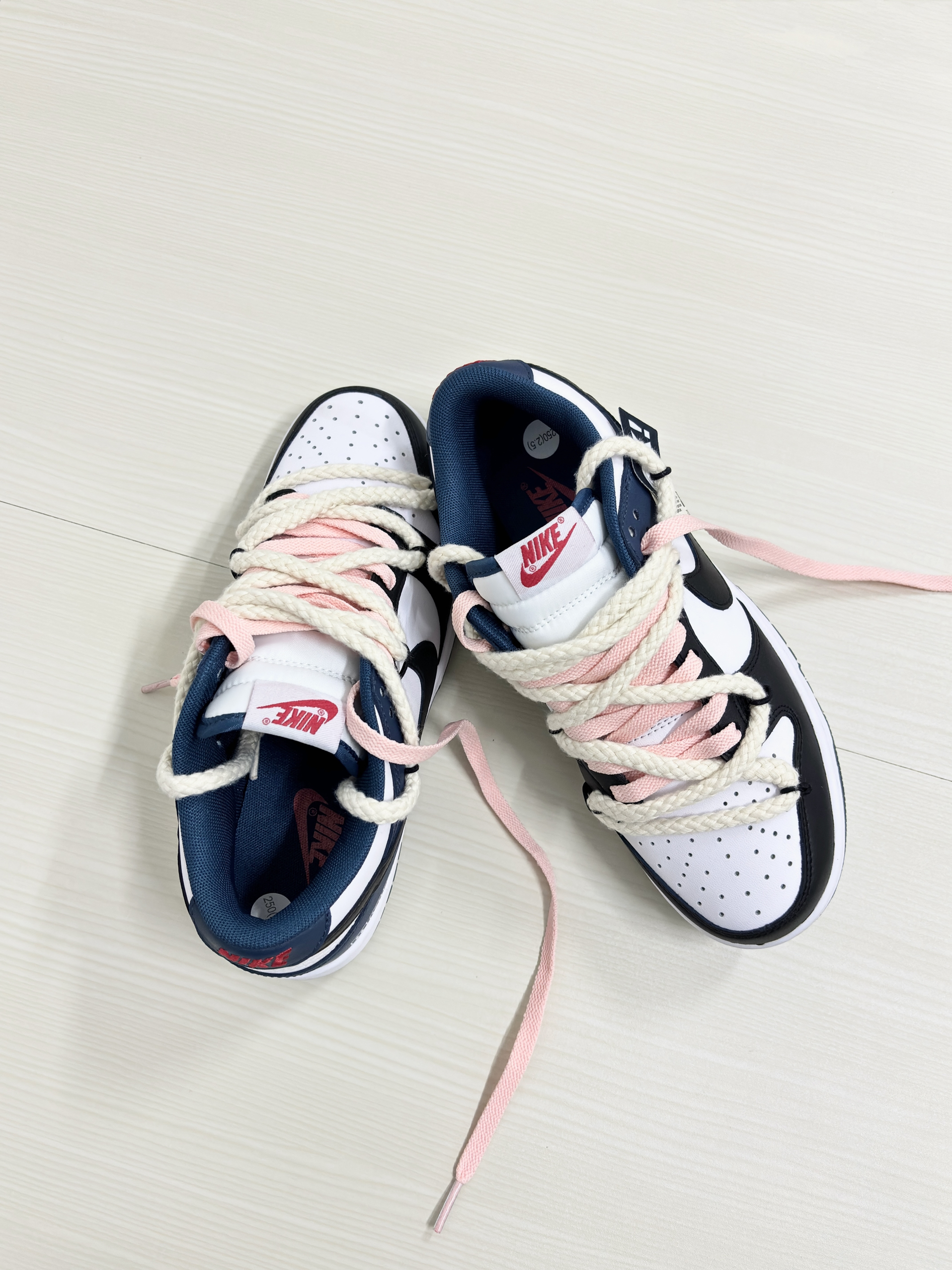 💁♂️:Hi~ 这里是大大纳mi ~ 👟:Nike Dunk Low定制黑曜石高街 板鞋 原鞋就是耐看的白色+海军蓝💤 这双把鞋头和swoosh定制成曜石黑 质感方面提升了不少,属于是锦上添花! 另外白粉双鞋带、图标及涂鸦装饰 个性又突出层次感,妥妥高街风 经典的Dunk版型不挑衣服 简单搭休闲裤、卫裤都很好看~ 尺码不偏码✅正常选择就可以!
