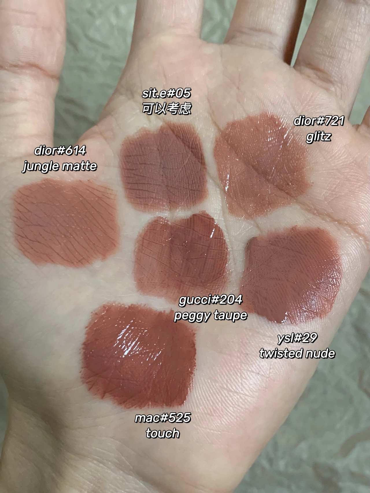 从上到下依次 1⃣️DIOR 614 JUNGLE MATTE 2⃣️SIT.E 05 I"LL THINK 3⃣️gucci 204 PEGGY TAUPE 4⃣️ysl 29 TWISTED NUDE 5⃣️dior 721 GLITZ 6⃣️mac 525 TOUCH