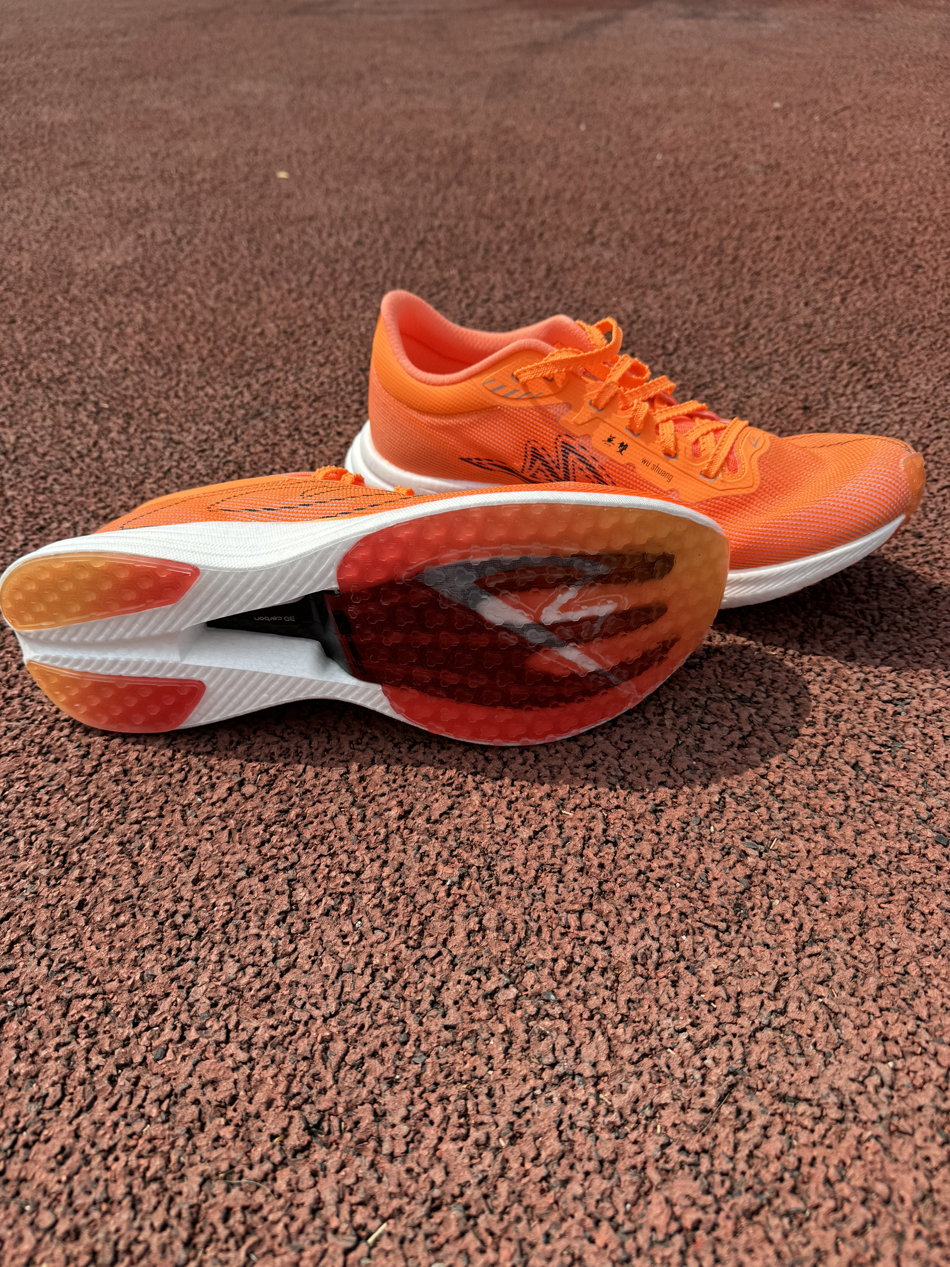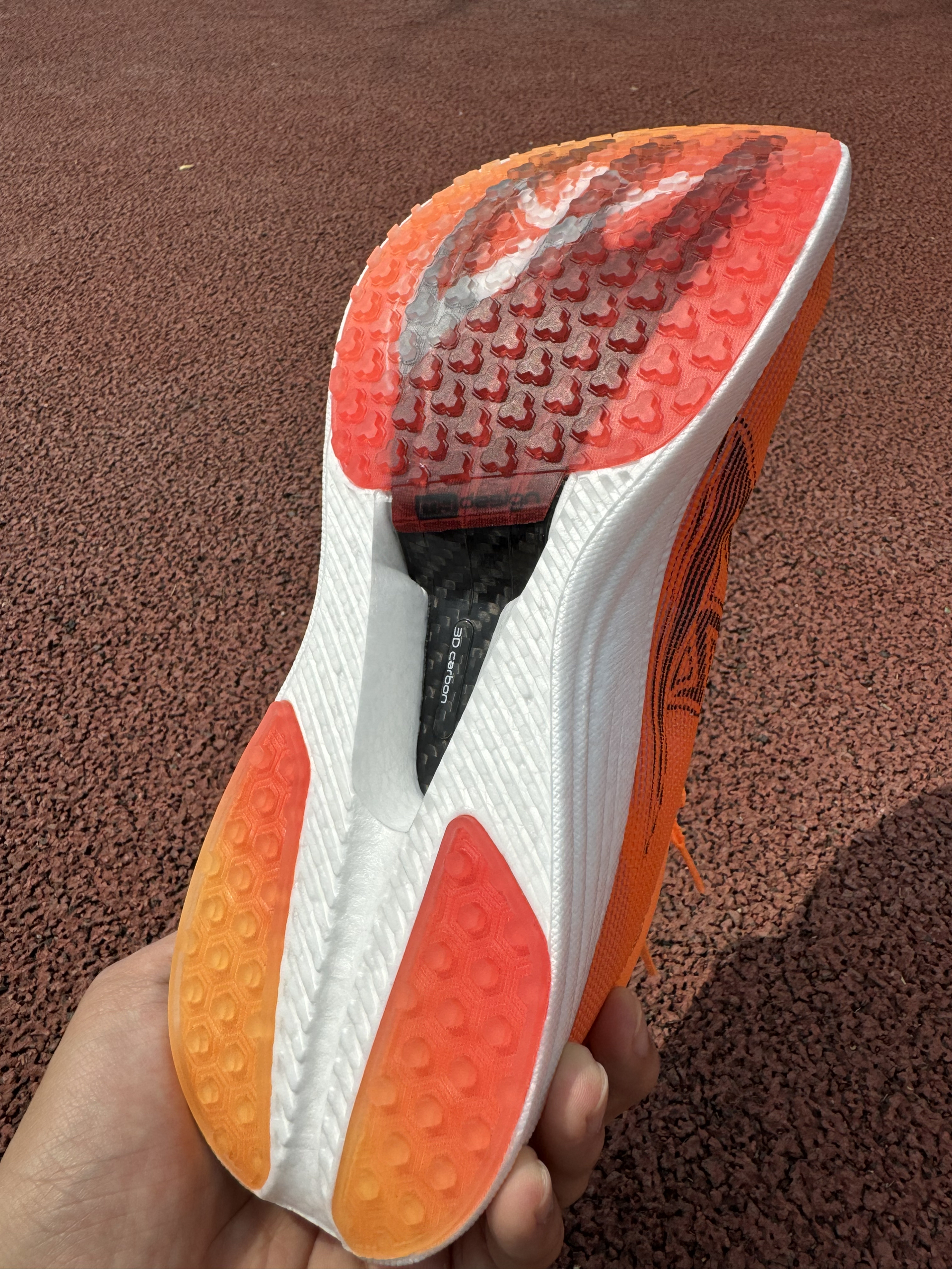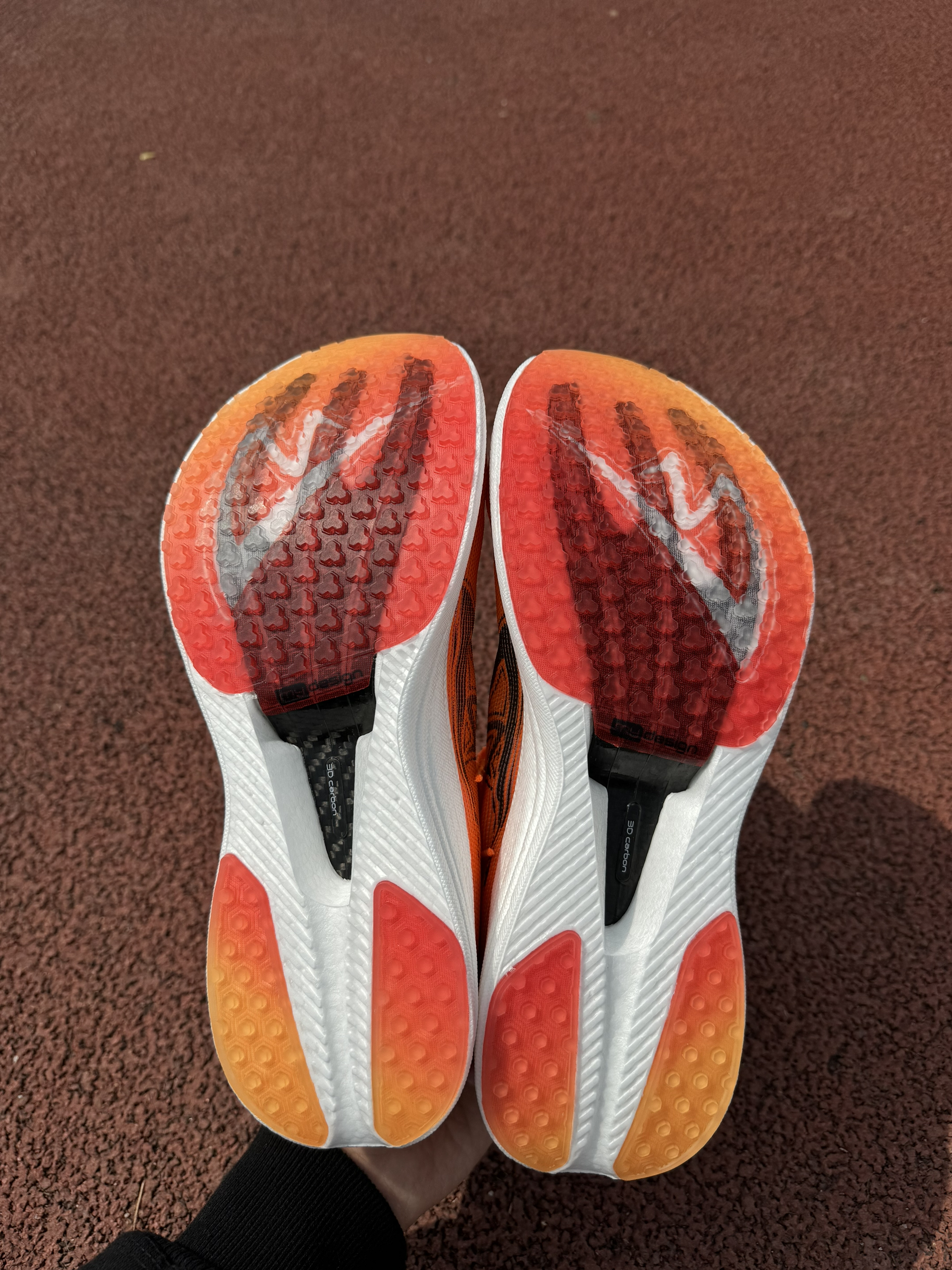 咱们这期给大家分享的是来自音速猫的无双x1 整体是鲜橙的配色在阳光下也是格外的好看 配置方面中底是三厘米厚的脂肪族发泡用料很扎实 鞋底三叉异构碳板推进感很足 如果大家喜欢的话大家可以入手尝试一下
