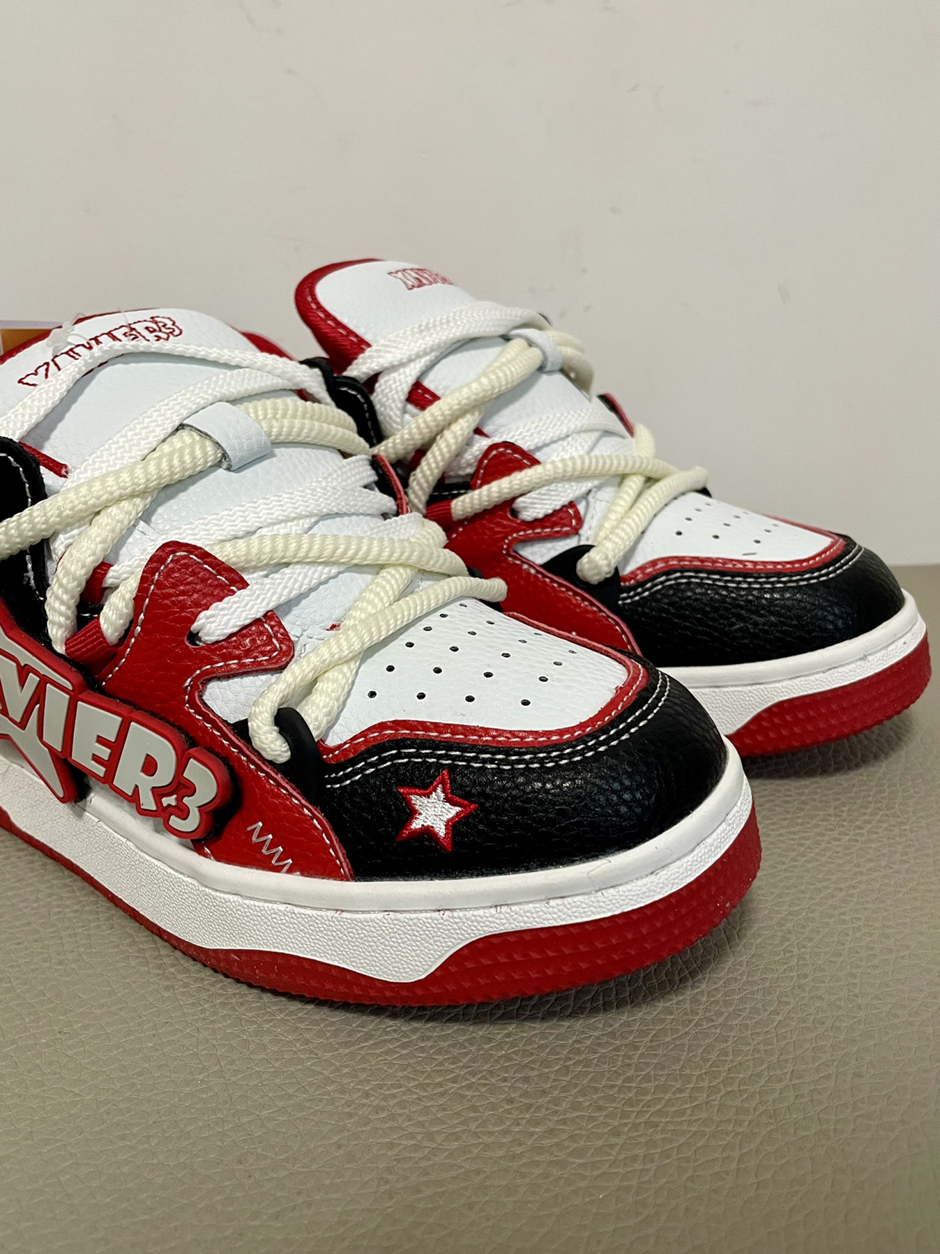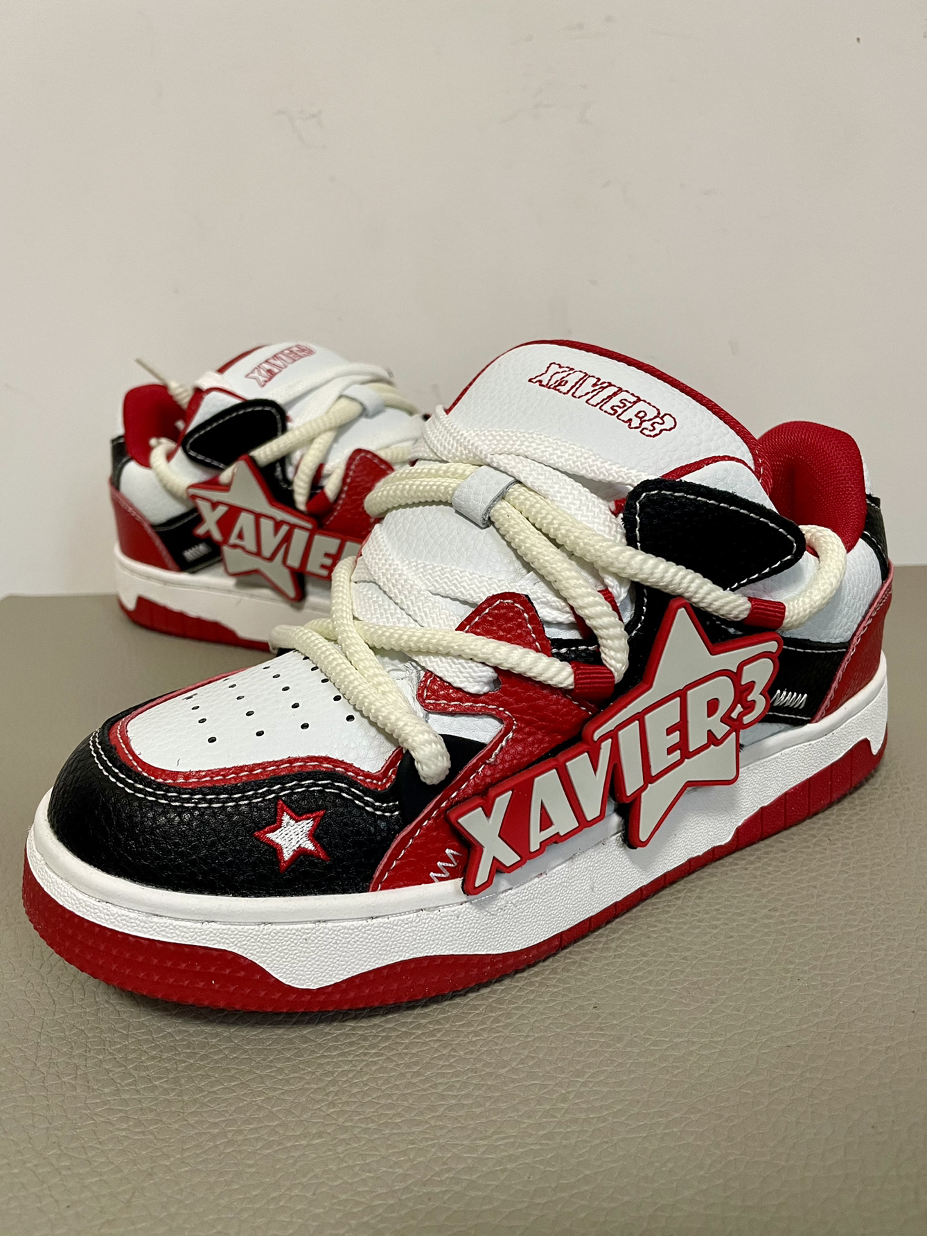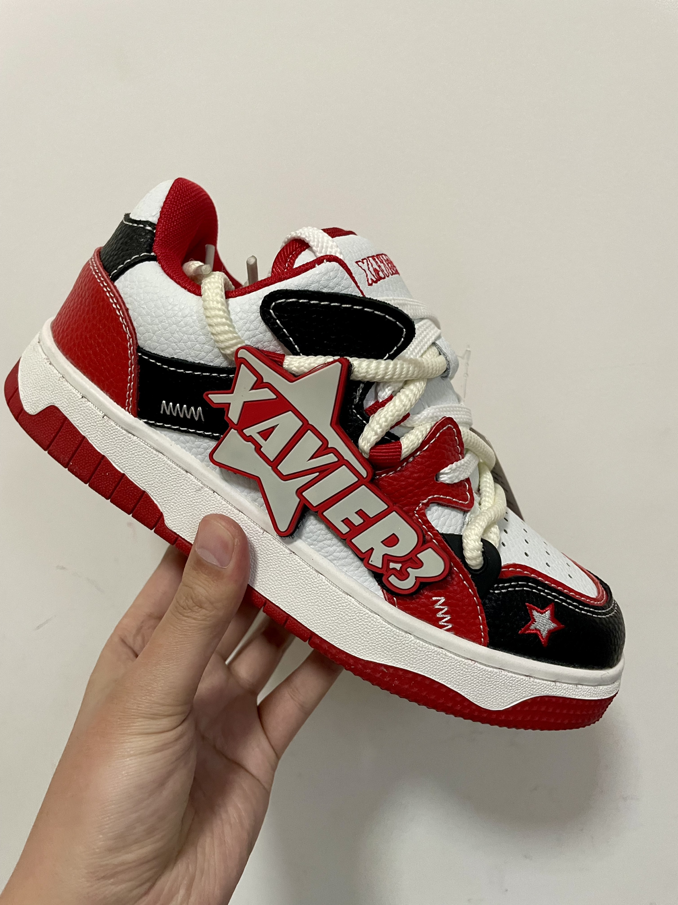 品牌:Xavier3 风格:板鞋 颜色:黑白红色 - 这双鞋是女神节送我女友的礼物,黑白红配色特别青春,女友平常会搭配浅色牛仔裤或者休闲裤,上衣可以考虑同色系搭配挺亮眼 - 鞋子穿着尺码正常,后跟处也不磨脚,我都忍不住想再入一双凑成情侣款了,她反应鞋底防滑不错,穿一天上班回来也不臭脚