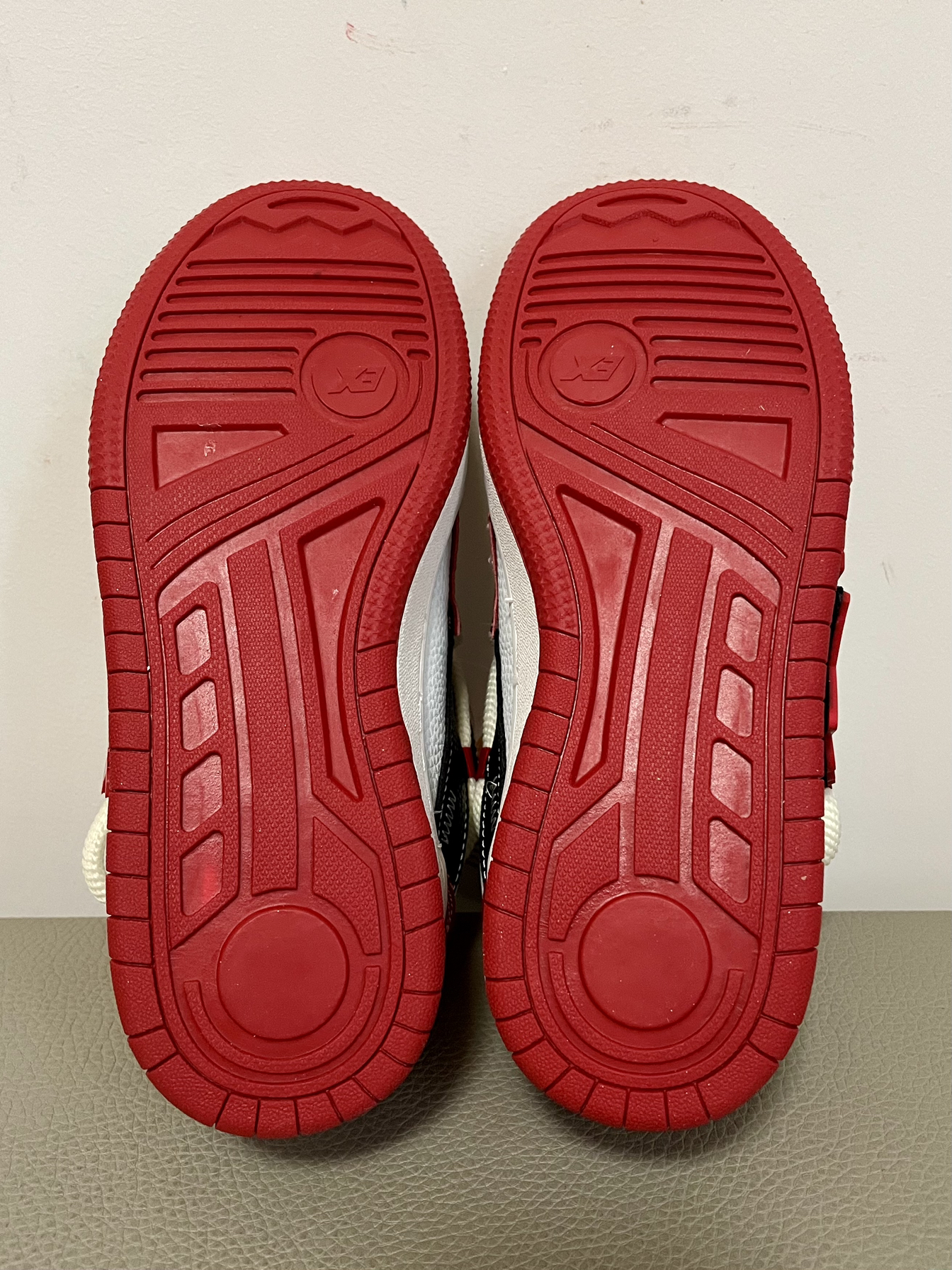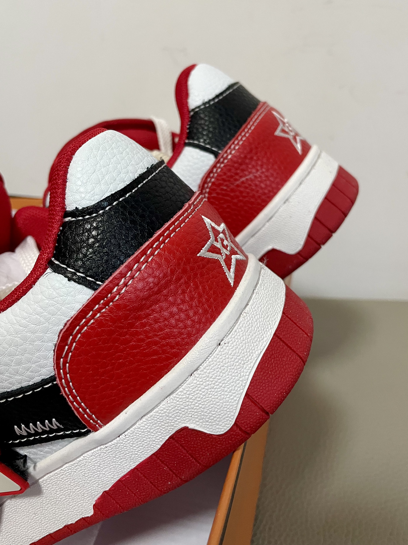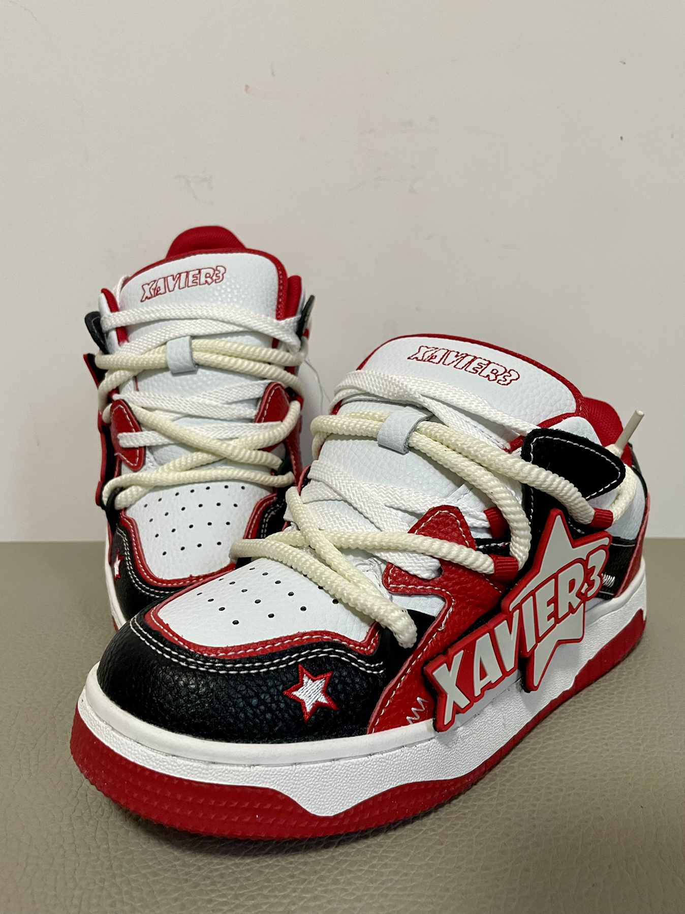 品牌:Xavier3 风格:板鞋 颜色:黑白红色 - 这双鞋是女神节送我女友的礼物,黑白红配色特别青春,女友平常会搭配浅色牛仔裤或者休闲裤,上衣可以考虑同色系搭配挺亮眼 - 鞋子穿着尺码正常,后跟处也不磨脚,我都忍不住想再入一双凑成情侣款了,她反应鞋底防滑不错,穿一天上班回来也不臭脚