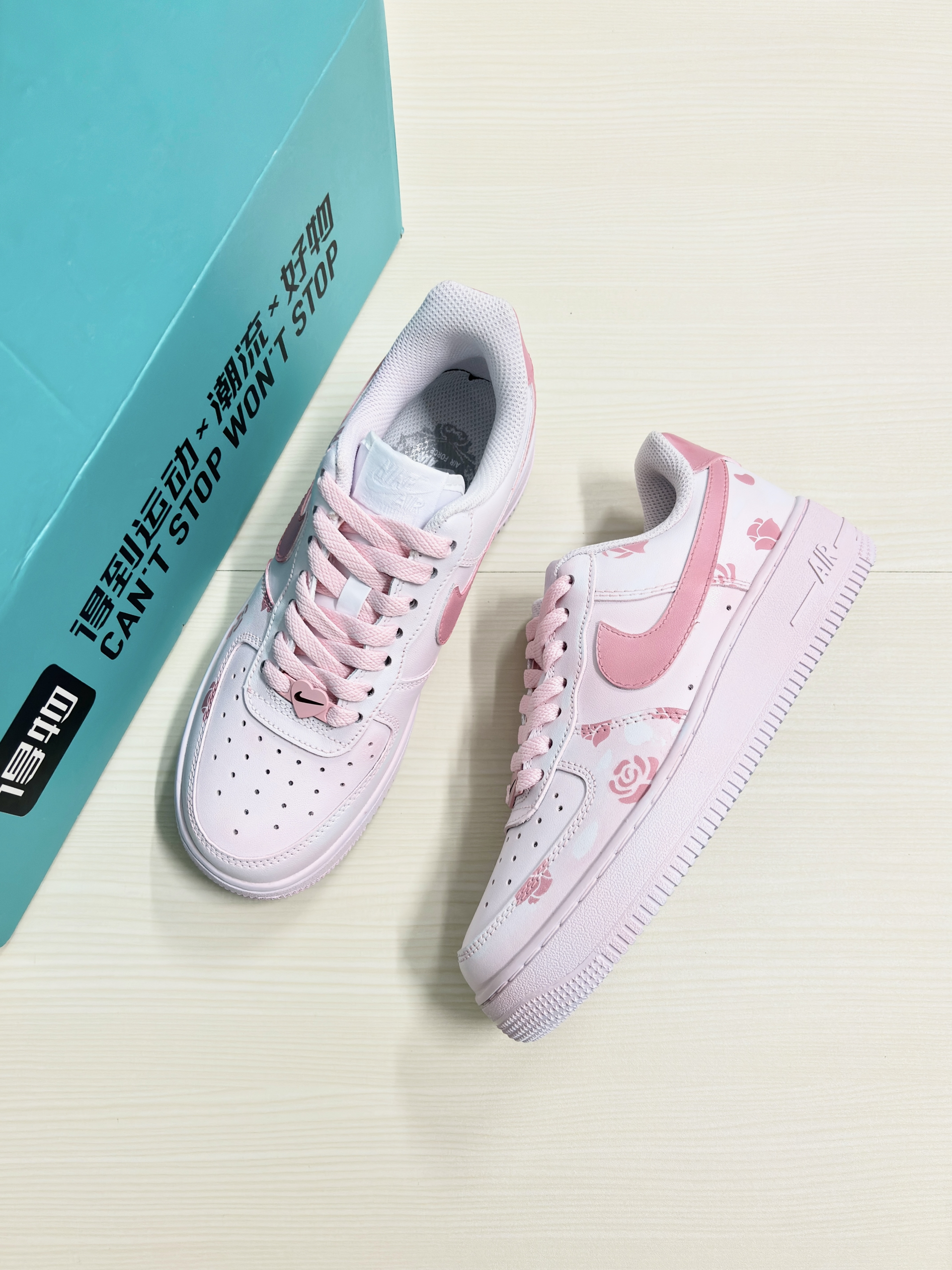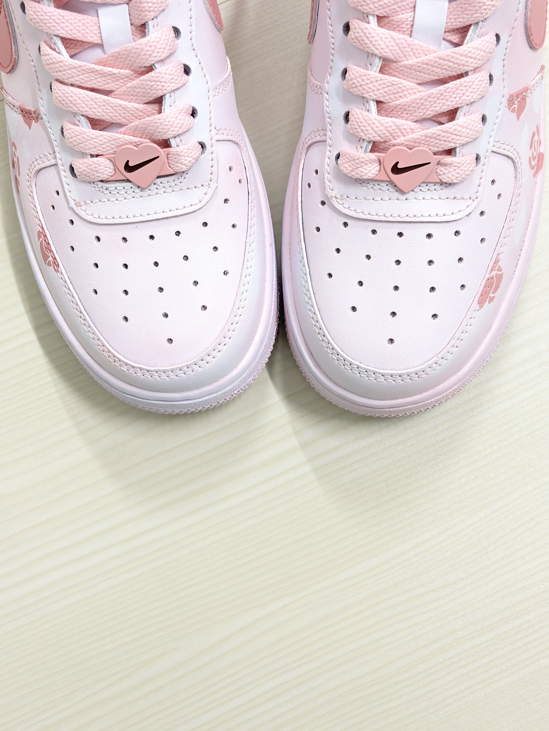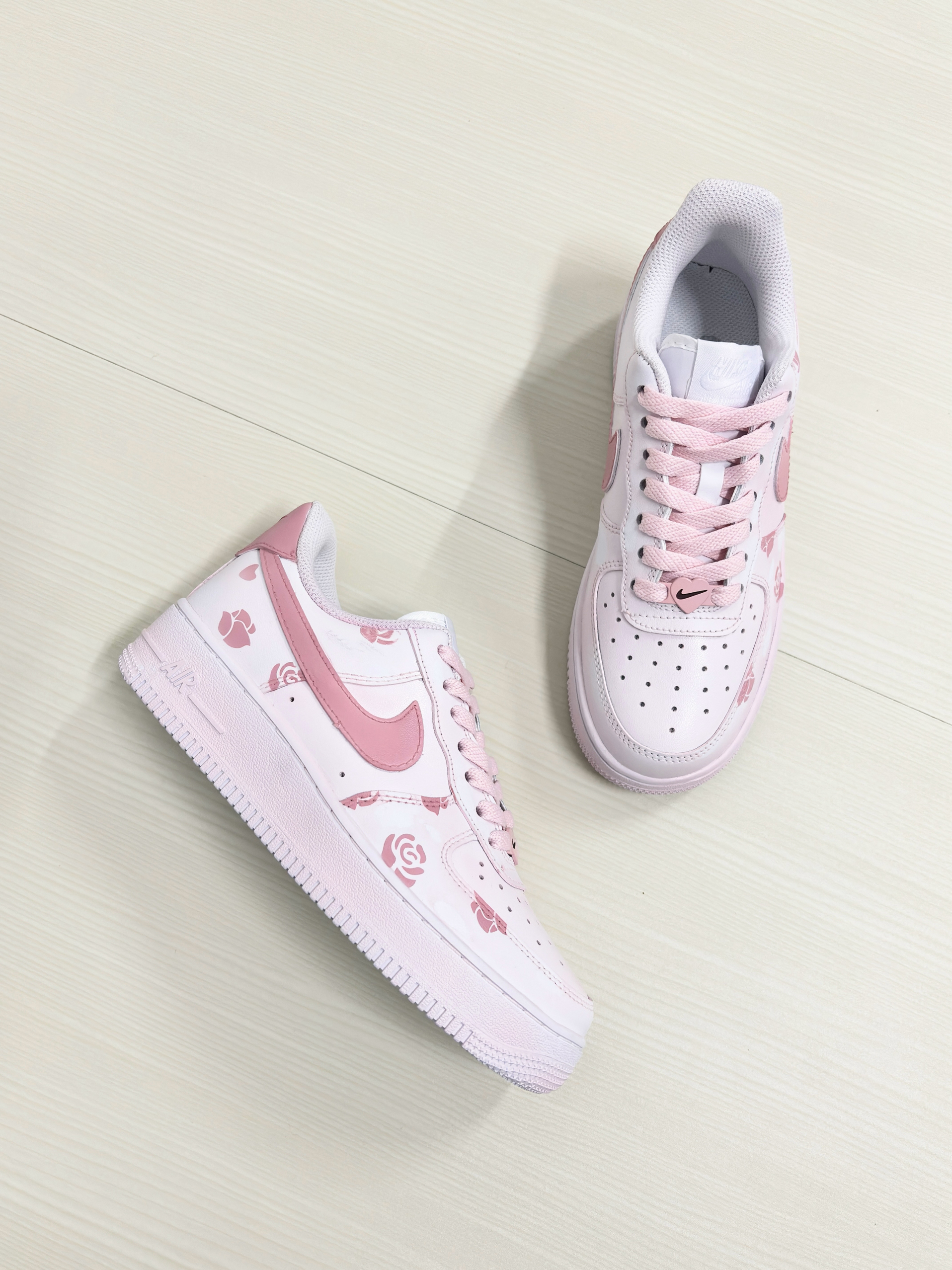 💁♂️:Hi~ 这里是大大纳mi~ 👟:Nike 春季限定粉玫瑰AF1板鞋 采用的经典纯白af1进行定制 鞋身用粉色玫瑰图案点缀! 鞋舌白色标识,粉色swoosh延伸后跟 清新甜美少女心,实物是真好看 厚底还能有不错的增高效果 日常穿休闲裤,长短裙都百搭 可以说夏天出门穿这双不会错! 尺码不偏码✅正常选择就可以~