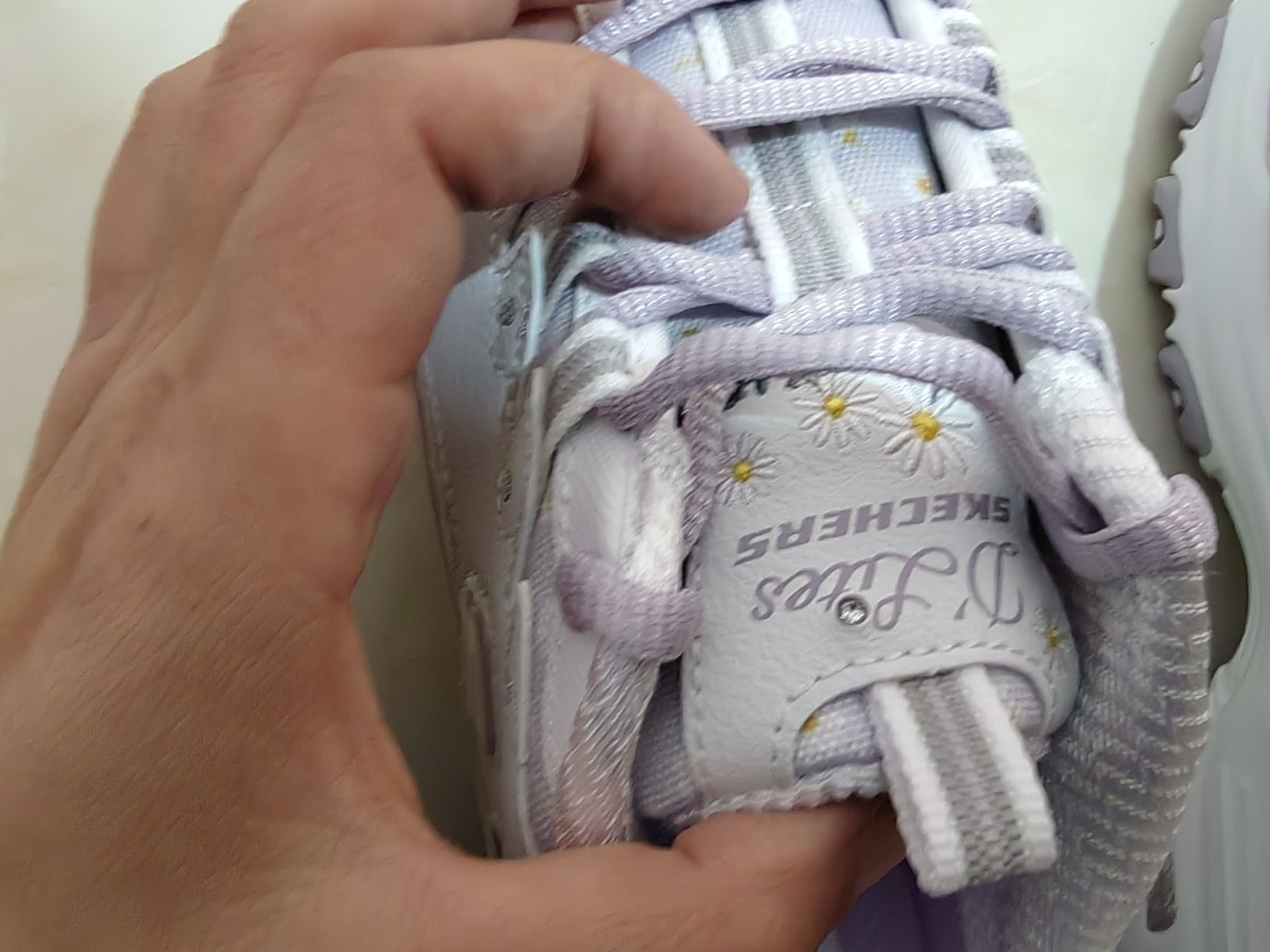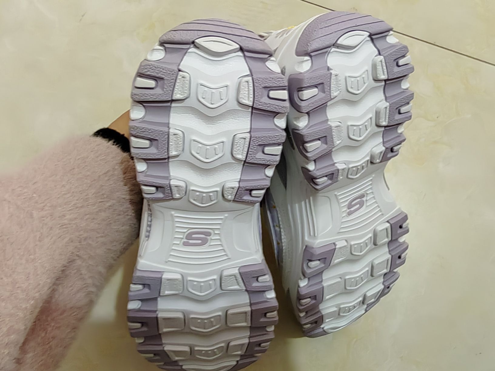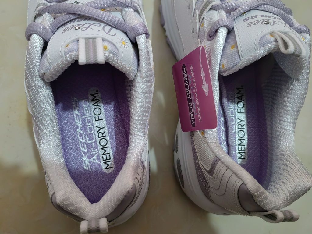 这款斯凯奇的女鞋颜色真的好漂亮,奶呼呼的, 把紫色配的不俗气也是很厉害啦,细节的小雏菊刺绣,鞋舌和后脚跟都有,鞋舌处还有一颗小闪钻,美美哒, 鞋底防滑做的也很好,满足日常所需,看起来胖乎乎的,但鞋子整体也不重,我正常穿38码,这款鞋37码稍有一点点顶脚,大半码就刚好啦,鞋子有点偏胖,胖脚仙女的福利哦