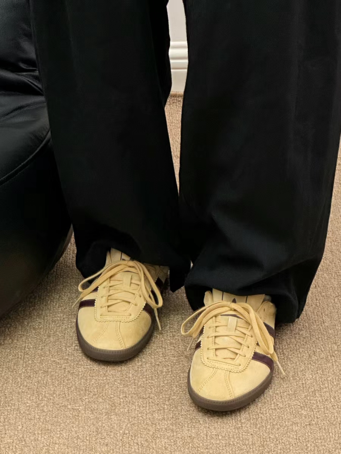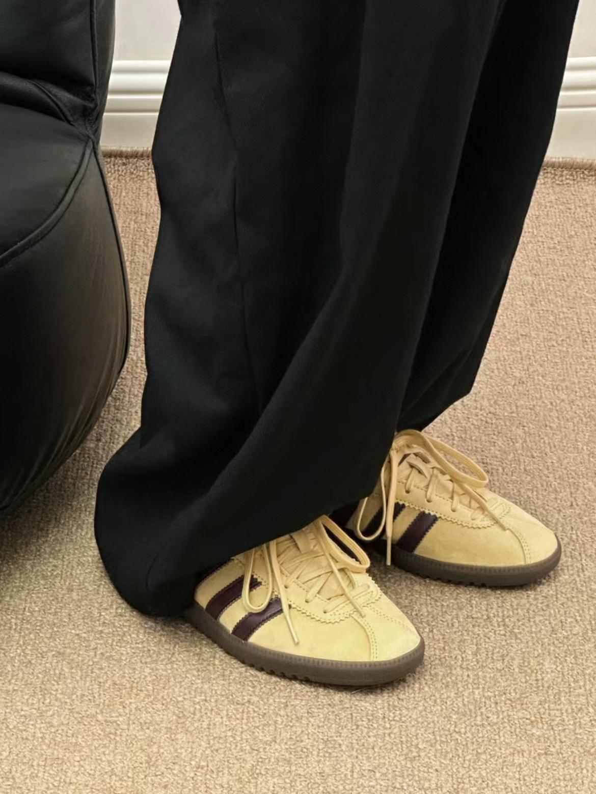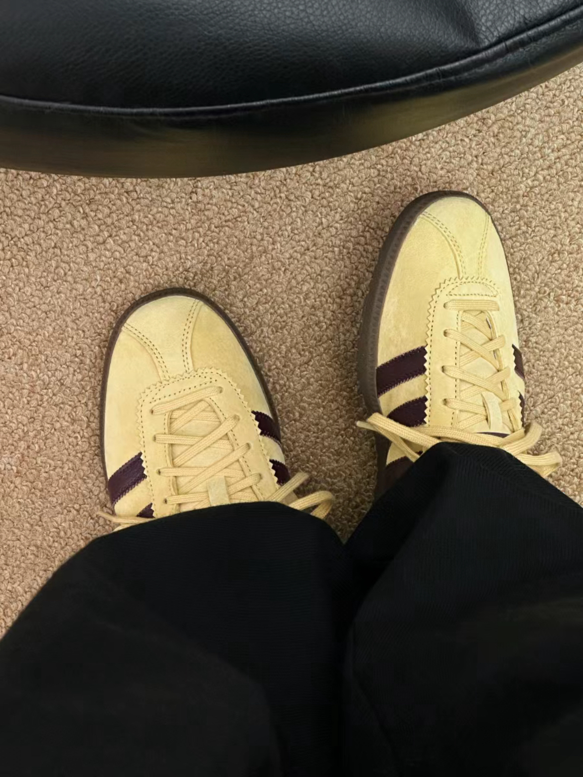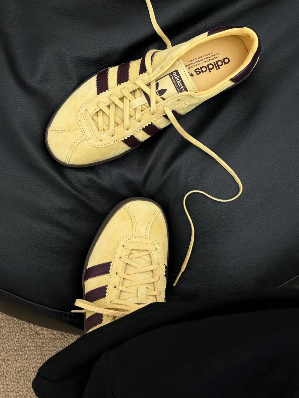 最近被种草了这双淡黄色的 Bermuda 相比 Samba Gazelle 这些热门款 它在T头鞋里应该算是非常小众的 淡黄色搭配酒红色 复古氛围感拉满了🤩🤩