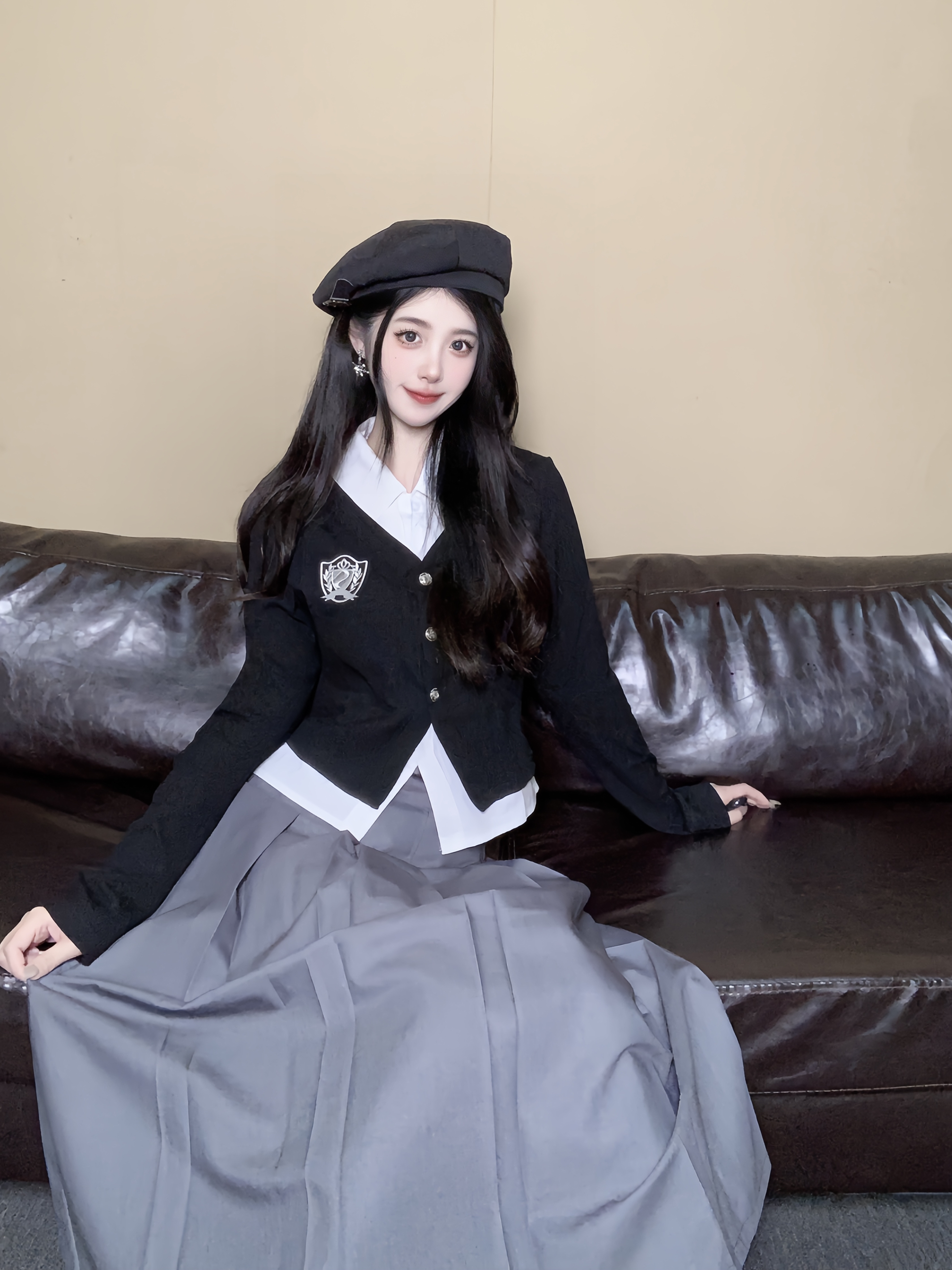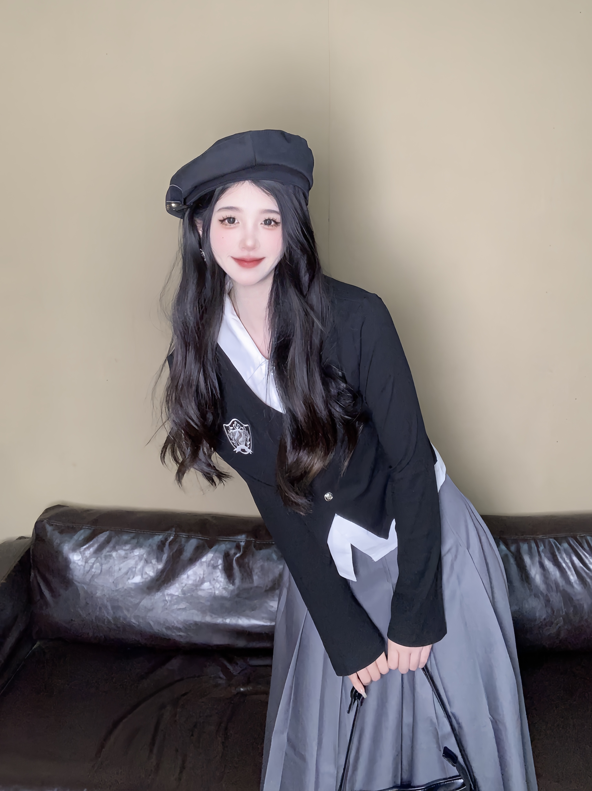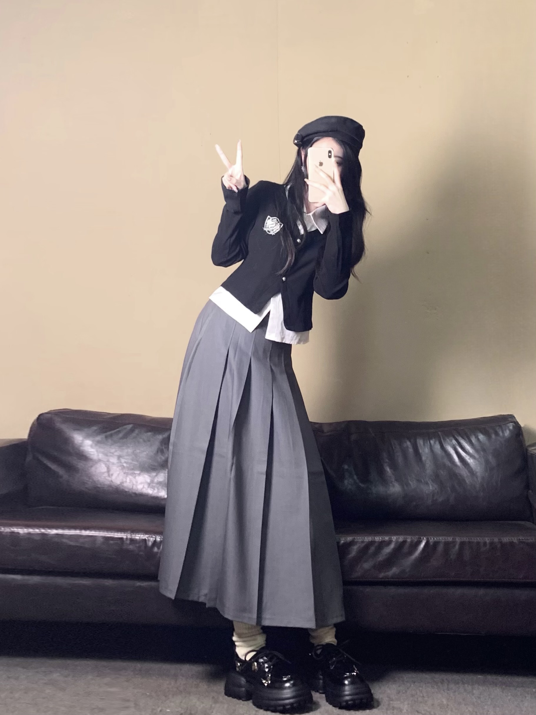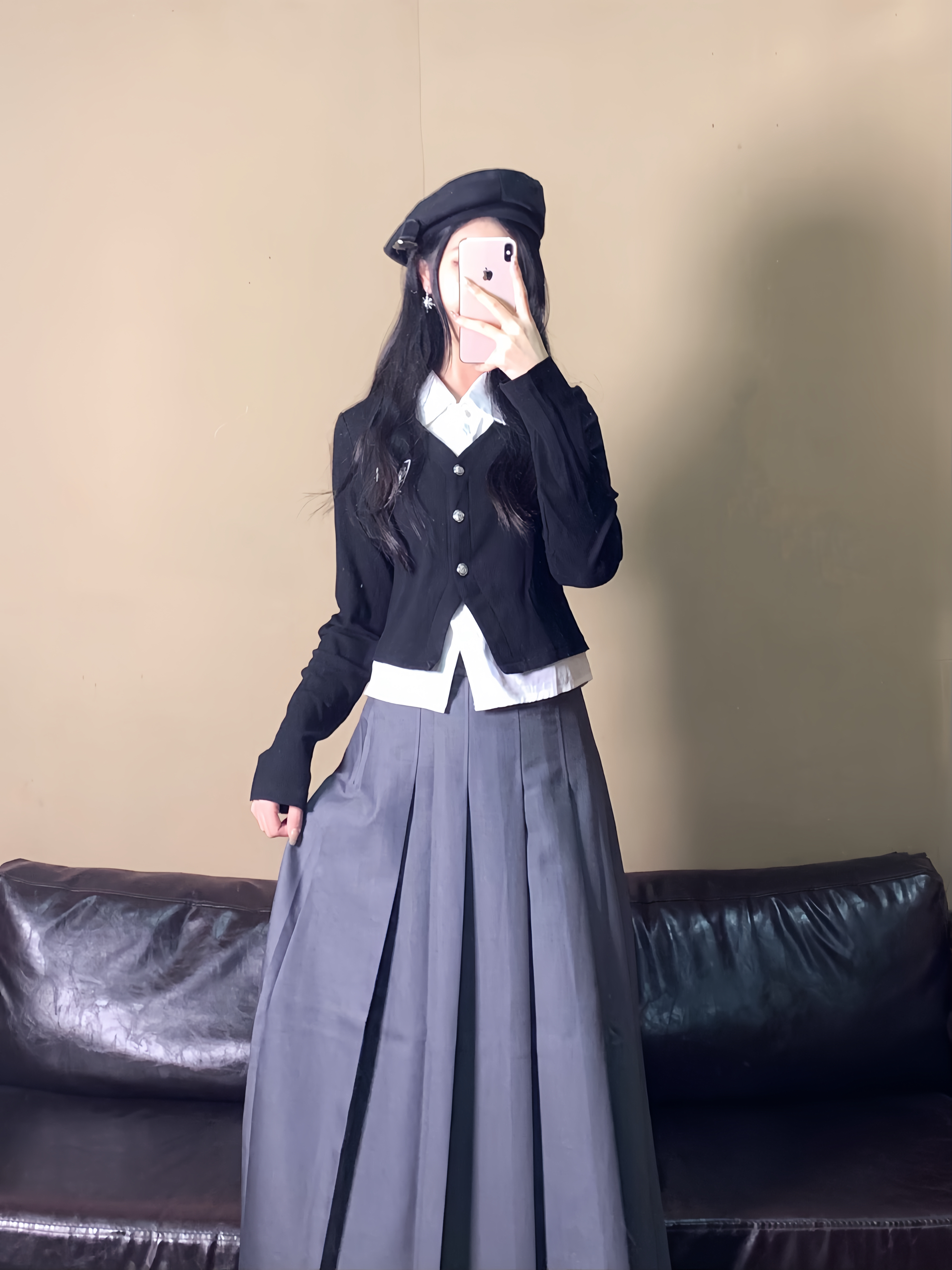 ☑️个人参数: 身高 163cm 体重48kg 黑白拼色上衣➕灰色百褶长裙➕黑色玛丽珍鞋 学院风的修身上衣,是衬衫拼针织开衫的假两件式✨穿起来很方便,我很喜欢的一点就是这种假两件式不会担心里面的衬衫乱跑💗 搭配灰色长款的百褶裙真的气质优雅又不失活力💖