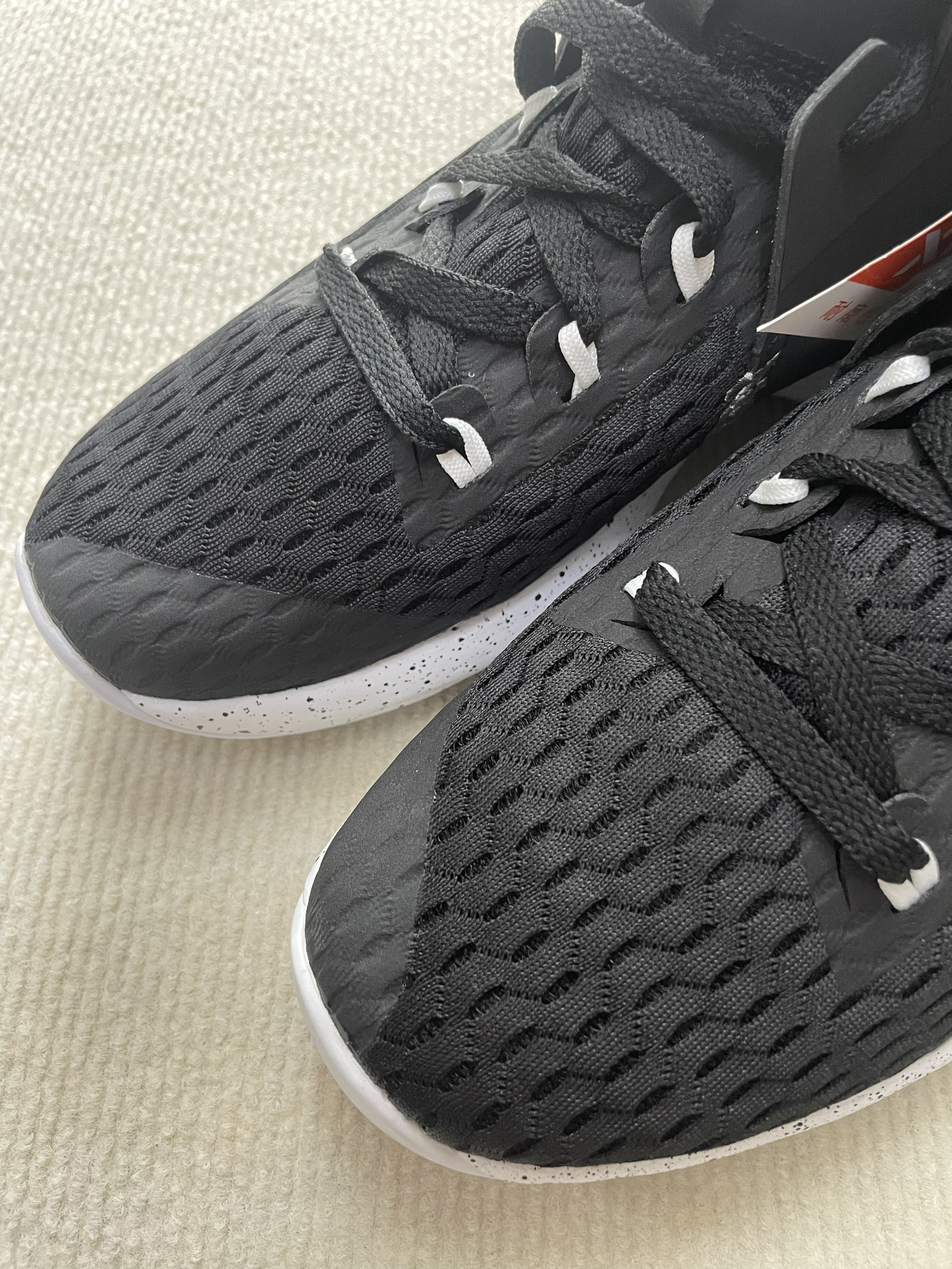 天气越来越热透气性的篮球鞋要安排上了 这双witness 5勒布朗系列是时候登场了 这双是去年购买的刚到手没几天就降温了 所以鞋子买回来放哪一直都没有怎么穿 这双鞋子是黑色网格织物鞋面给足了透气性 购买它主要就是看中了亡的透气性 鞋底上搭配了TPU大底运动性十足 这双鞋子属于中帮穿起来包裹感比较强烈 鞋底的耐磨性不太好不建议打水泥地 打室内还是绰绰有余的