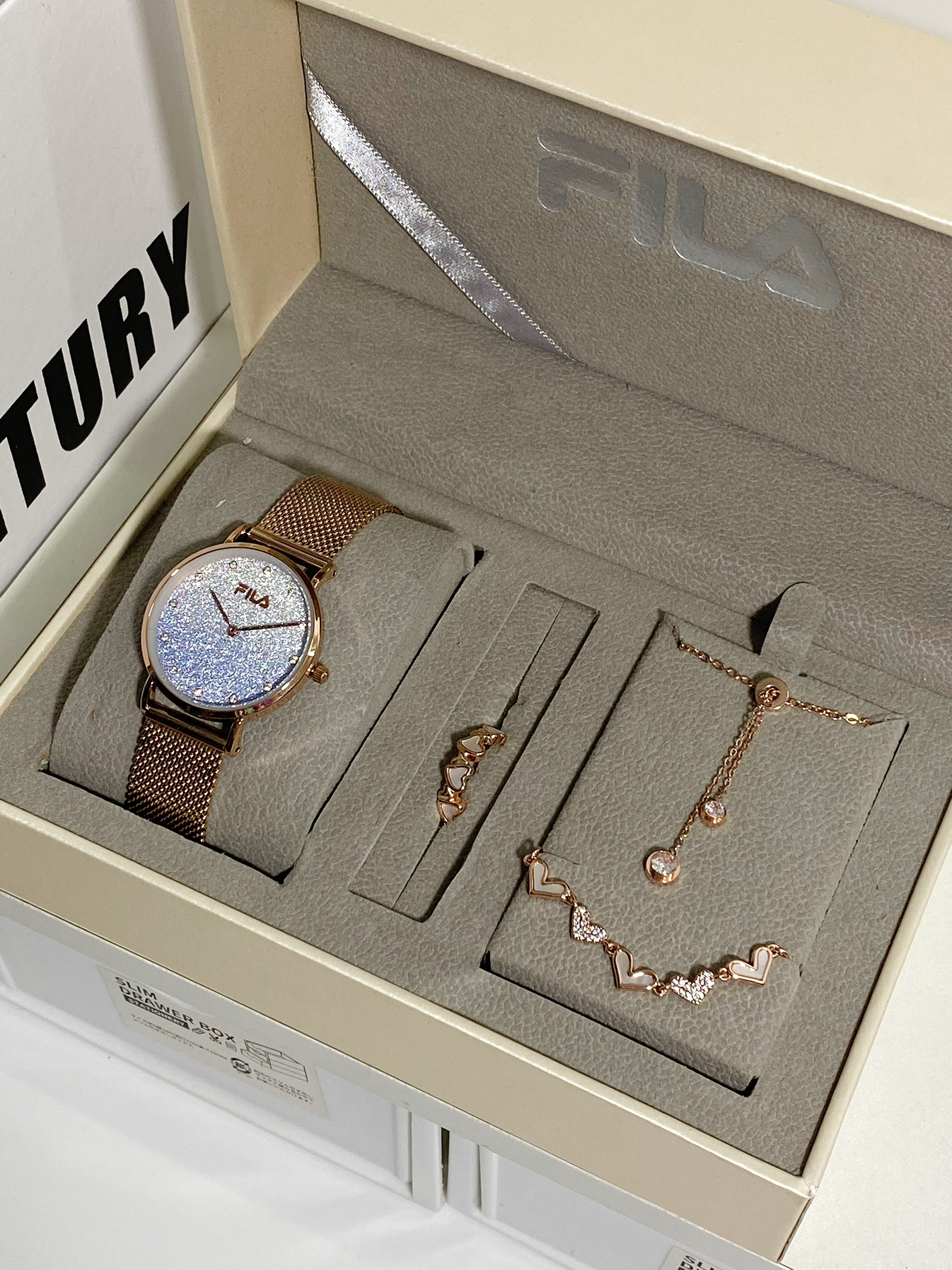 🛒好物名称:Fila满天星手表礼盒 🤔推荐理由:救命 我真的很喜欢这个斐乐满天星手表礼盒 满满当当一个礼盒包含手表 项链 戒指 手链 一套搭配起来贼省事 哪个女孩子不爱啊 手表是渐变满天星表盘 自带流沙闪钻 在光照下闪闪发光 仙气十足 其它配饰跟表带一样都是玫瑰金色的 超级显气质 而且百搭不挑人 用来自用送礼都很合适哦