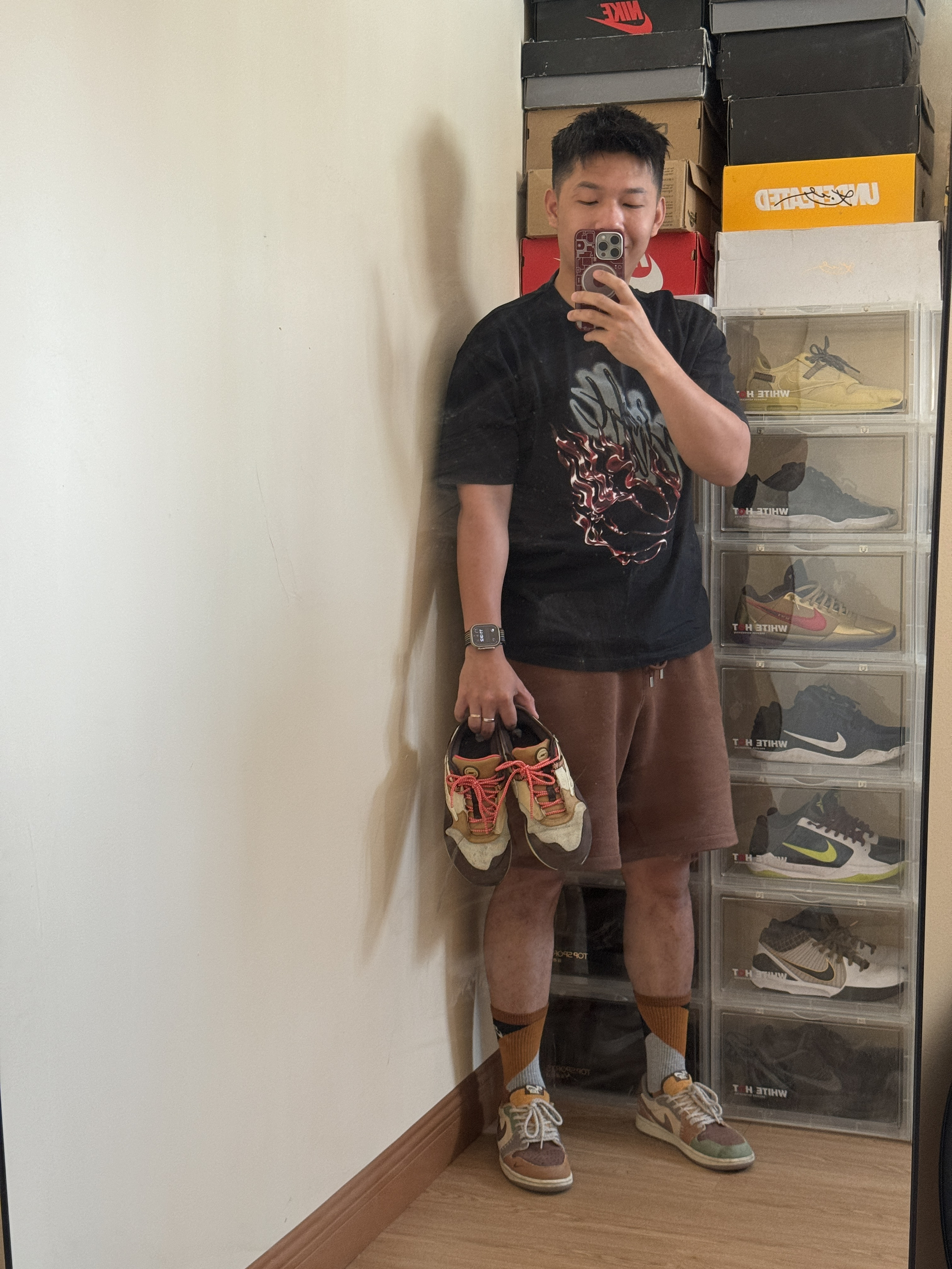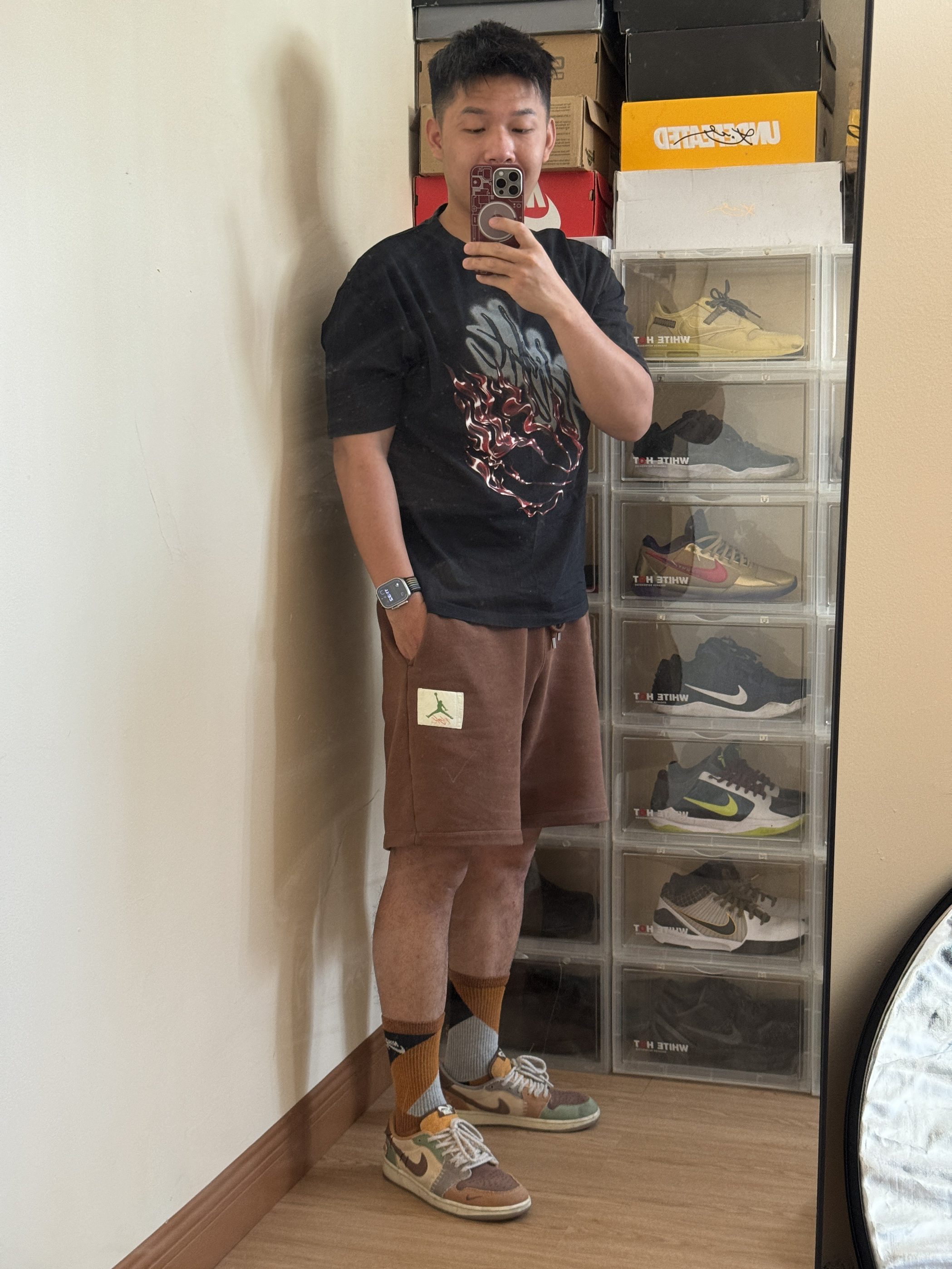 这个夏天选择美拉德吧,无论什么肤色都很绝配🫡 身高|体重:180cm/85kg 🧍♂️ 穿搭风格:美拉德随意风 👔 上衣:Jordan x Travis Scott联名系列 火焰印花水钻 👖 下装:Jordan x TITAN 联名 纯色刺绣直筒松紧腰系带短裤 👟 鞋子:Zion Williamson x Jordan Air Jordan 1 retro"voodoo" 巫毒娃娃 锡...