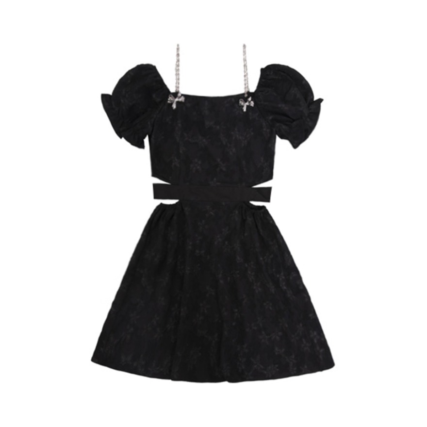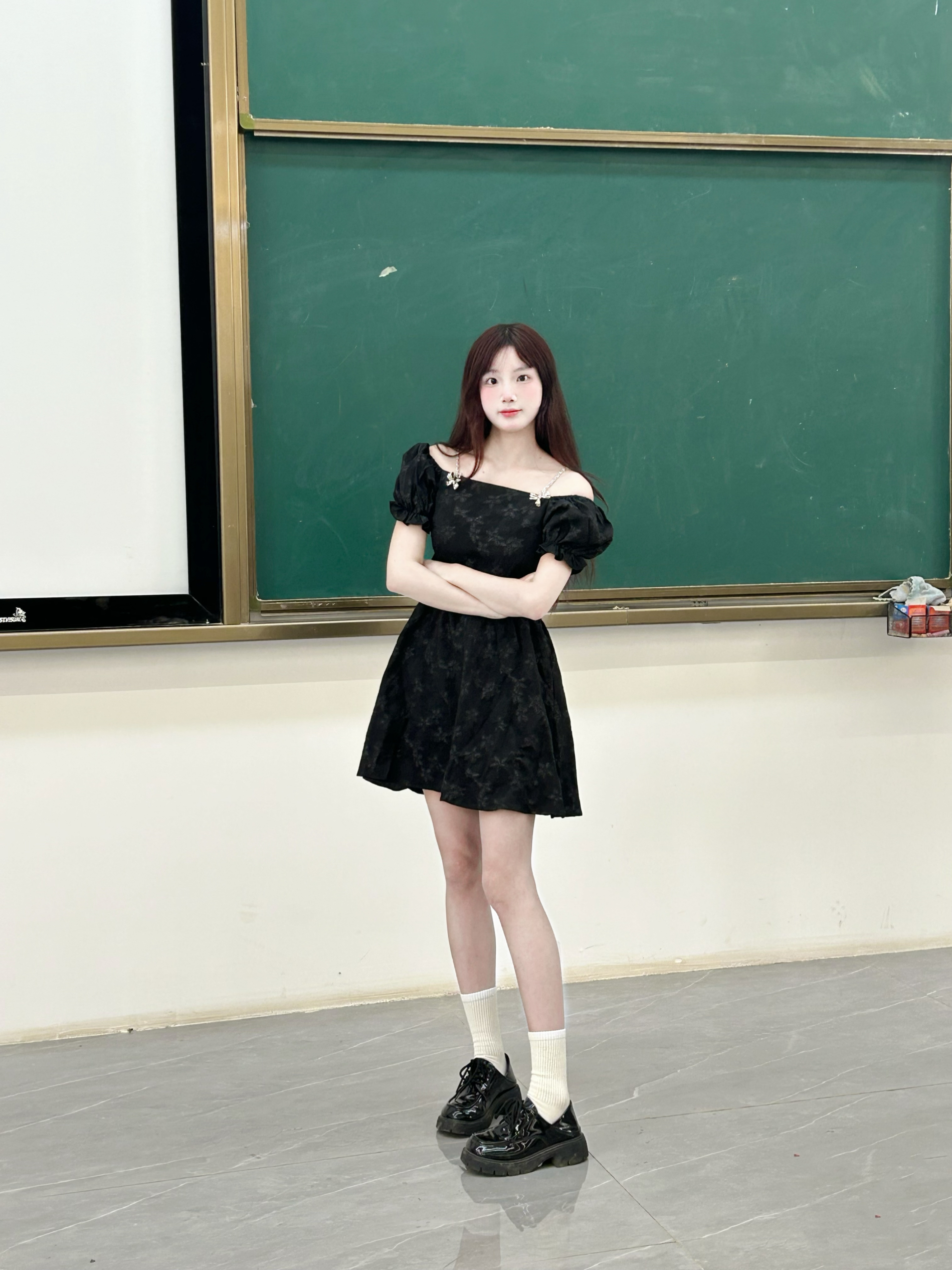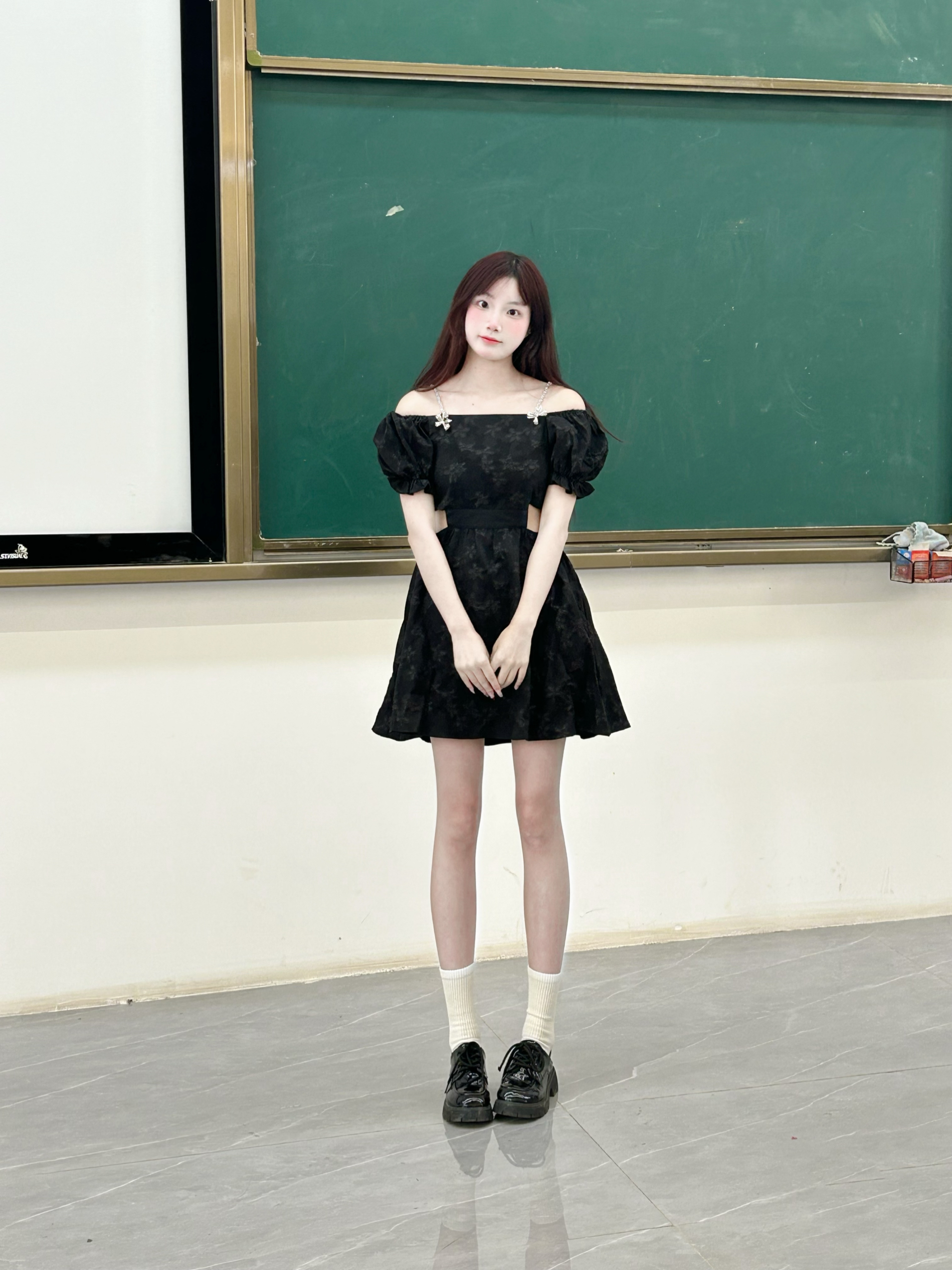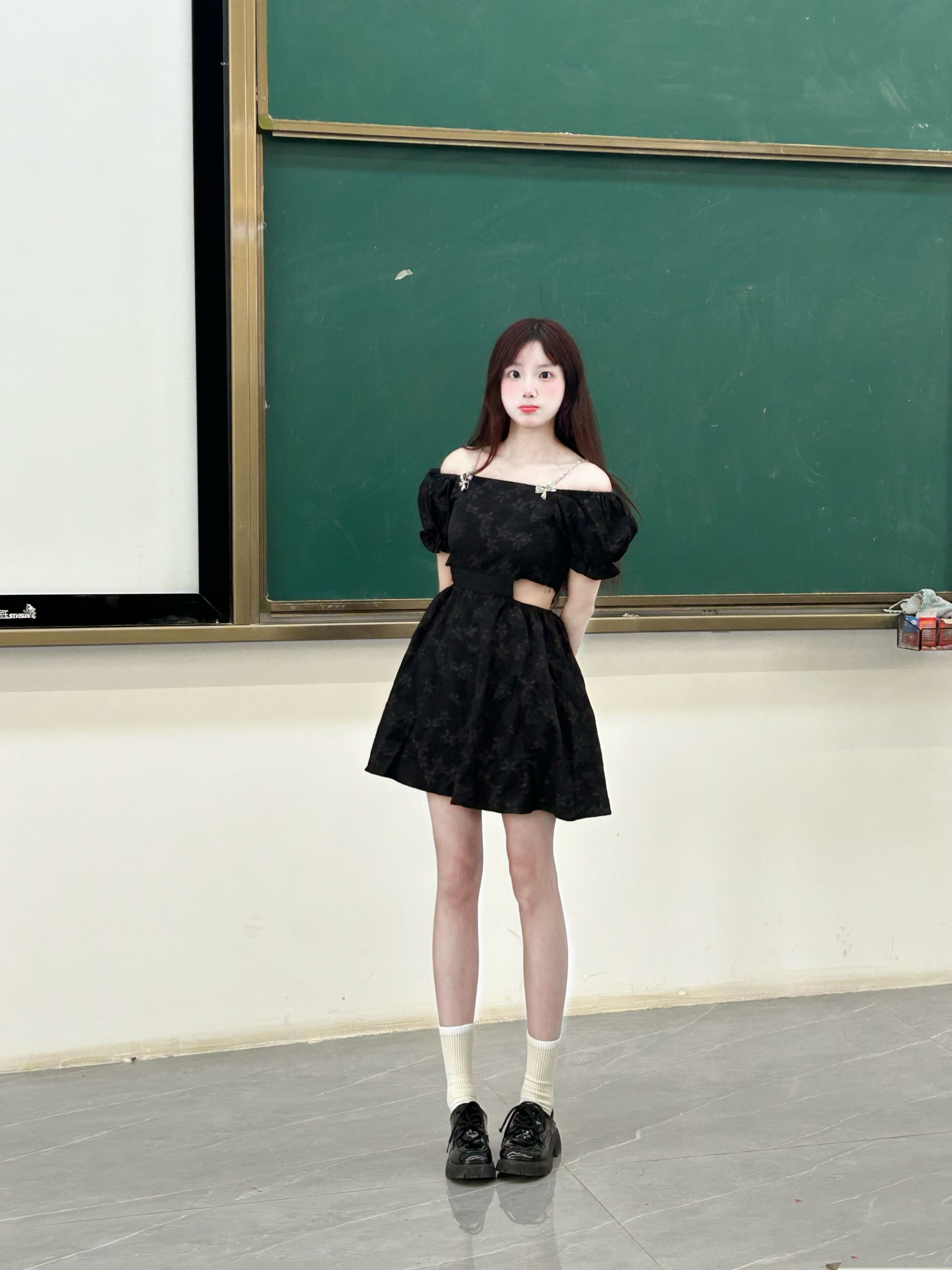 今天穿什么 今天穿 UNIFREE 小黑裙 这款裙裙为镂空肌理感 穿上好有高级感呀 一整个温温柔柔啦 ☆*:.。. o(≧▽≦)o .。.:*☆ 一字肩设计展现肩部线条呀 两个链条连接真的很有设计感 好喜欢小黑裙