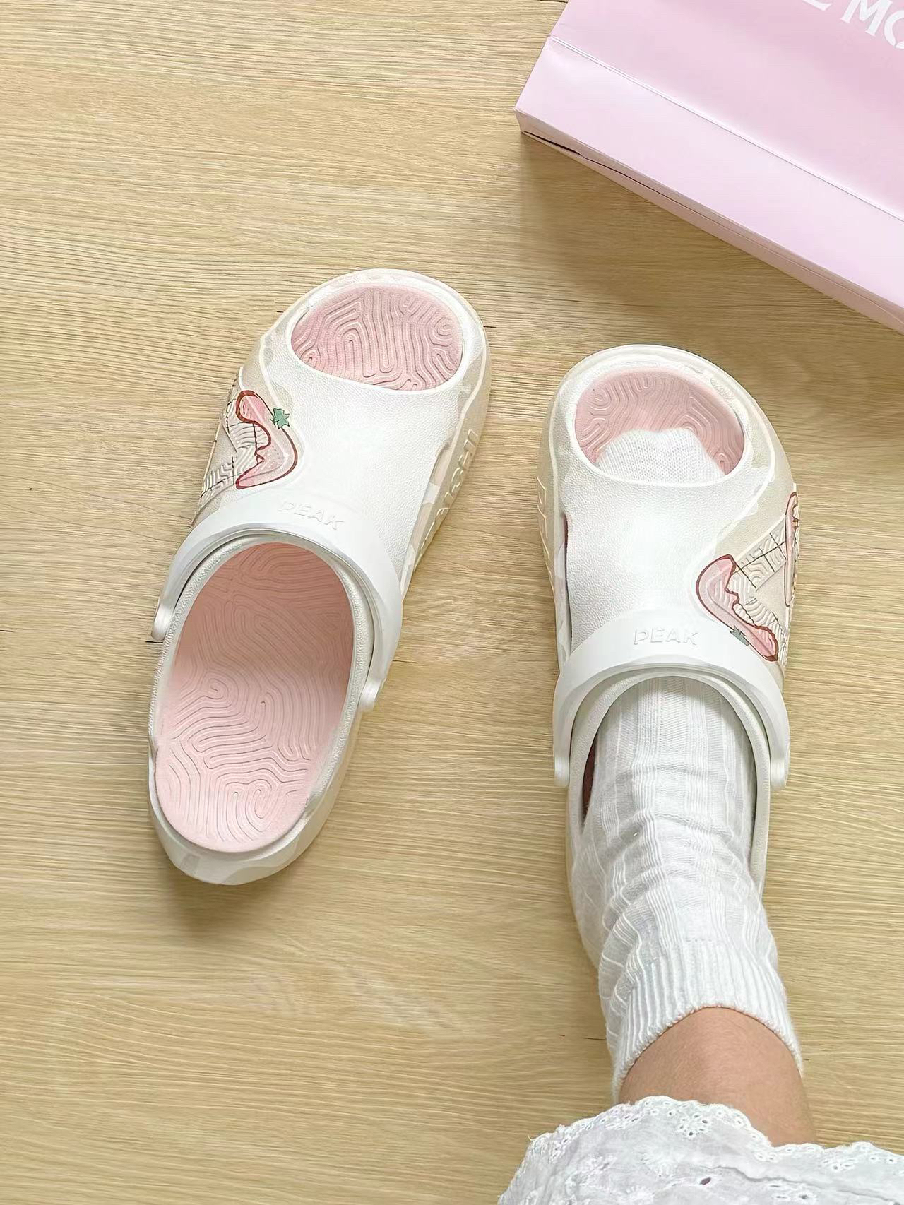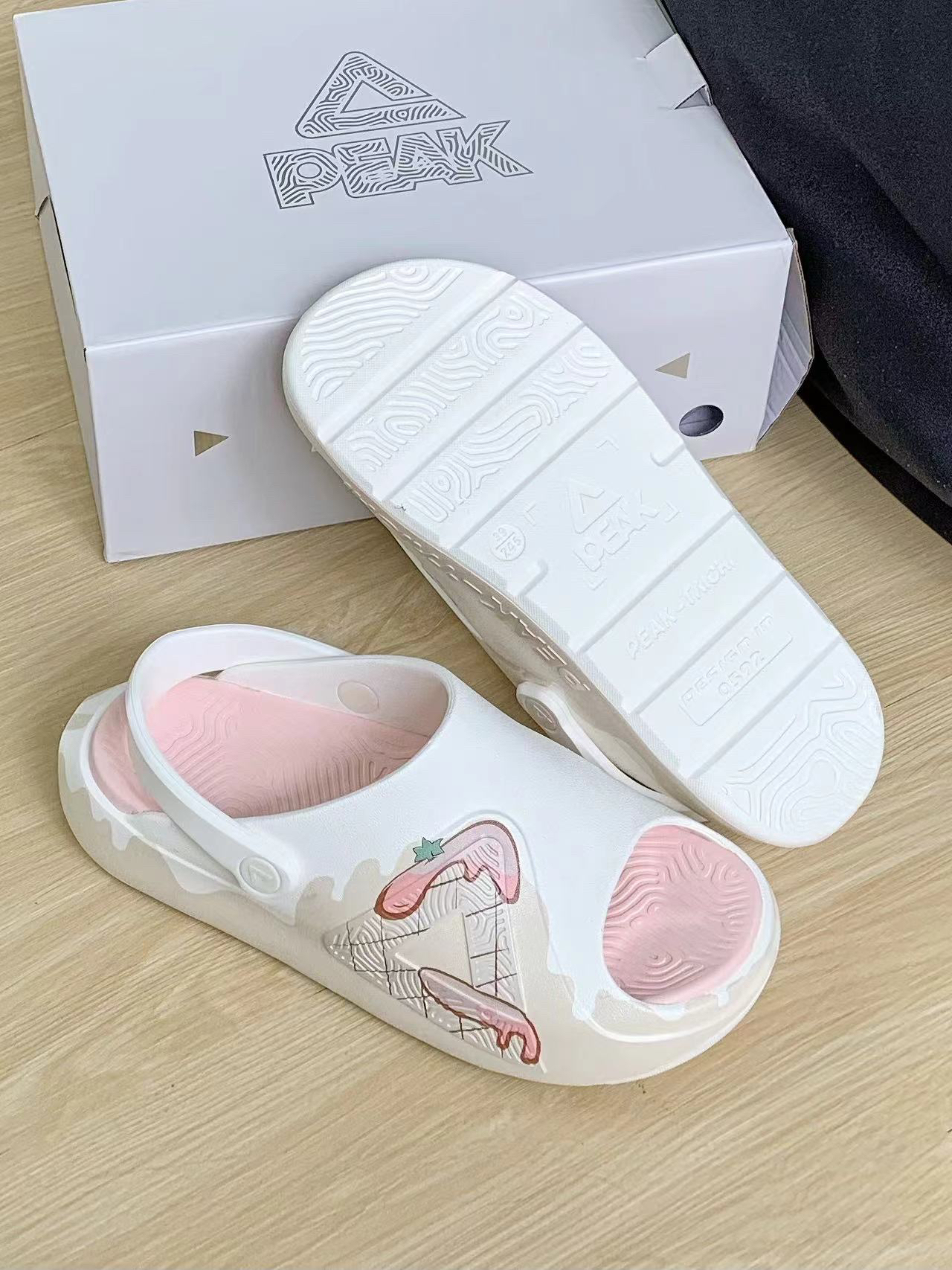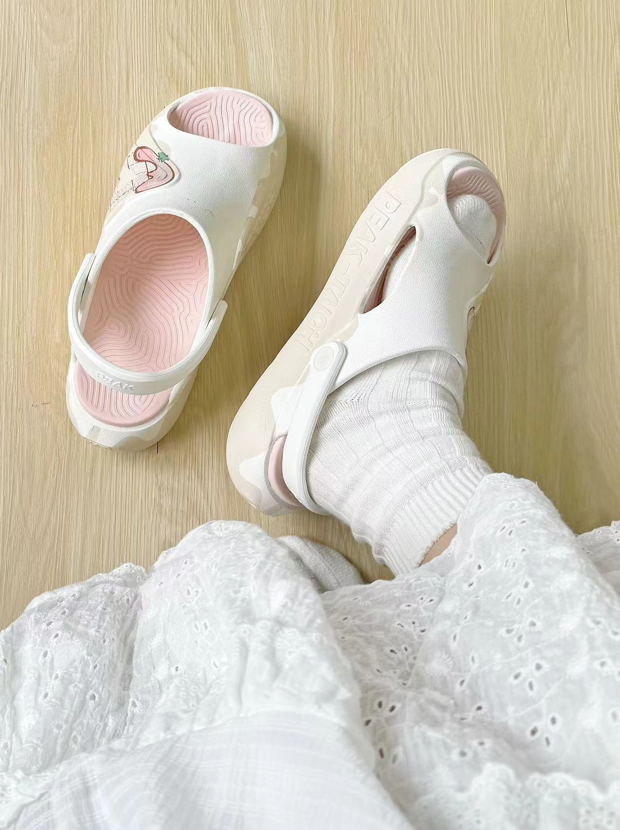一开始拿到手以为是洞洞鞋,但是比洞洞鞋更透 气 颜色特别粉嫩好看,鞋型还可以显瘦什么衣服都能搭配 脚感也是那种软软弹弹的脚感,爱了