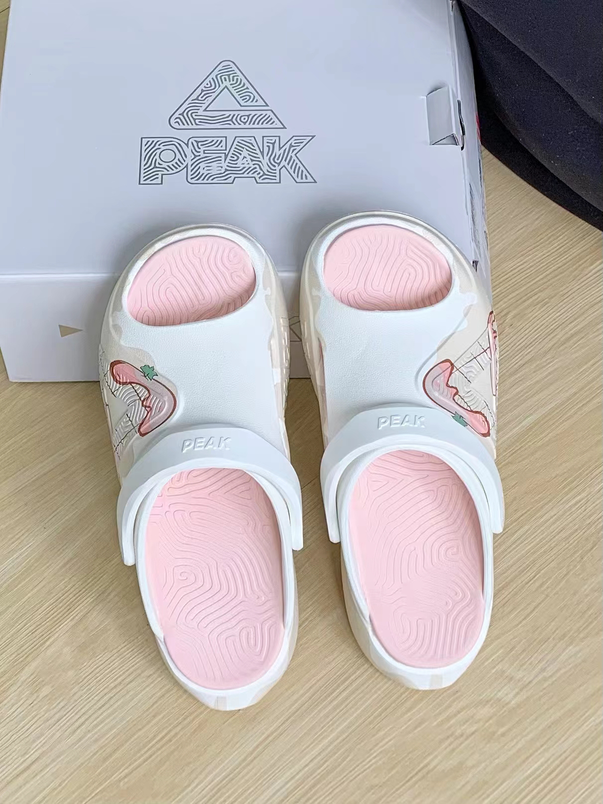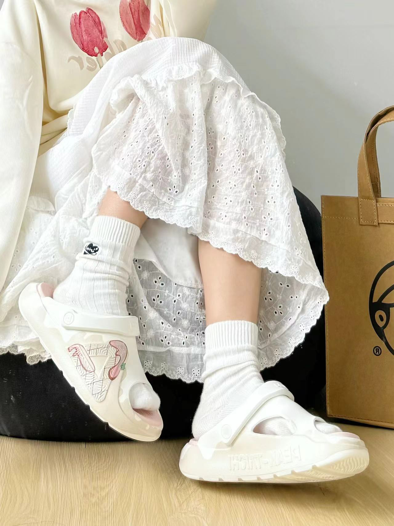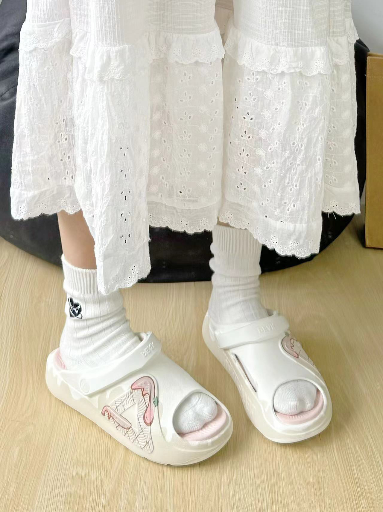 一开始拿到手以为是洞洞鞋,但是比洞洞鞋更透 气 颜色特别粉嫩好看,鞋型还可以显瘦什么衣服都能搭配 脚感也是那种软软弹弹的脚感,爱了