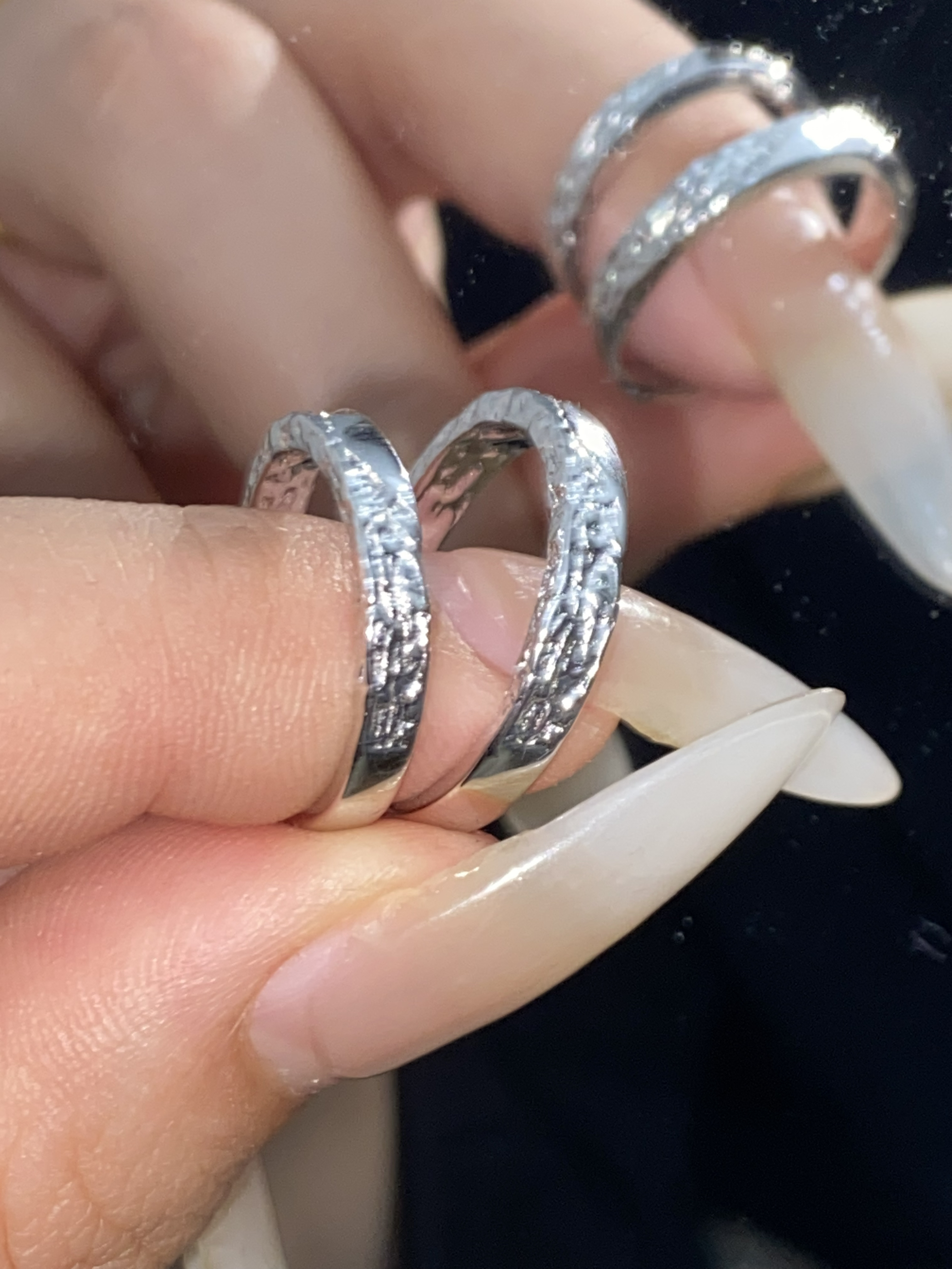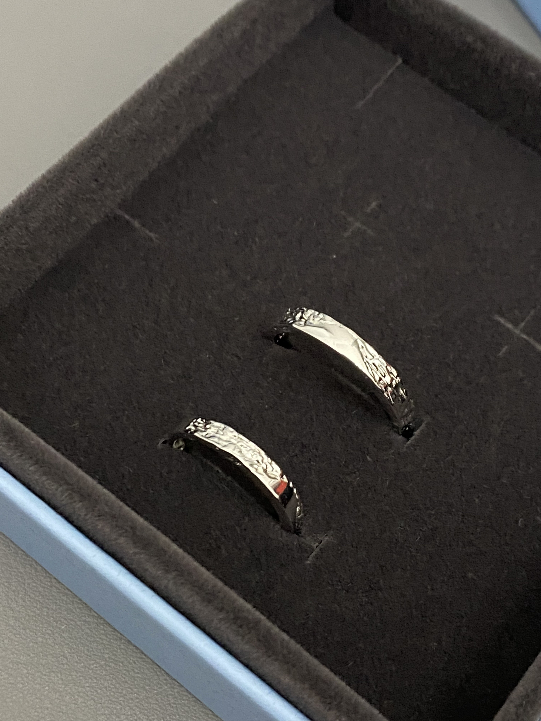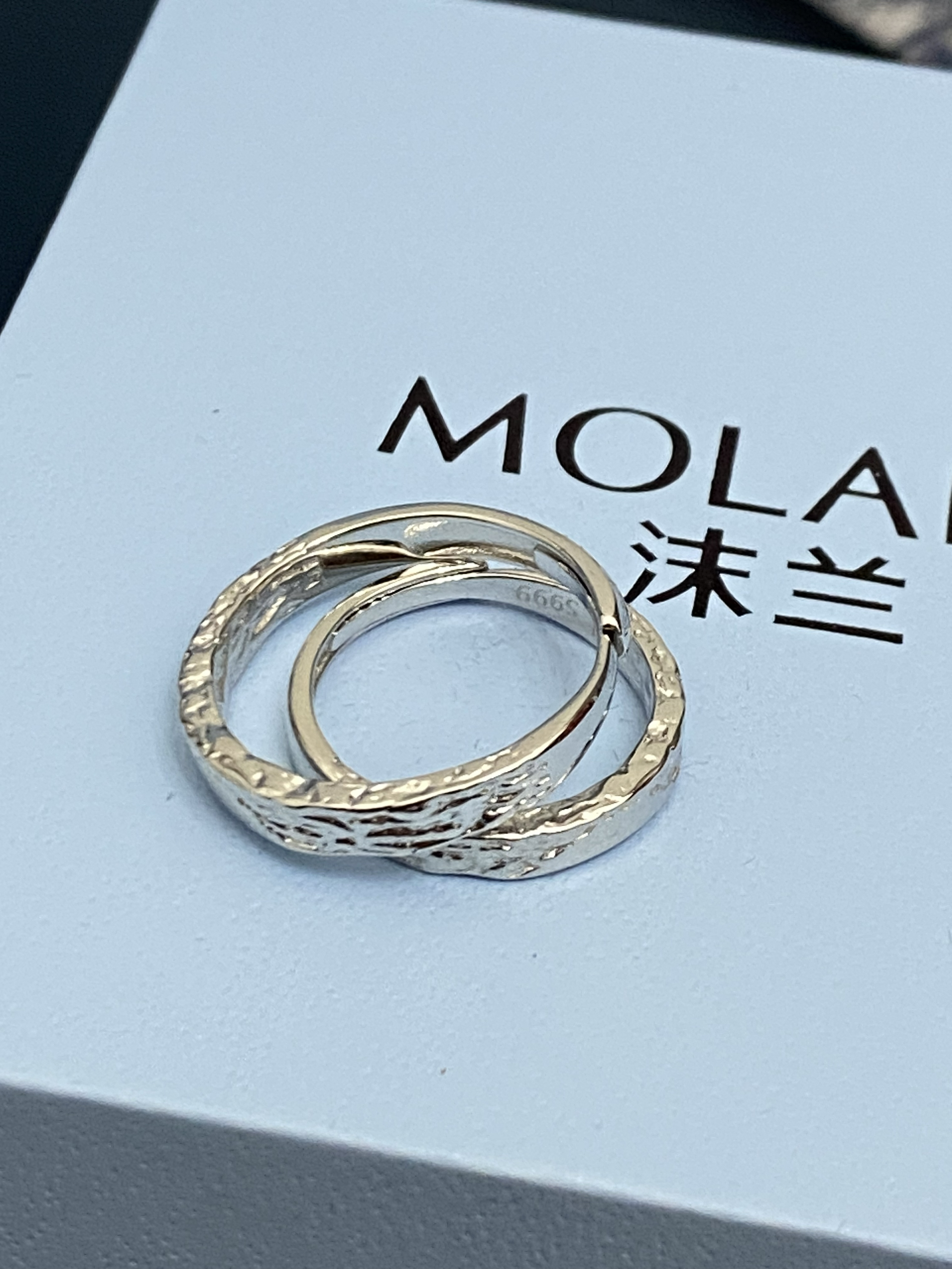 还是礼盒装的呢 看起来非常的高贵 而且还有手提袋! 刚刚好兼职第一份工资 给我们两个买了对戒 还可以刻名字 满足了大学生谈恋爱的幸福感