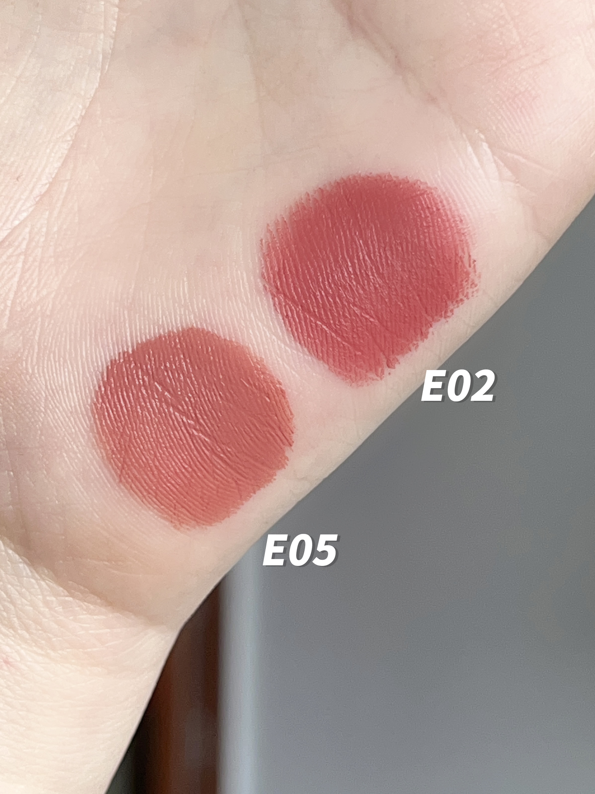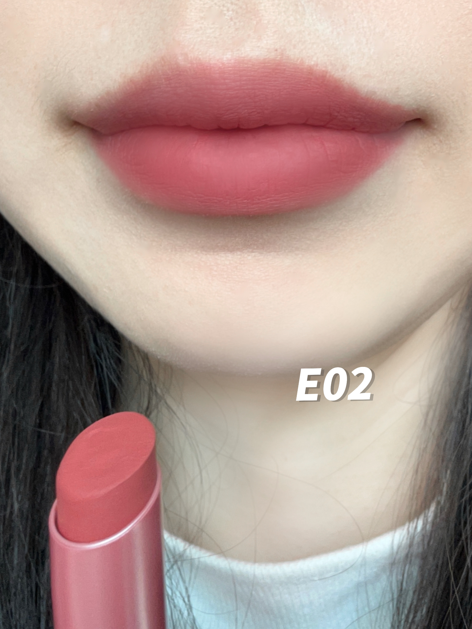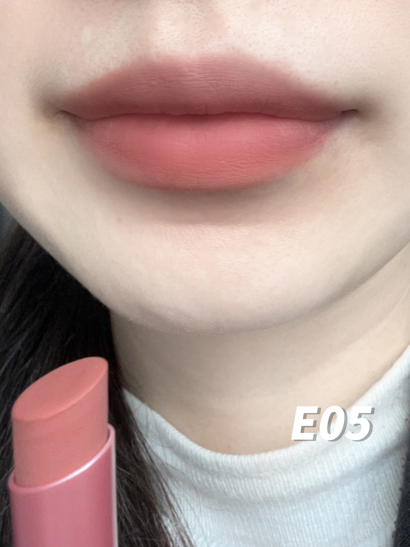 我一眼就看上了pinkbear不沾杯口红的外壳 磨砂粉金拿在手里很有质感 颜色都是偏低饱和伪素颜挂的 鹅且! 质地丝滑好涂,没一会儿就成膜了!不沾杯! E02 拂晓粉 偏灰粉调的无花果色,橄榄皮上嘴巨好看,薄涂温柔甜妹,厚涂气质学姐 E05 软陶木 偏裸色调的奶橘,不挑肤色,上脸干净温柔又提气色