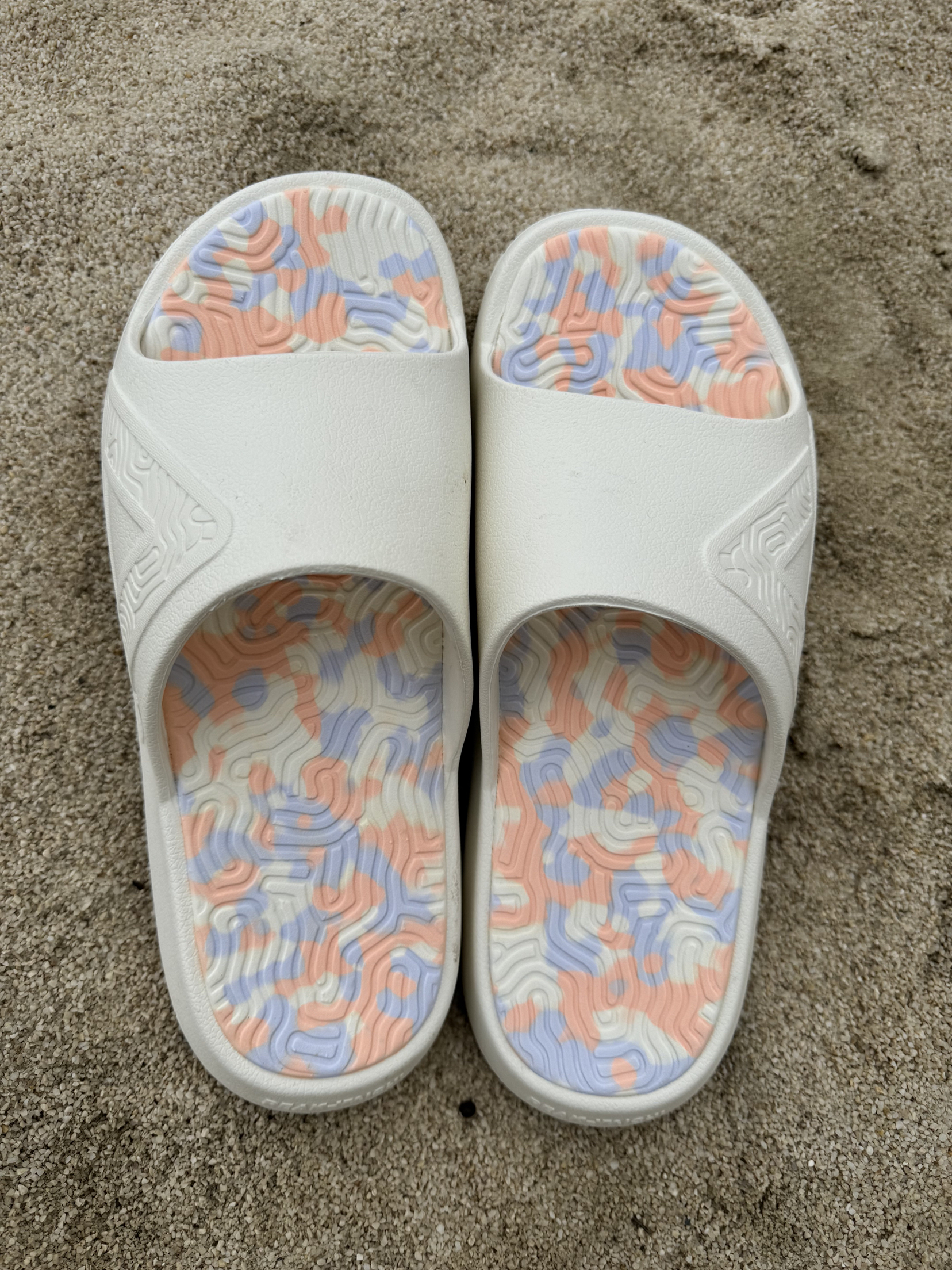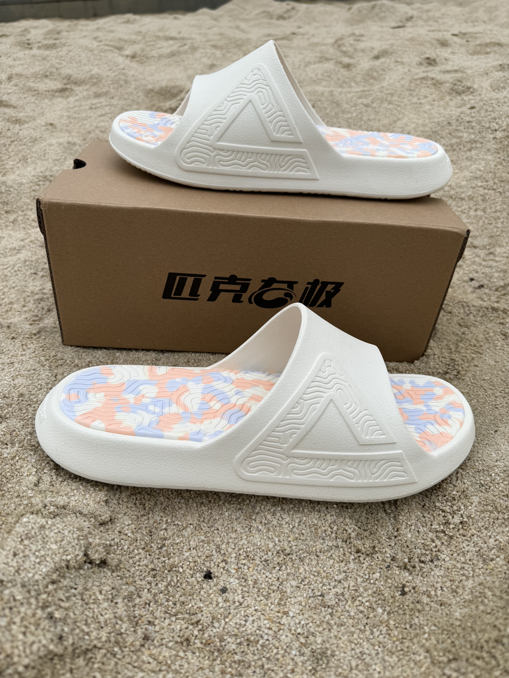 匹克 态极拖鞋 帆布白 非常清爽的一个配色,上脚好看好搭配。 中底全掌态极科技,脚感非常舒适,缓震很棒,像踩在云上一样。 尺码方面建议比平时选小半码,这个鞋楦有点大。 外底的纹路深而密集,抓地力不错。 另外白色的拖鞋建议及时清洗,必然会影响颜值哦。