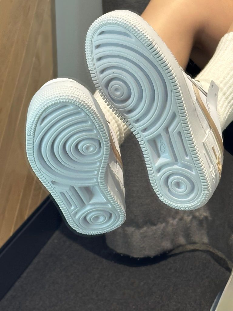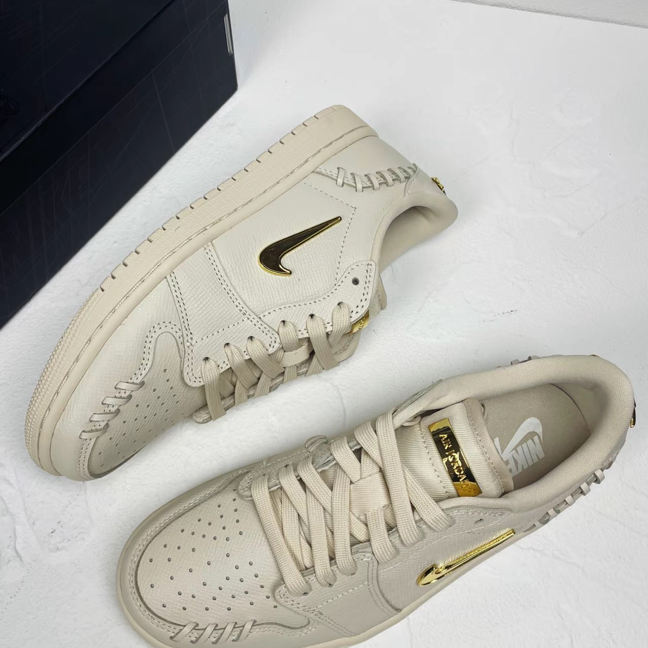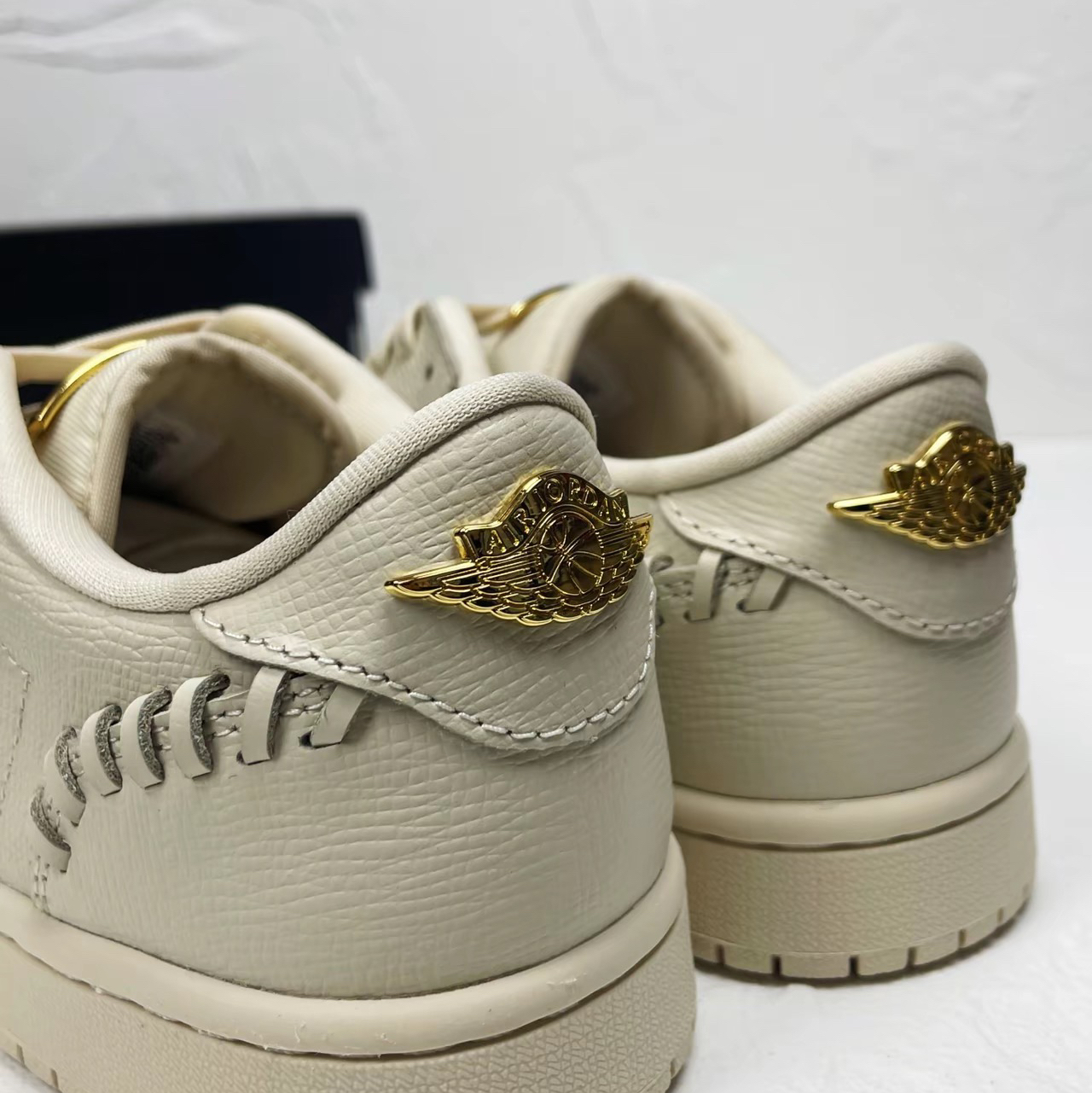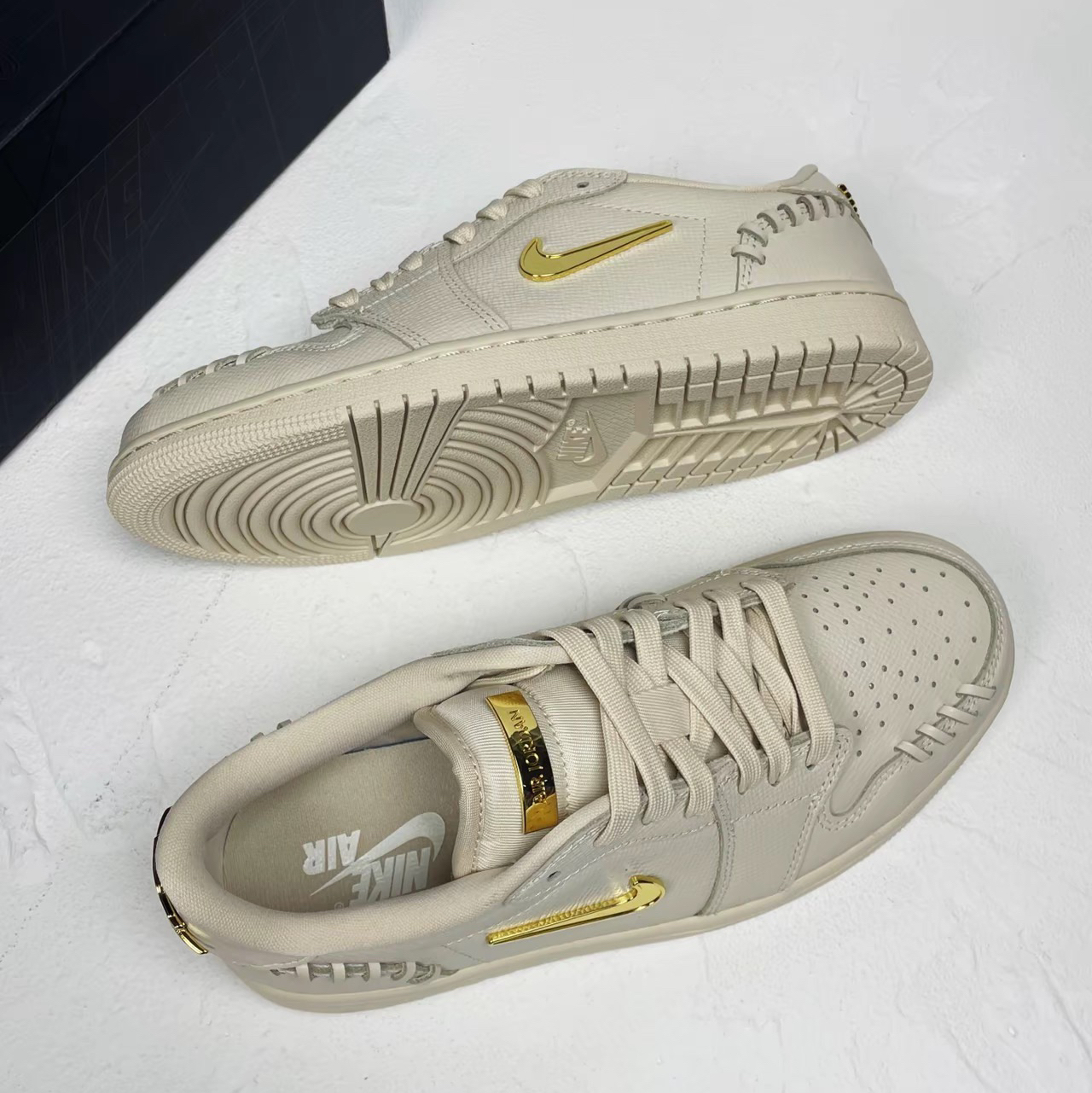 这款AJ1 Low整体采用卡其色打造,鞋身采用编织小细节点缀,鞋身的swoosh,鞋后跟的飞翼logo采用金色点缀,整体看起来高级又复古,好似联名款~