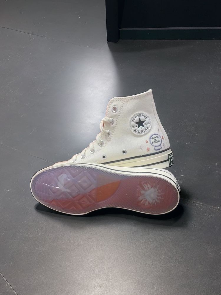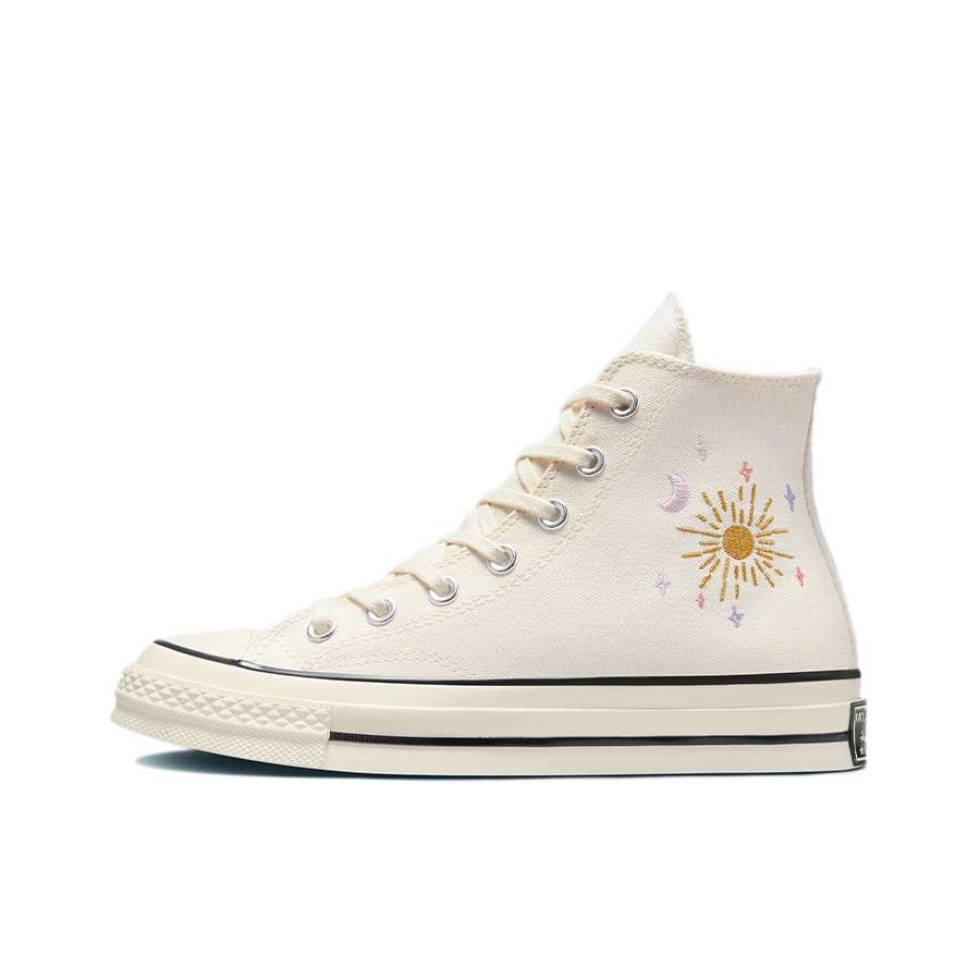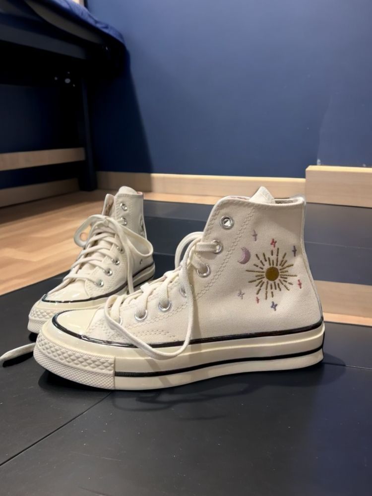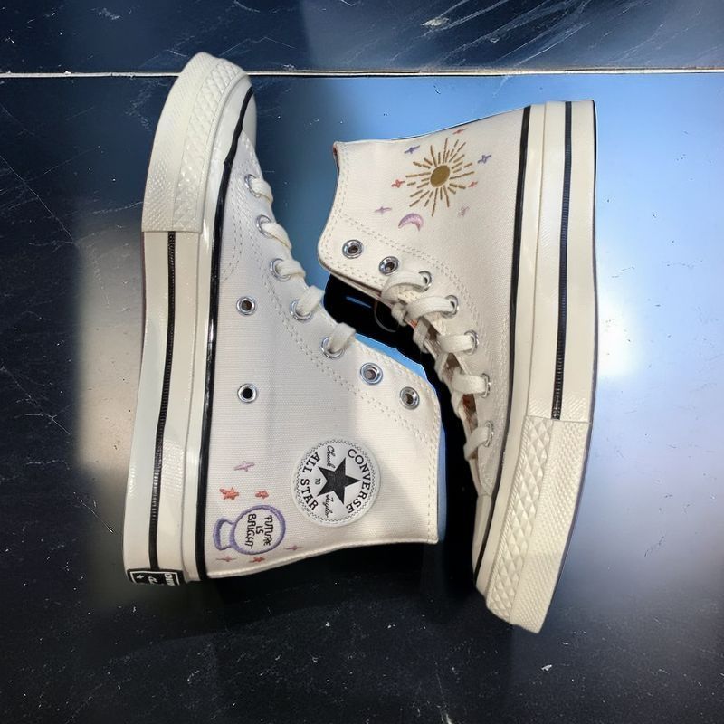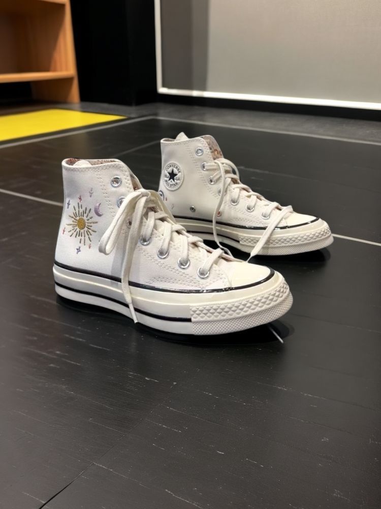 哇塞!这双Converse Chuck 1970s真的是让人眼前一亮🌟刺绣的星空设计💎真是太独特了!✨ 星空、太阳、月亮和星星装饰在鞋身内侧,像是穿上自己也能触摸到天空的感觉!🌤️💫水晶球状的轮廓巧妙地展现了日月星辰的魔力🔮,为这双鞋增添了一份未来感。 这双鞋的设计理念真是充满了创新和想象力!它以十二星座为灵感的衬里,每个星座都有自己的彩色字标🌈,像是给每双鞋都镶嵌了一颗宝石💎,使整体外观更加和谐...