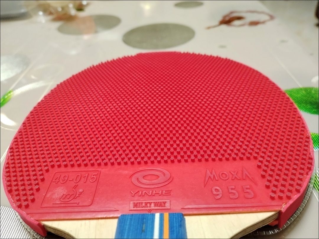 YinHe/银河 长胶 955怪胶黄的乒乓球拍胶皮在防弧和吃球方面表现较好,防弧回球的弧线较低,使得对手难以连续拉弧圈。发力刮、撇球的效果也很飘,对手往往难以准确接球。这款胶皮的另一个显著特点是发球时球弧线低沉,这可能是由于胶皮颗粒较大(4平方厘米42个颗粒)所致。总体而言,我认为这款胶皮的价格合理,且据称较为耐用
