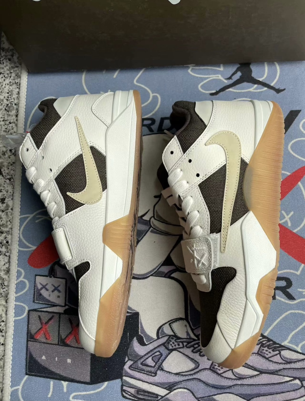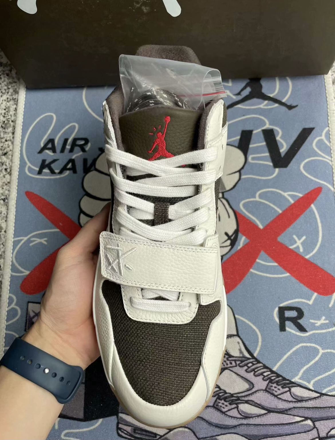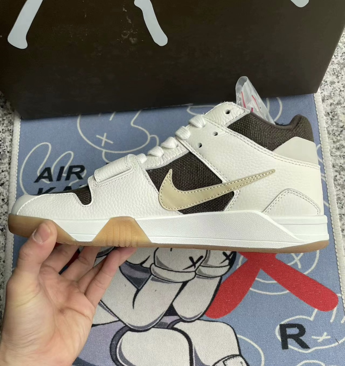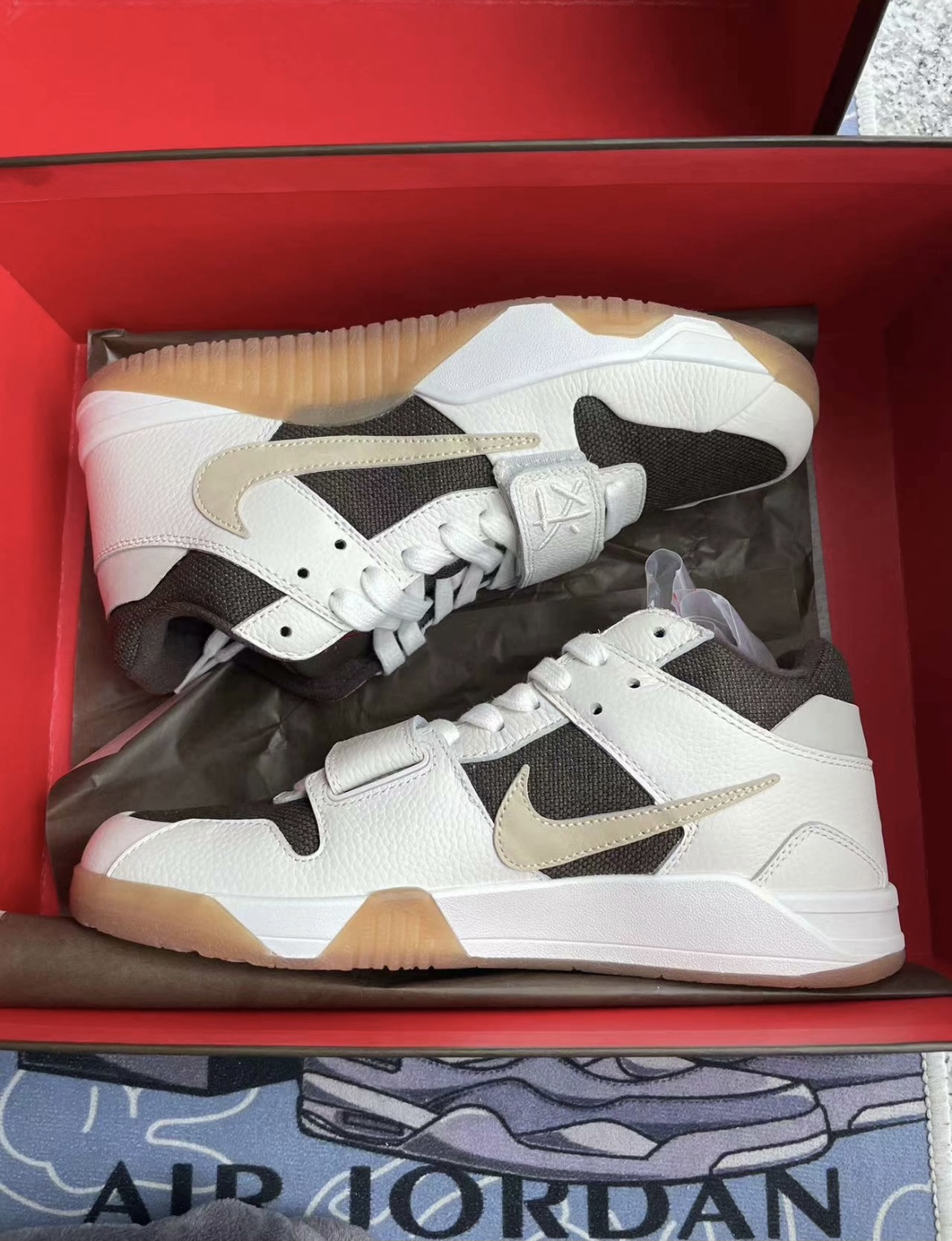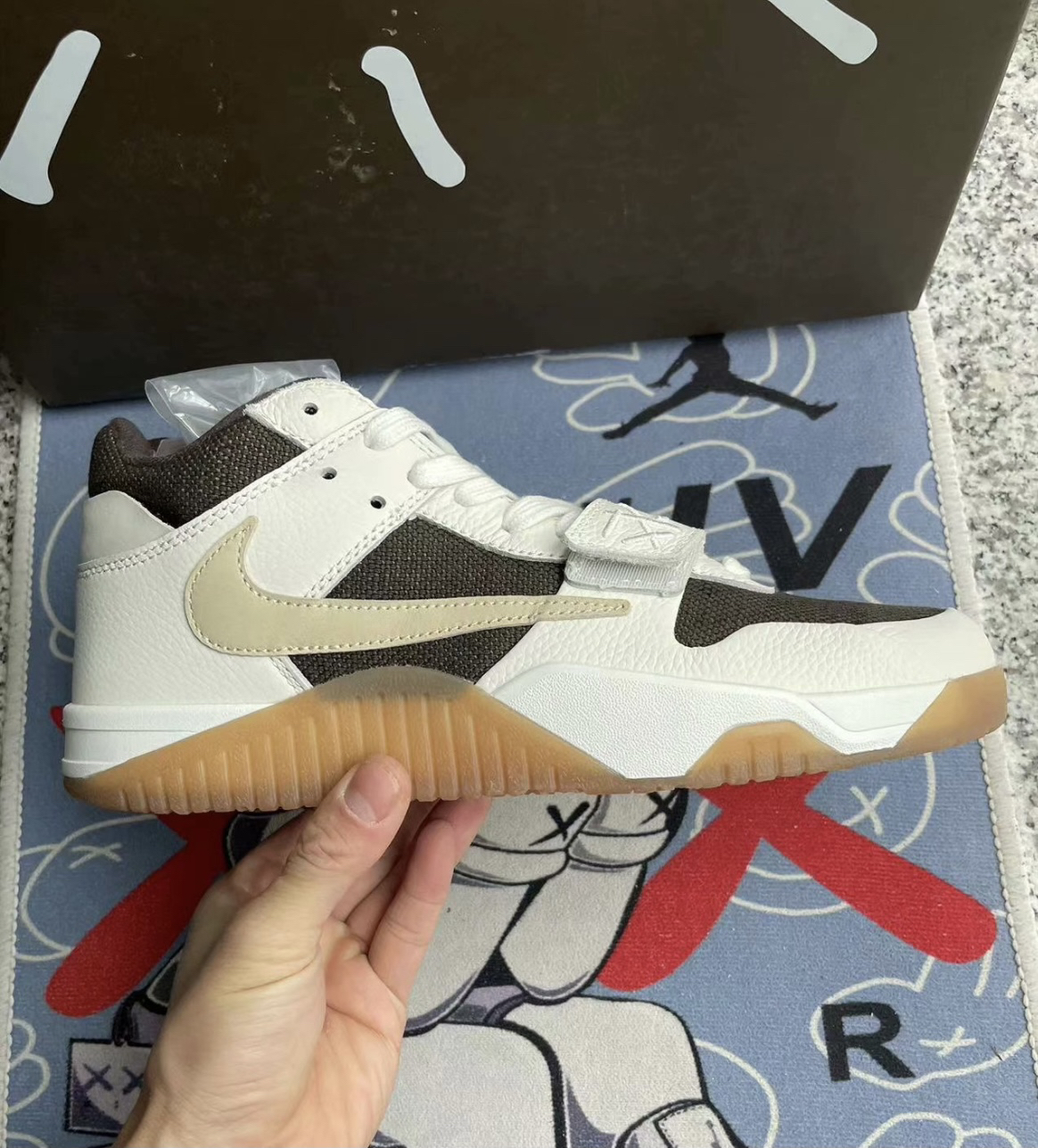 实物到手比想象中的颜值高很多,鞋头还采用了魔术贴的设计非常酷,整体的配色酷似倒钩3.0的摩卡配色,后跟依旧是TS人头Logo,热度将会很高,完全可以放心冲。