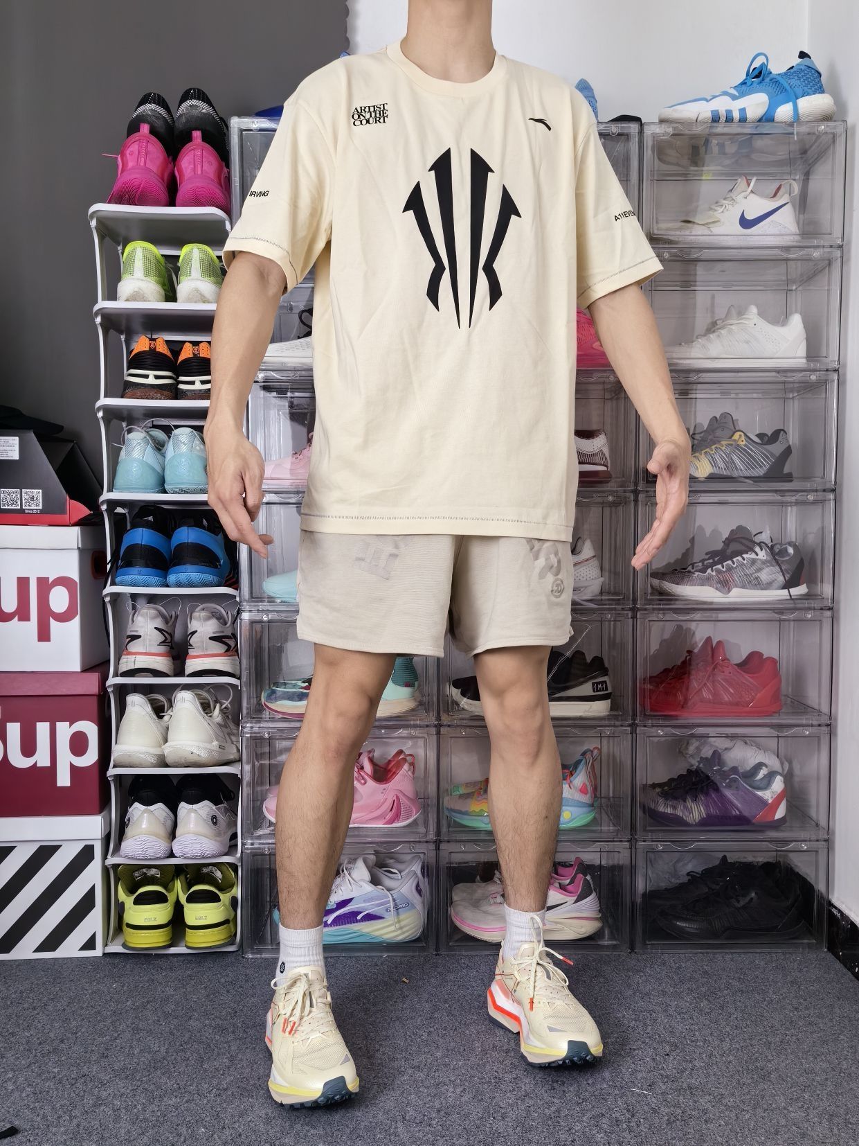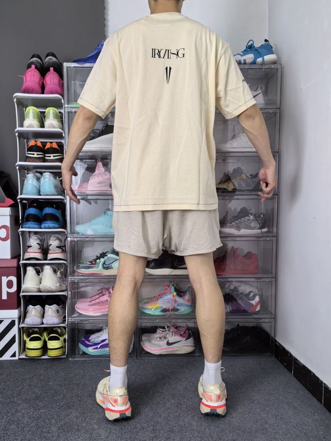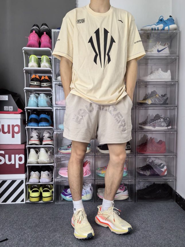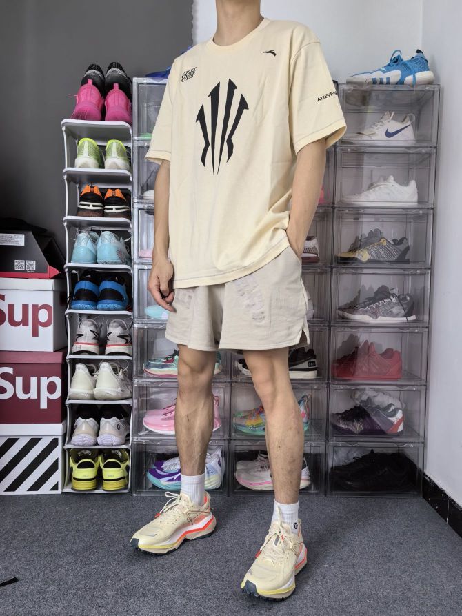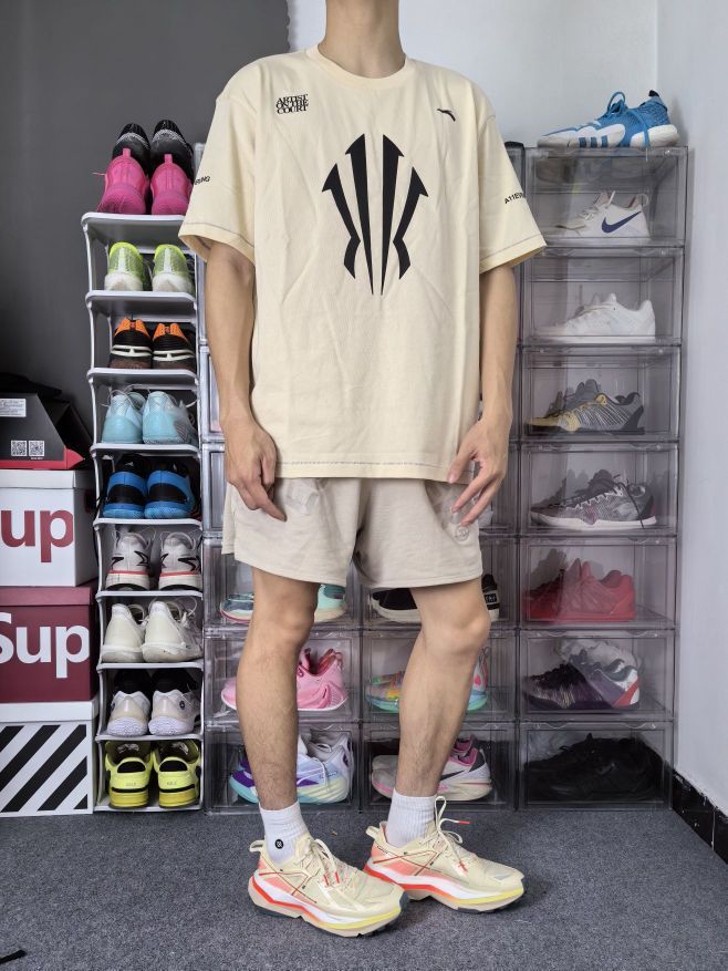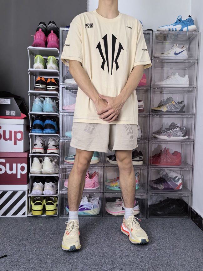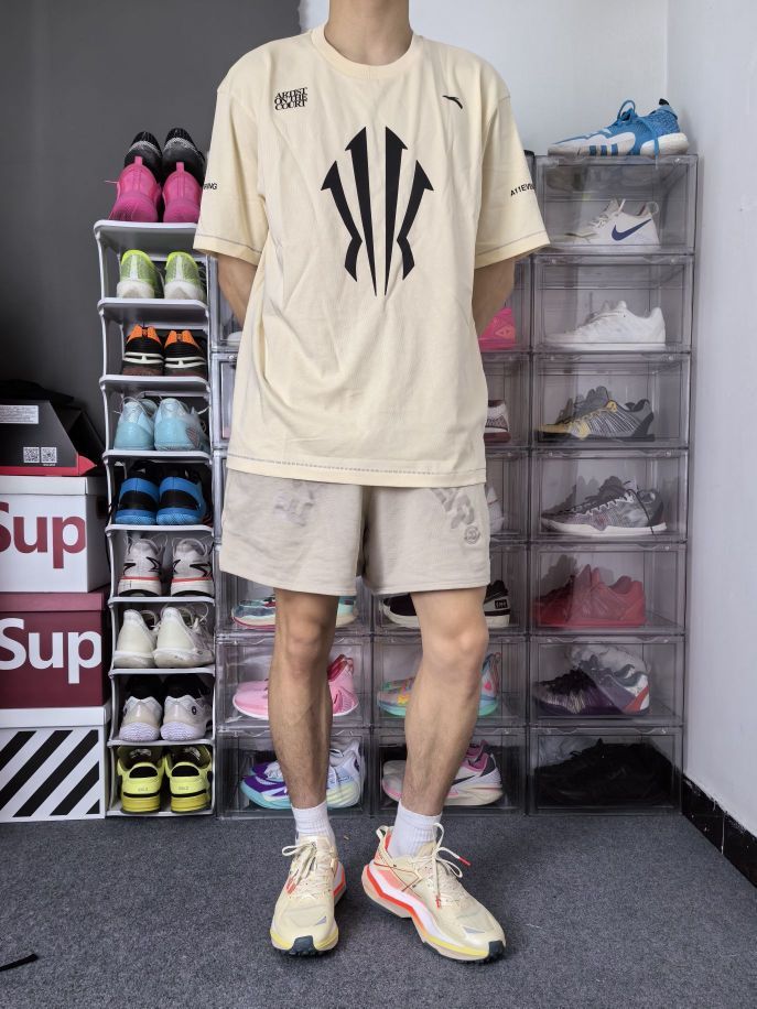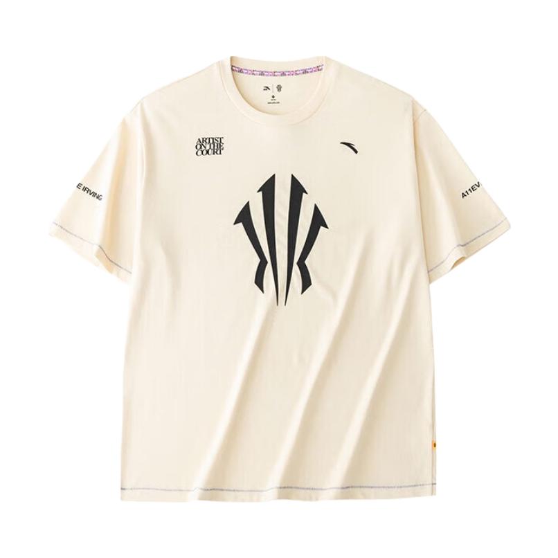 安踏给欧文设计的这个 Logo 有力量和速度感,简约的设计也符合当下潮流! 这是一件安踏的欧文系列短袖,正面是欧文的大 Logo,两侧都有标语,简约大气;我选的是一件杏色,整体风格更为成熟! 衣服是宽松落肩的版型,美式运动风格;衣服面料柔软轻质,上身束缚感不强; 本人 173cm 65kg 选L码