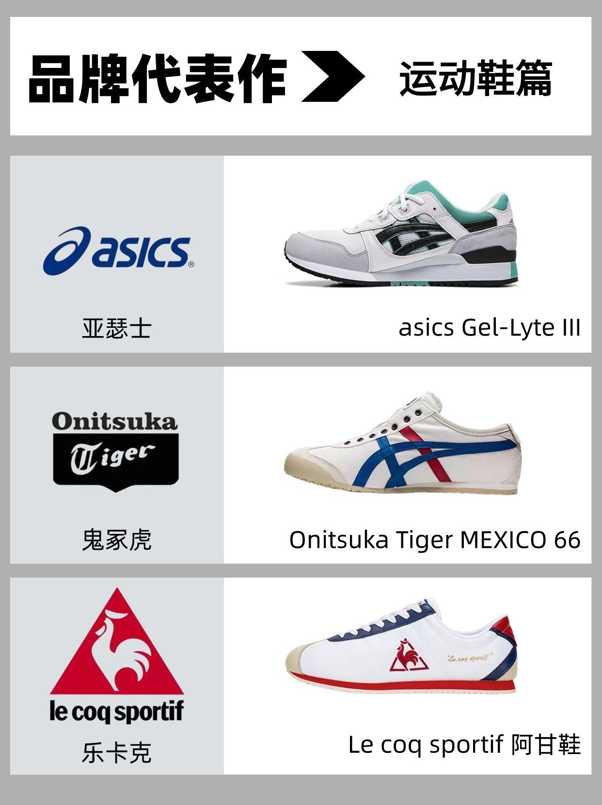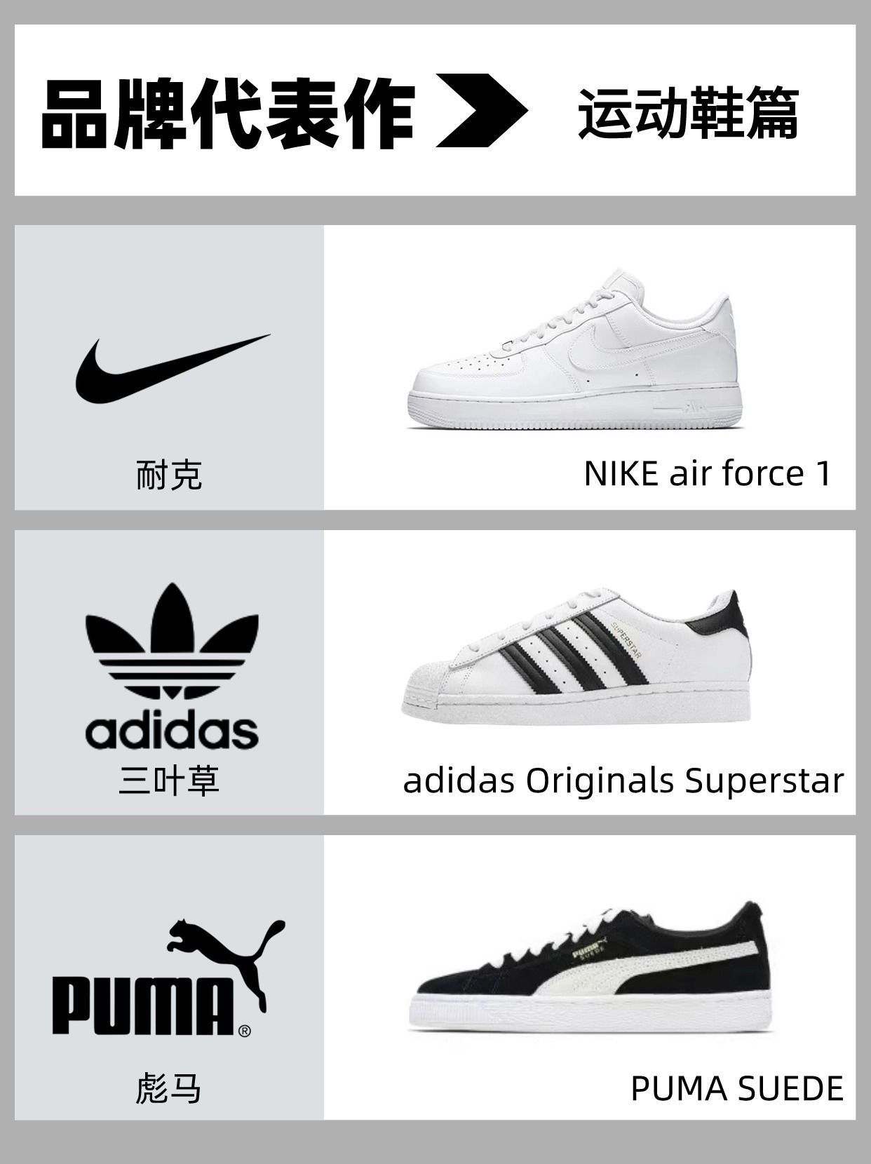 ▪经典代表了什么呢🤔 ▪永bu过时 and 随处可见 ▪分享12个主流运动品牌的经典代表款 ‼ 🇺🇸耐克:NIKE air force 1 🇩🇪三叶草:adidas Originals Superstar 🇩🇪彪马:PUMA SUEDE 🇯🇵亚瑟士:asics Gel-Lyte III 🇯🇵鬼冢虎:Onitsuka Tiger MEXICO 66 🇫🇷乐卡克:Le coq sportif 阿甘鞋 ...