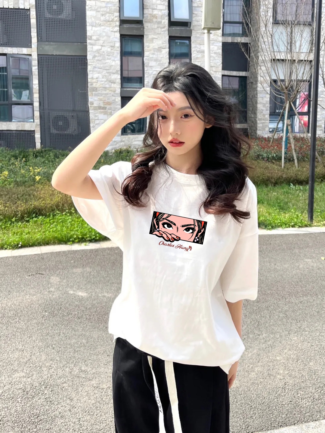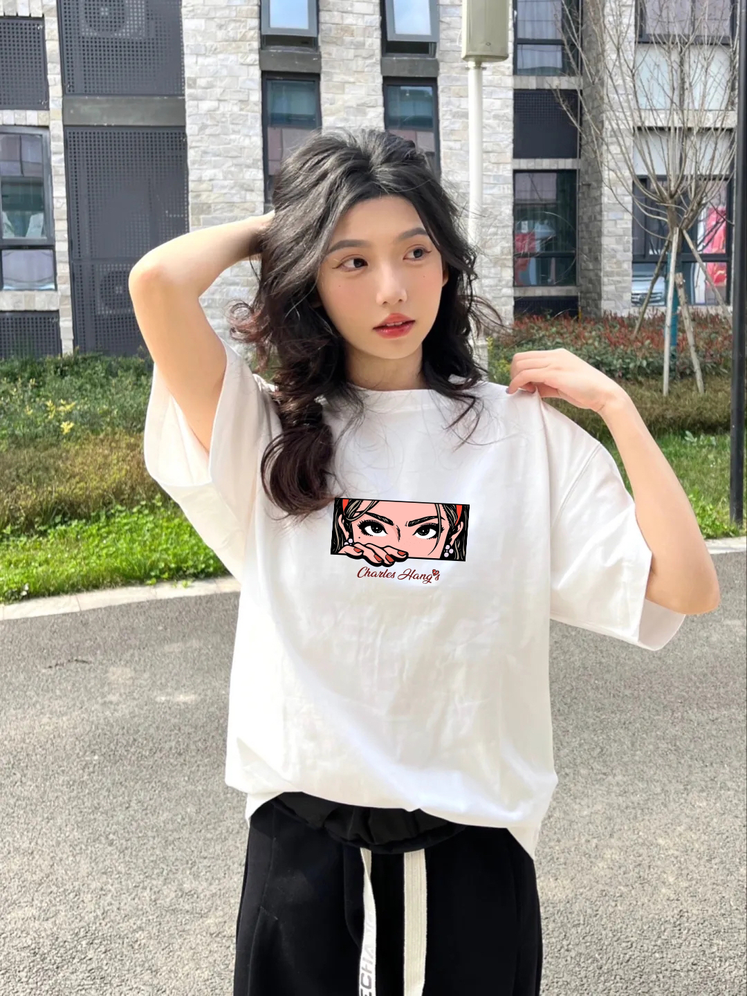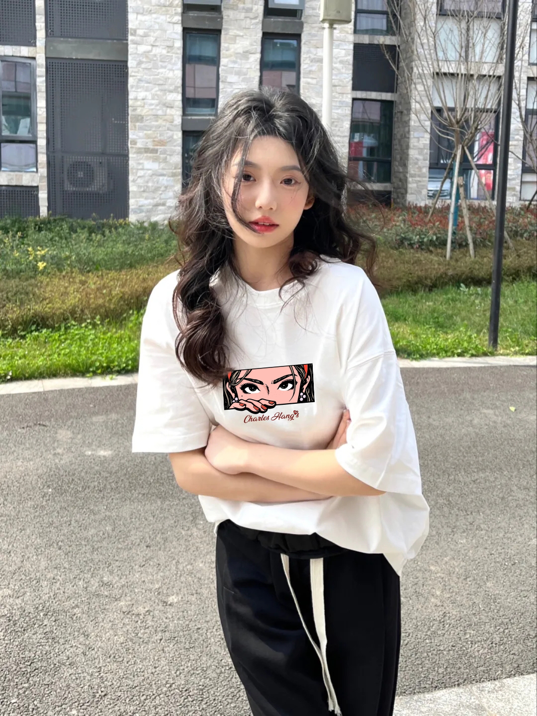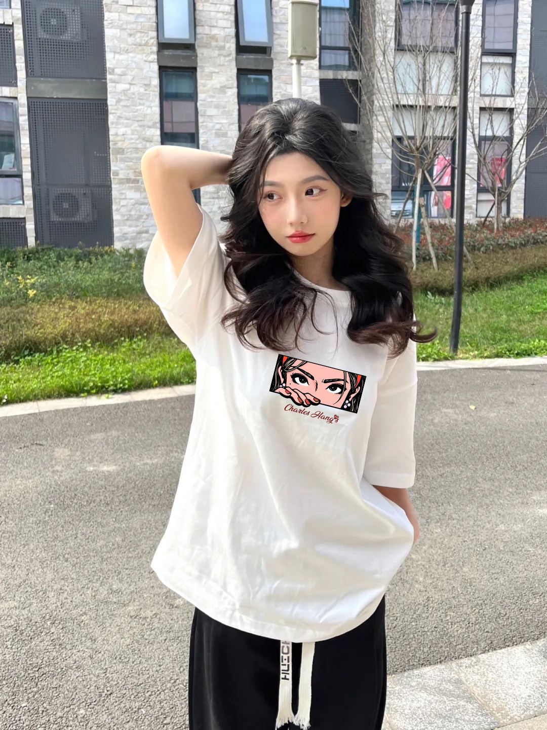 夏天一定要有的白色短袖,主打的就是一个休闲舒适,胸口的动漫卡通印花,简约又不单调,舒适的基础搭配也可以很有氛围感