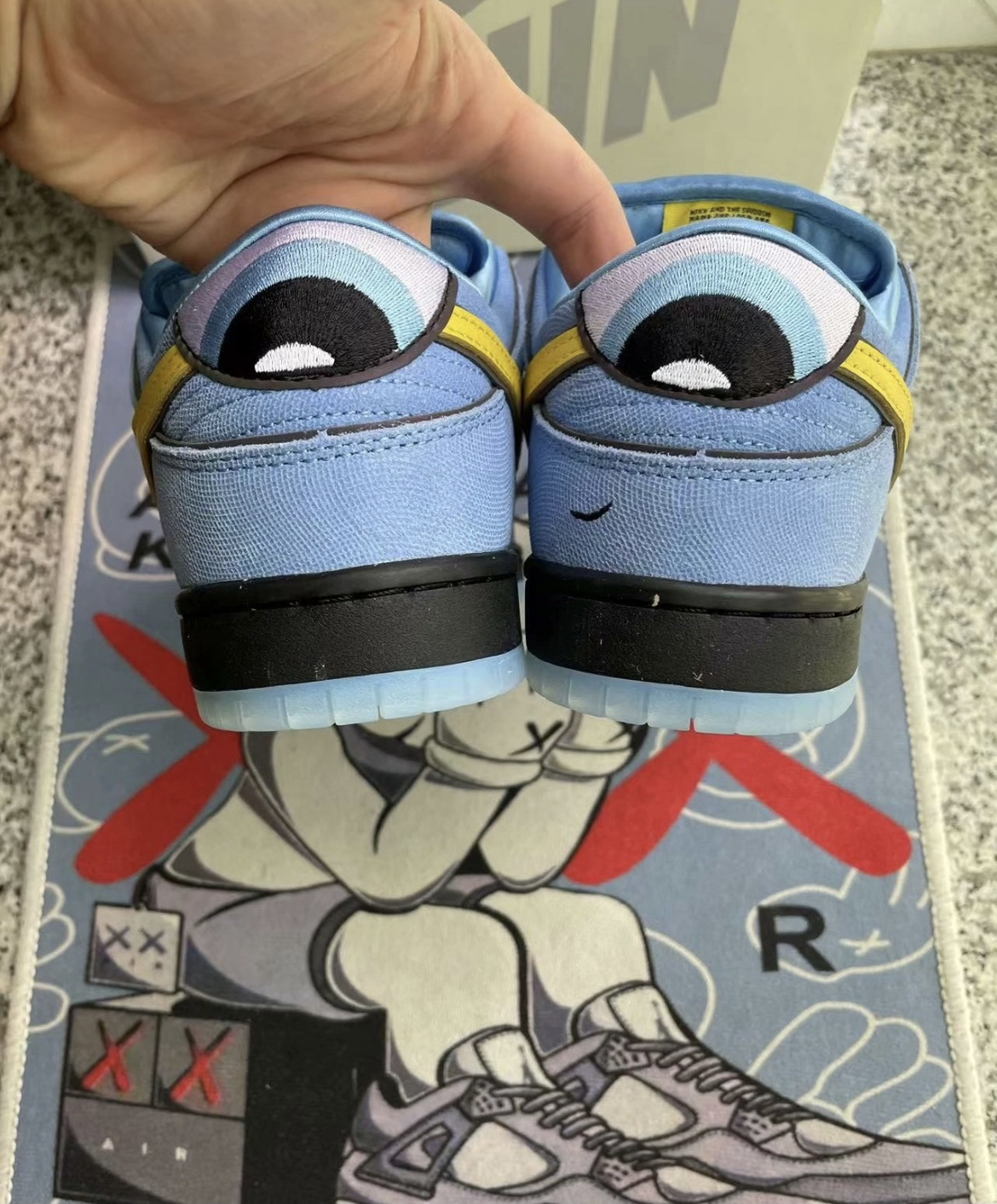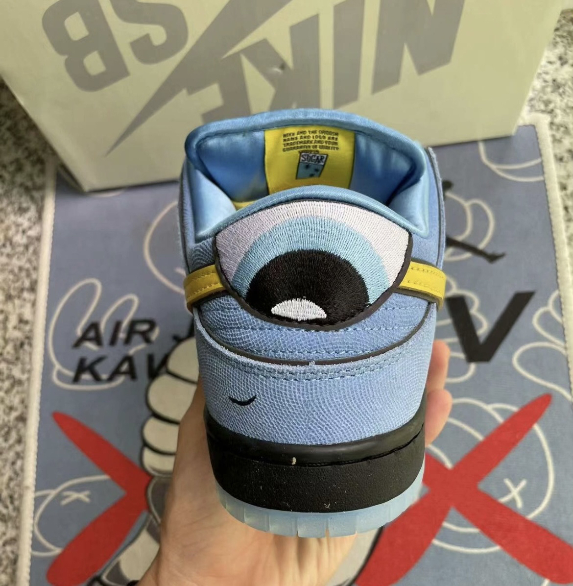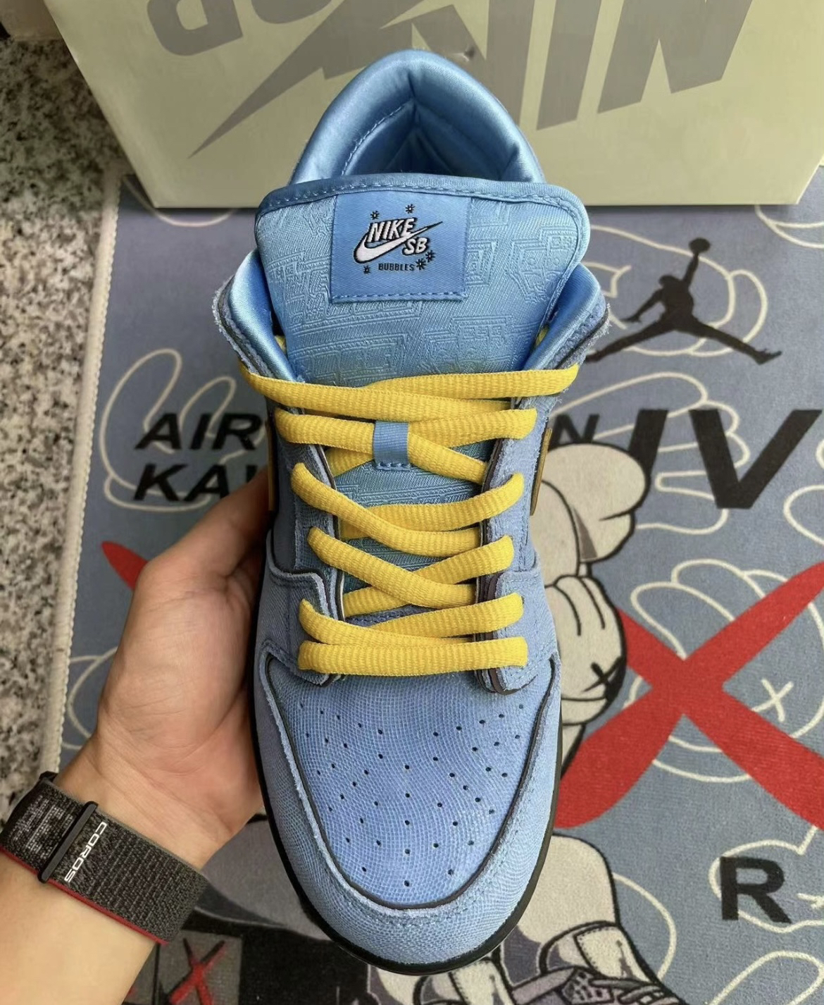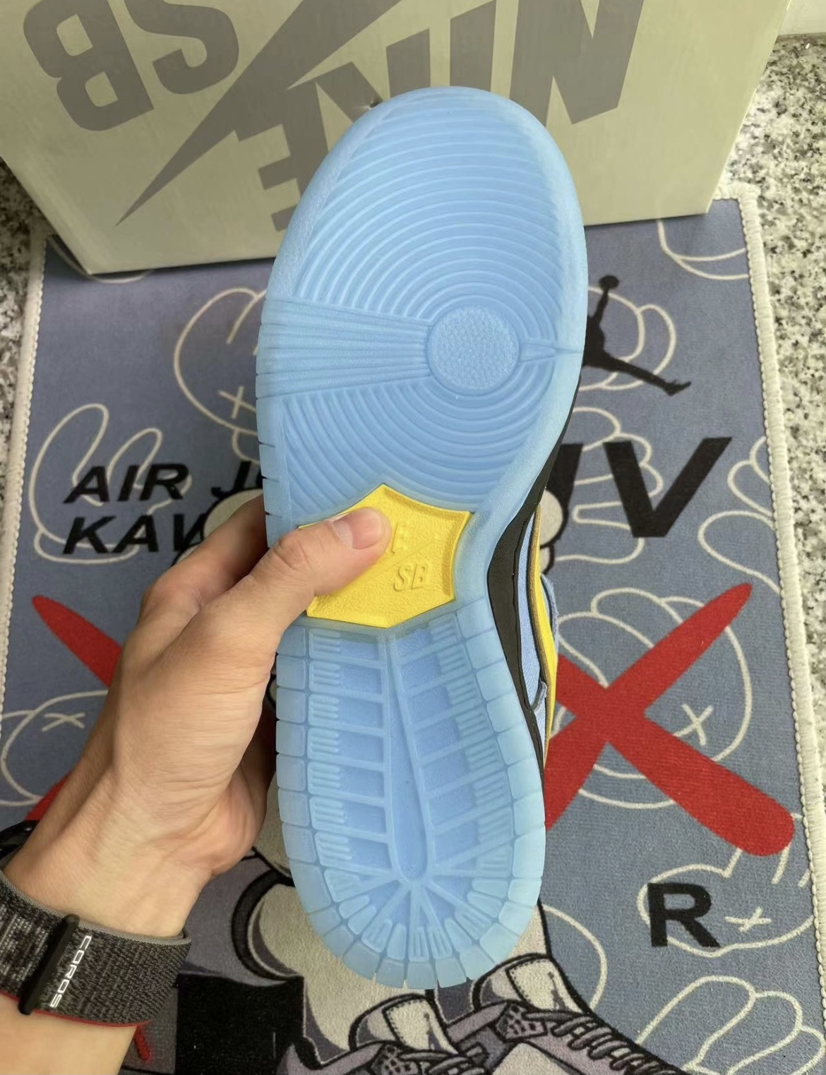 实物到手感觉辨识度很高,配色由宝蓝色和亮黄色撞色组成,鞋底采用蓝色水晶底很有质感,彰显联名的规格,鞋内衬也使用了丝绸材质,脚感比一般的Dunk好很多,完全可以放心冲。