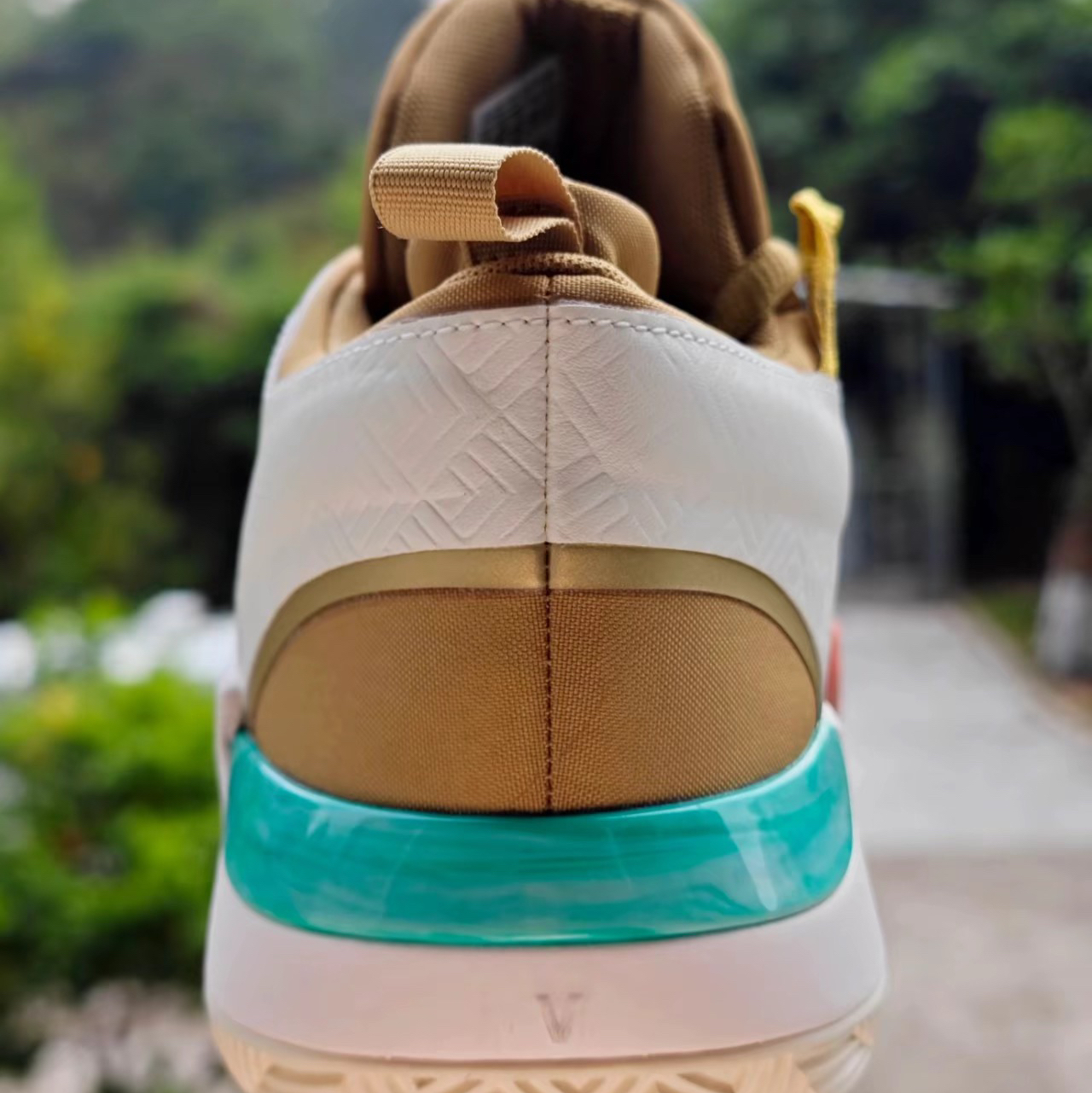 这对米切尔5“龙年”沿袭了哈登7“龙年”的配色方案,米白为主底,棕金为点缀。 玉如意般的tpu镶嵌在后跟,虽是面积不大,但是颇有画龙点睛之感。 ◎最爱的,果然是细节处的诸多处理:鞋面龙格纹、侧面龙纹刺绣、鞋带孔及中底tpu等多处耀金电镀…这谁看了不迷糊!