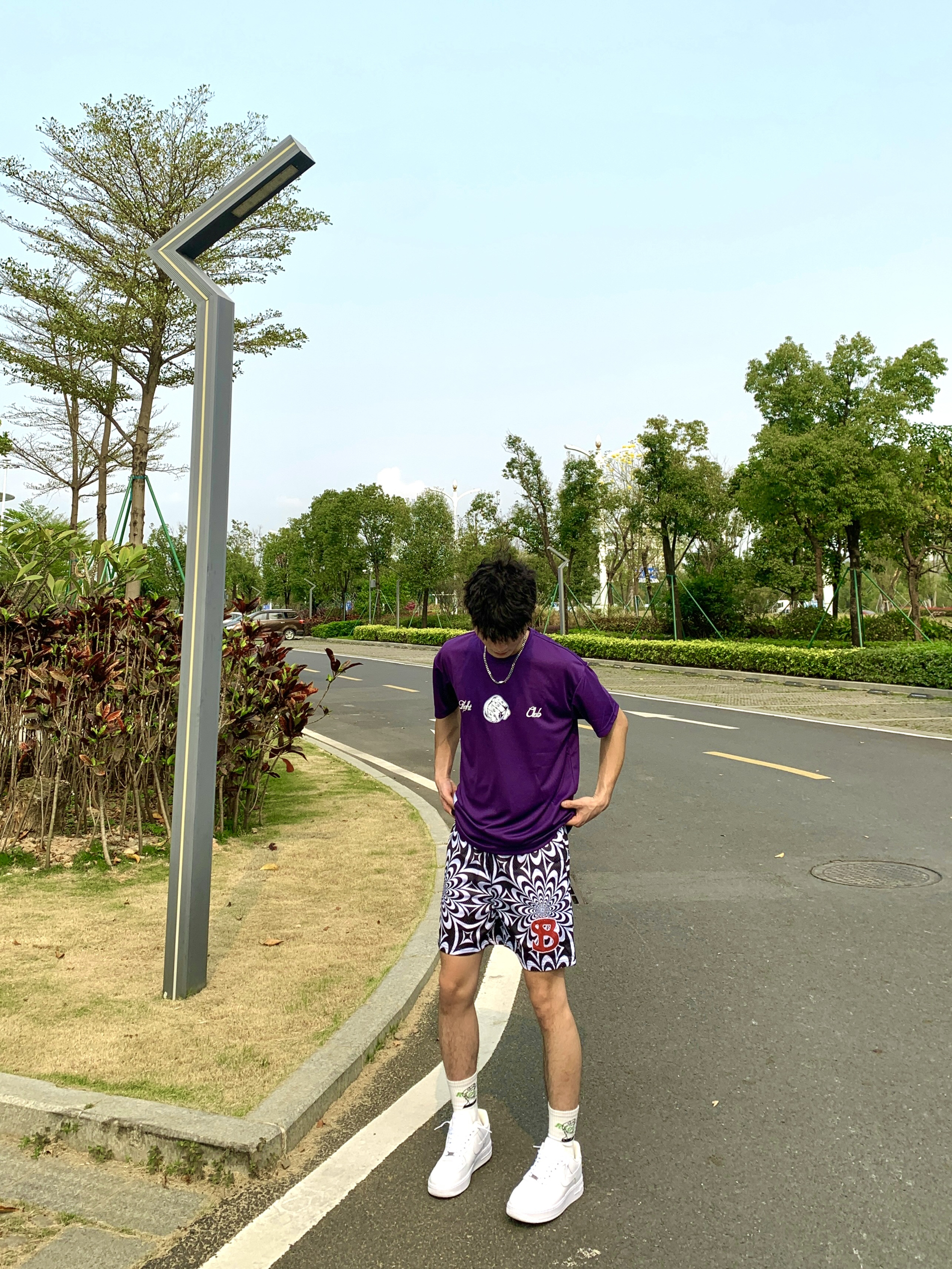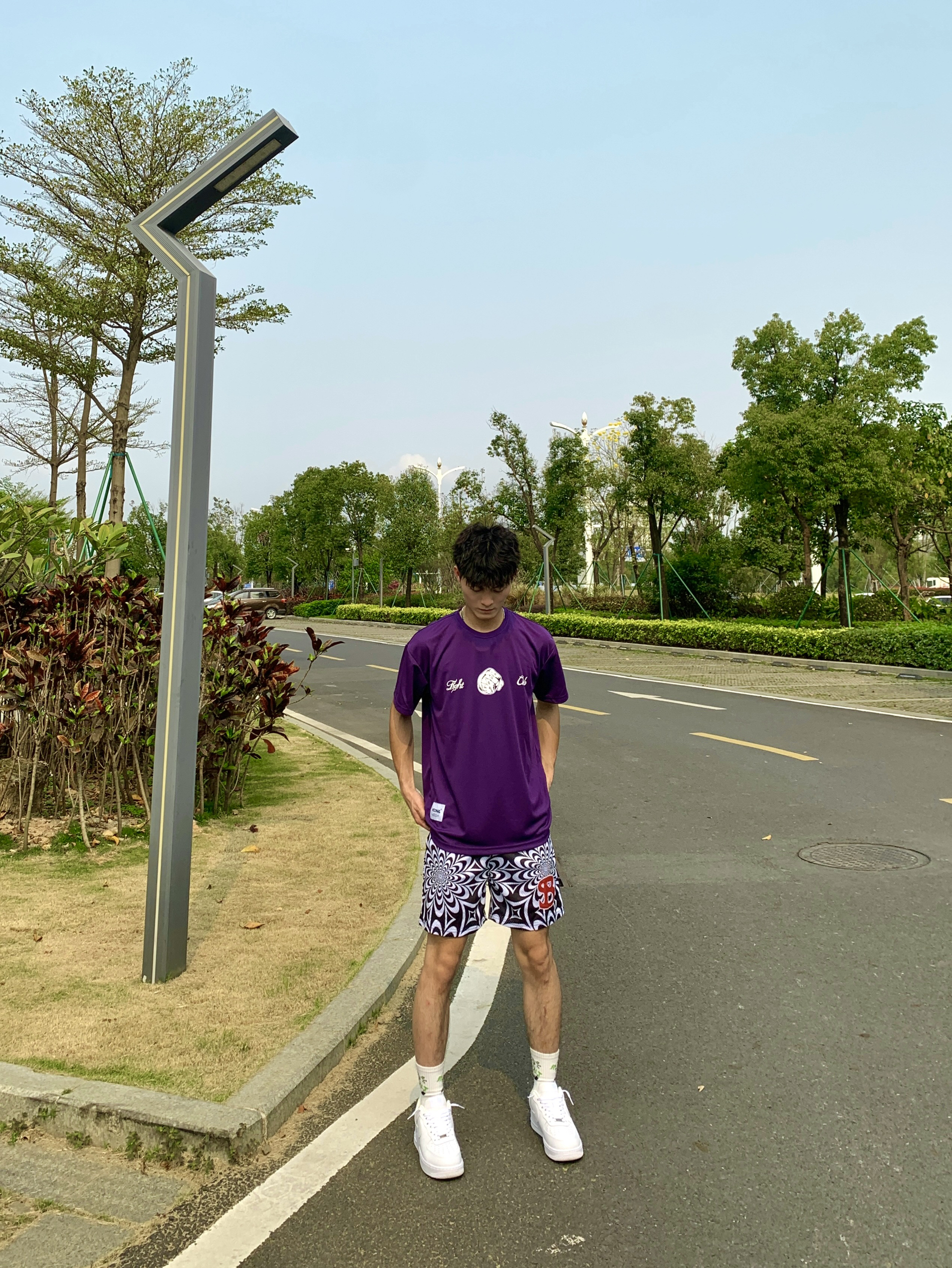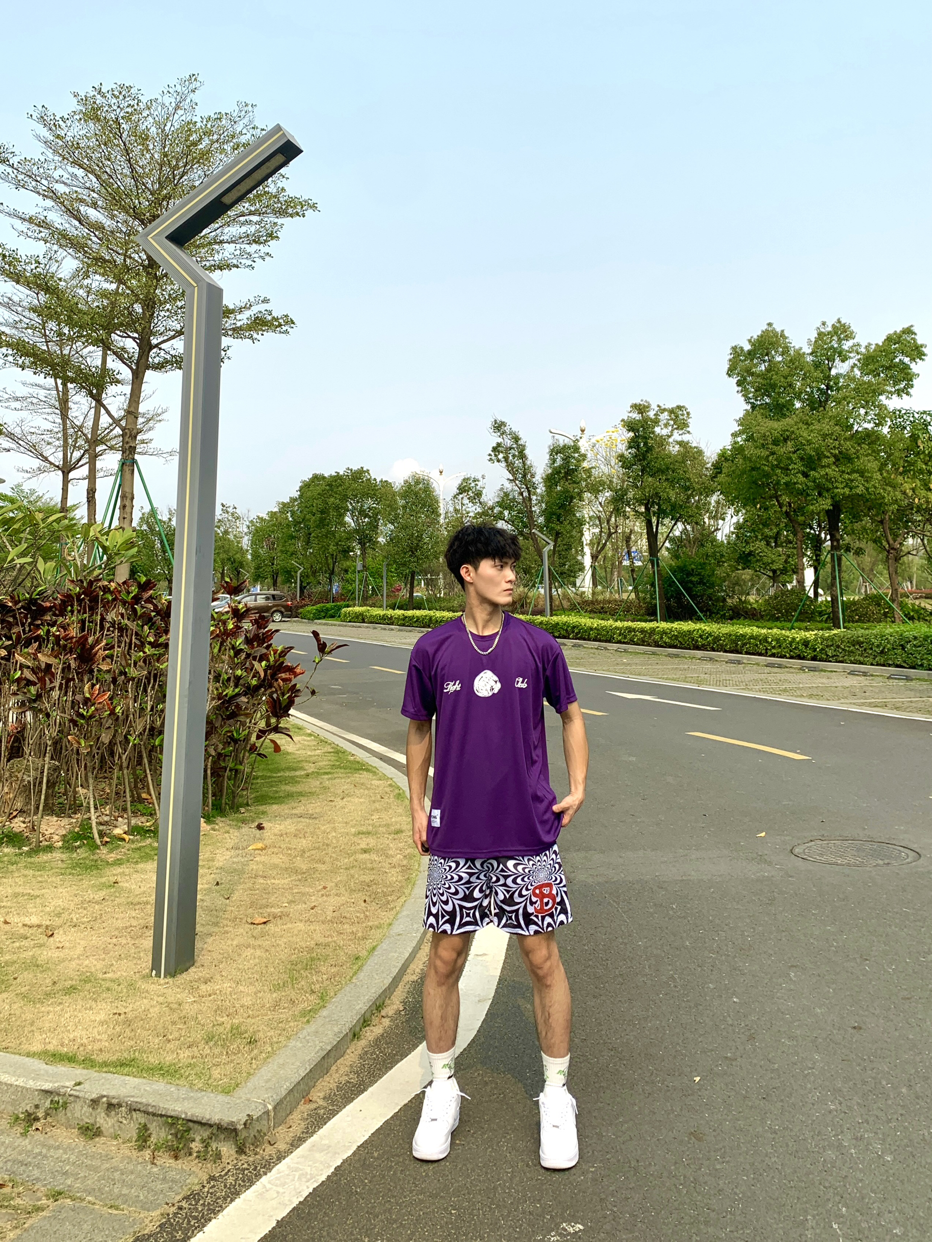简单介绍一下今天这身穿搭吧🥳 📸紫色印花T恤➕黑白色短裤 — — — — — — — — — — — — — — — ①👕 上衣深色系T恤,小网眼面料透气绵密性高,上身板正显身材,正反面拳头印花非常有运动气息,日常运动打球穿搭必备 - ②🩳 下搭一条黑白渐变短裤,设计风格偏美式,依旧双层网眼面料透气性好,喜欢这种复杂点类型的bro,可尝试冲 - 💫tips:上衣与短裤均为深色系,视觉上更有个性感...