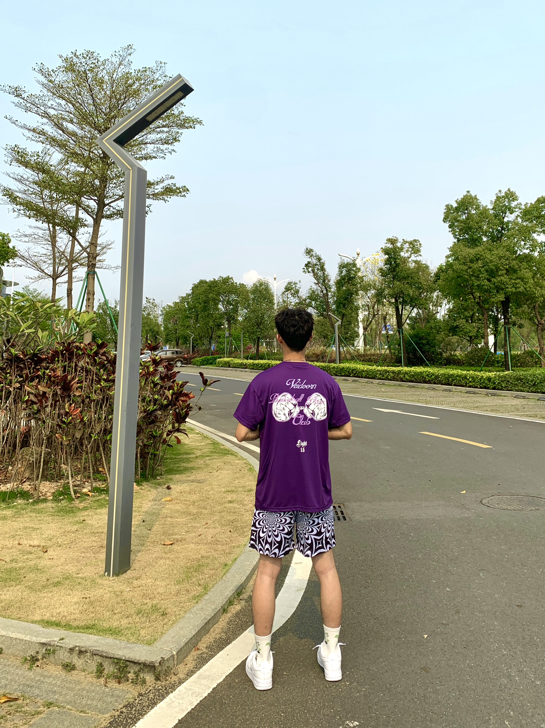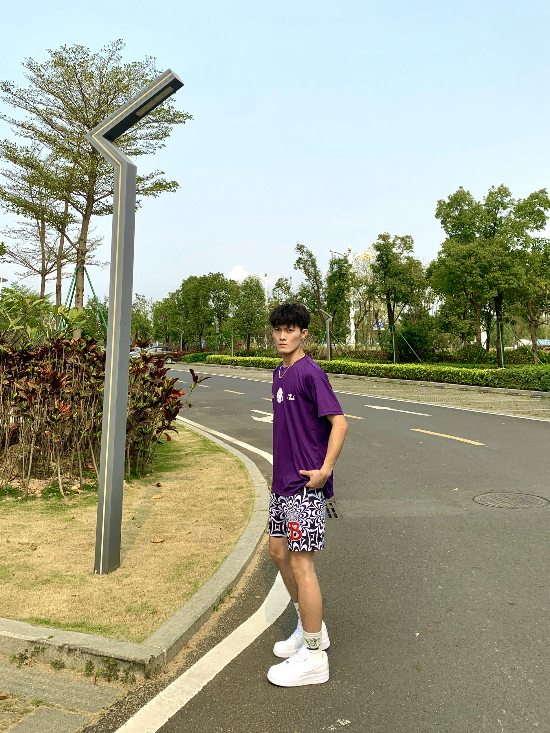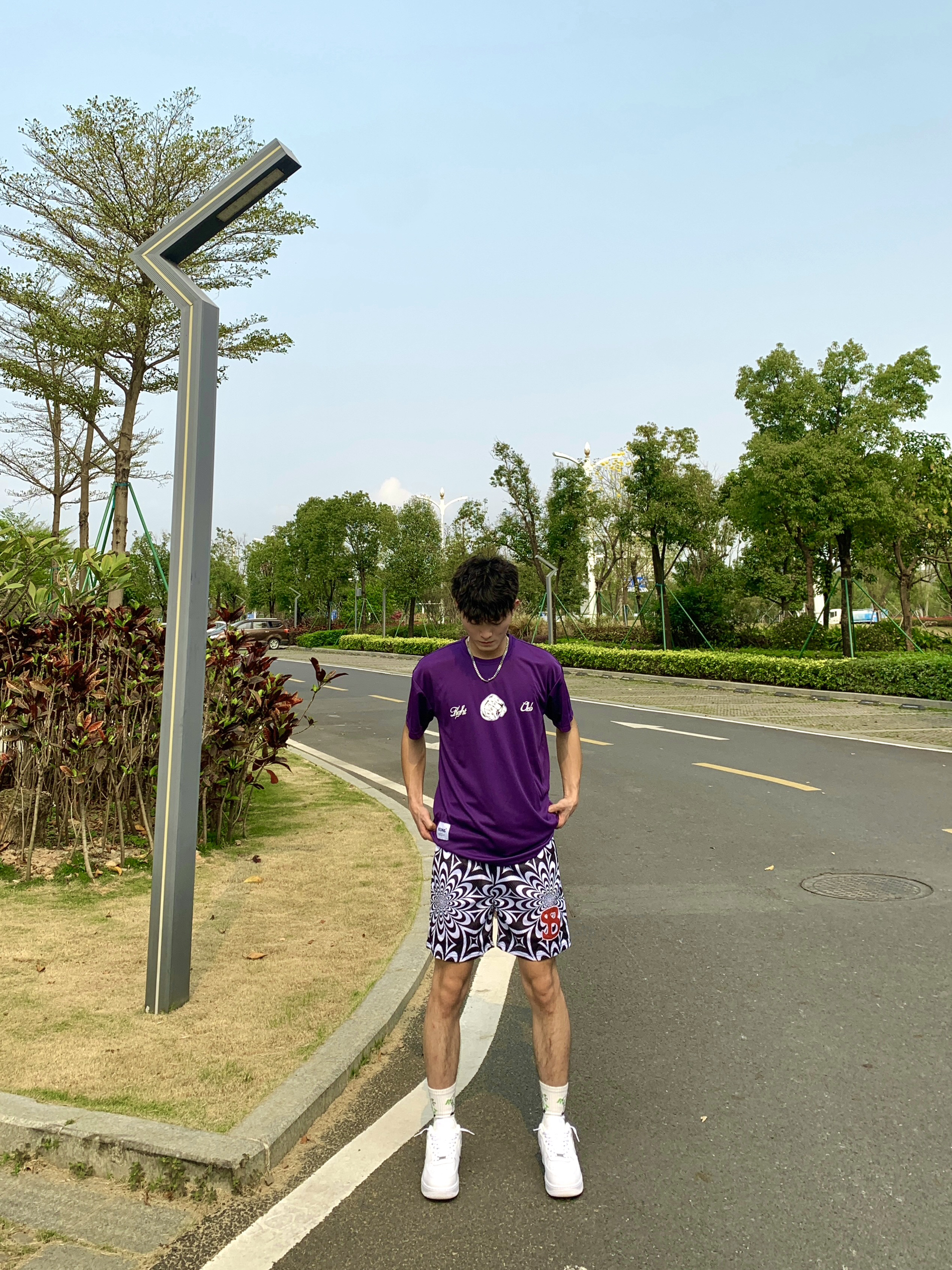 简单介绍一下今天这身穿搭吧🥳 📸紫色印花T恤➕黑白色短裤 — — — — — — — — — — — — — — — ①👕 上衣深色系T恤,小网眼面料透气绵密性高,上身板正显身材,正反面拳头印花非常有运动气息,日常运动打球穿搭必备 - ②🩳 下搭一条黑白渐变短裤,设计风格偏美式,依旧双层网眼面料透气性好,喜欢这种复杂点类型的bro,可尝试冲 - 💫tips:上衣与短裤均为深色系,视觉上更有个性感...