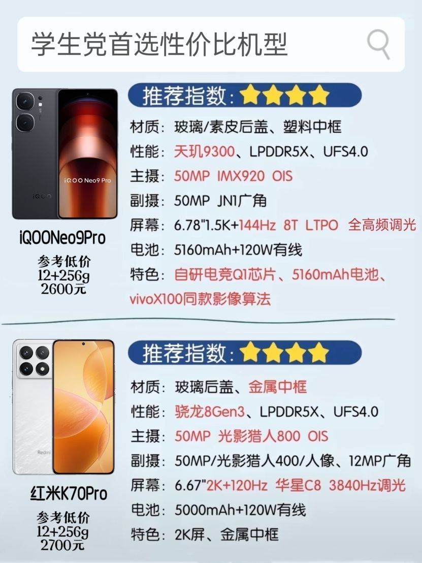 买手机先看“三大件”——处理器、影像、屏幕,如果三者都想兼顾到,你的购机预算起码要追加到2500元以上。 下面推荐几款4月份值得买的高性能手机。 1、学生党首选性价比机型 iQOONeo9Pro:蓝厂调教的天玑9300整体表出色,电竞直屏+自研Q1芯片,玩游戏真是一玩一个不吱声。 红米K70Pro:以往诟病较深的影像方面,K70Pro也有较大改善,光线好的时候甚至能和小米14打的有来有回。 2...