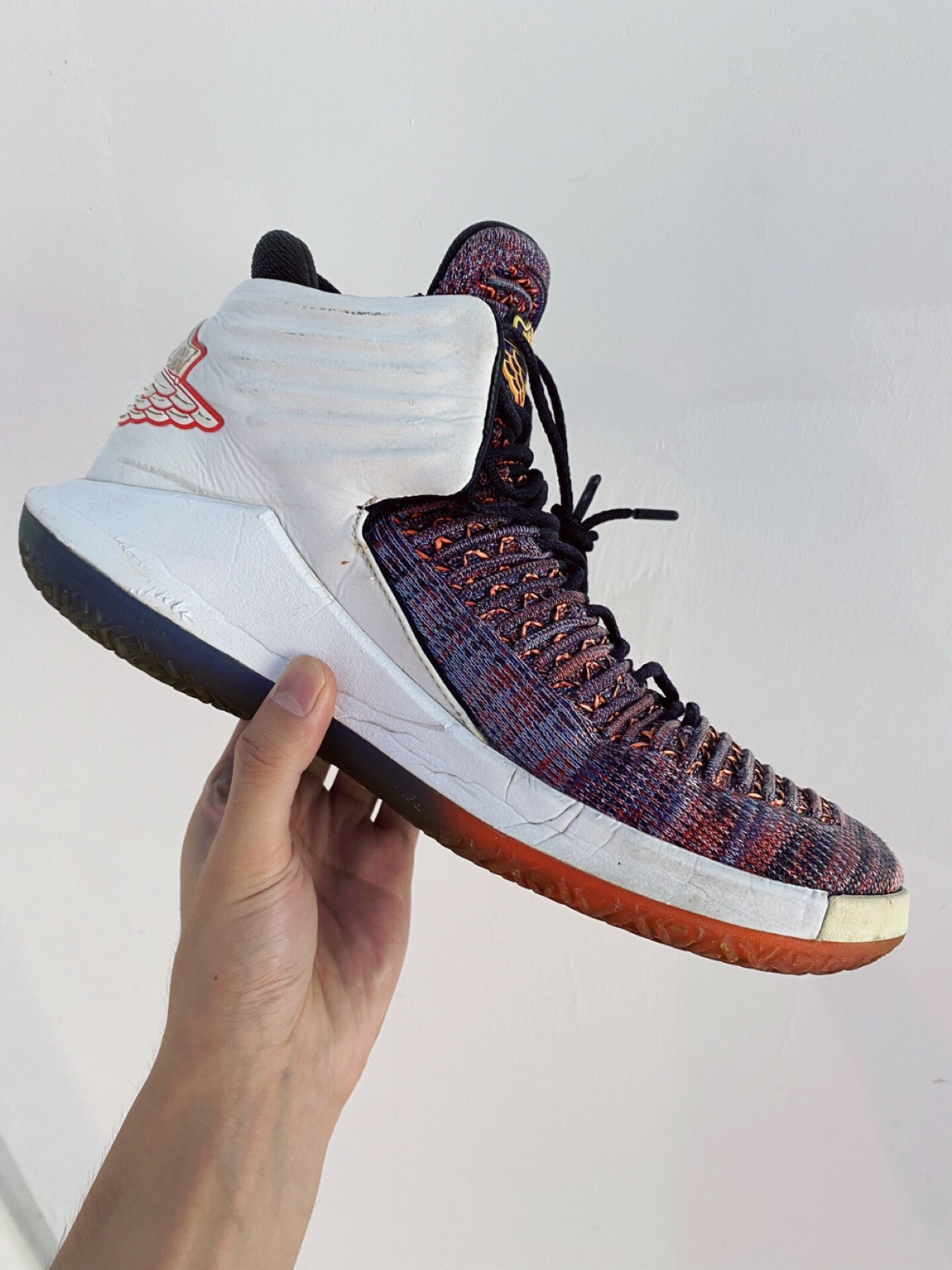 AJ32系列估计大多数小伙伴都没接触过 这双AJ32 最后一幕 我也是偶然的机会下入手了它 并且陪伴我征战了一段时间 除了有些褶皱沾灰之外,性能还是挺能打的💪 配色方面也是自然而好看 作为一双实战篮球鞋我觉得它很值得~