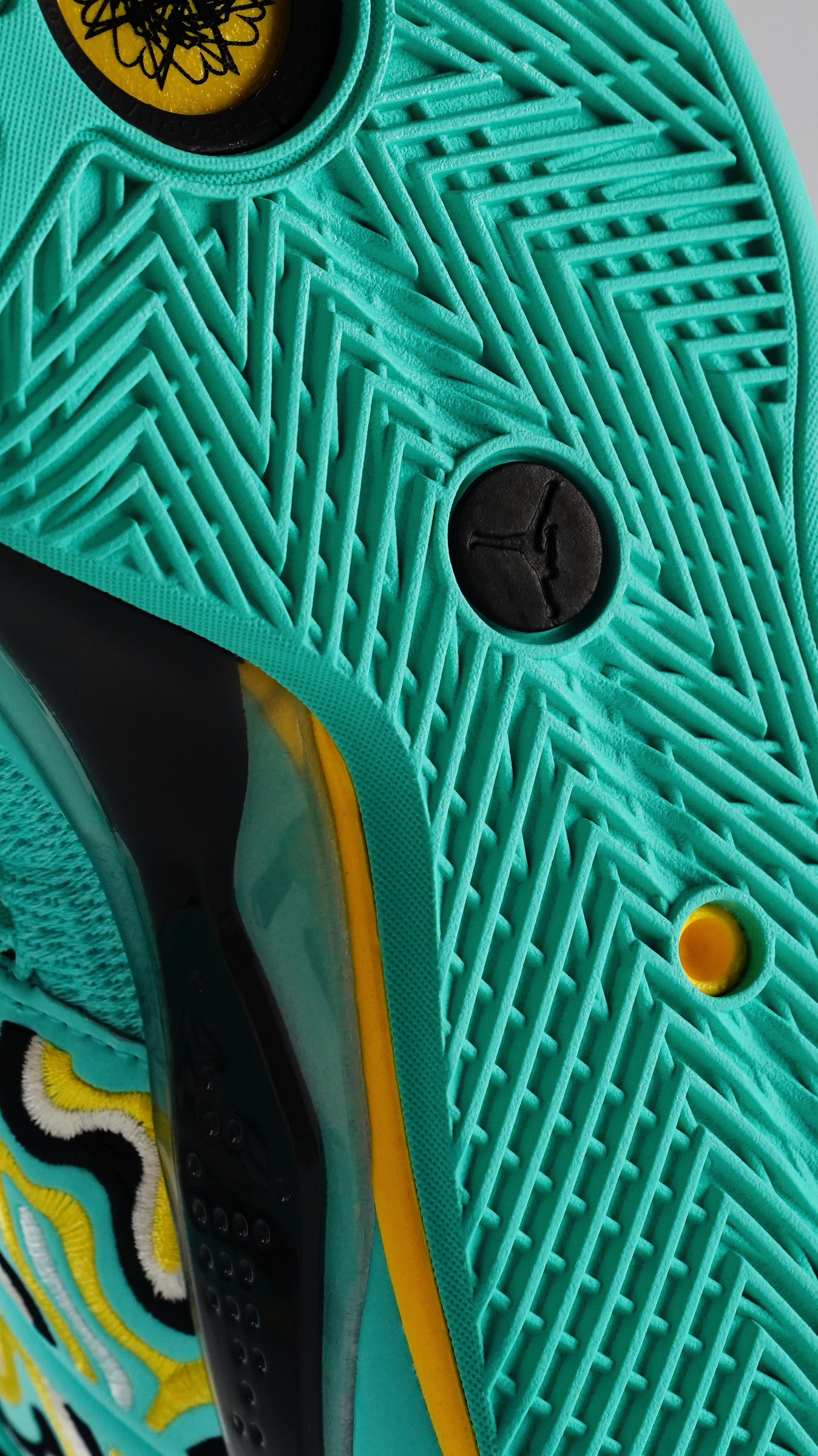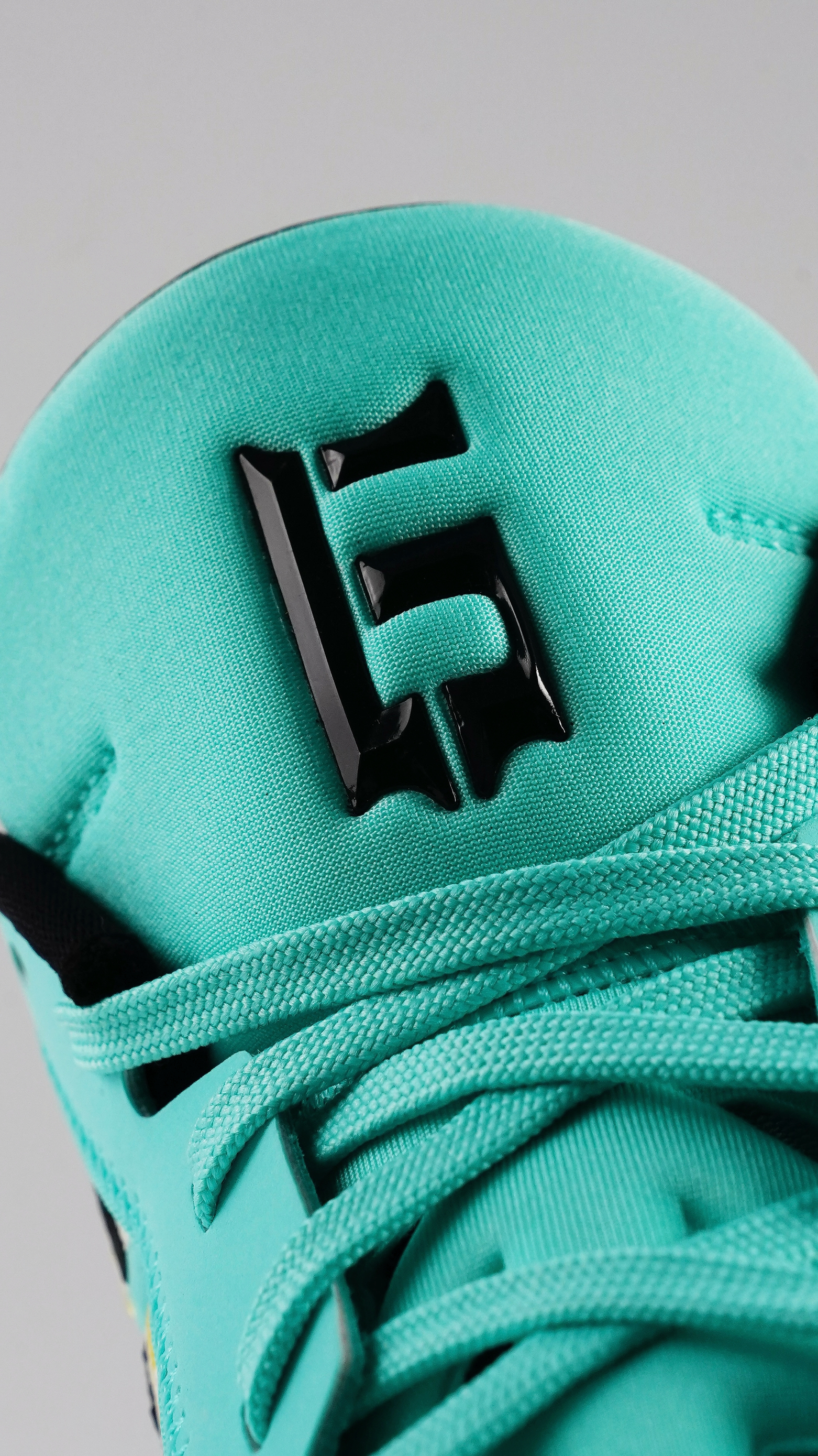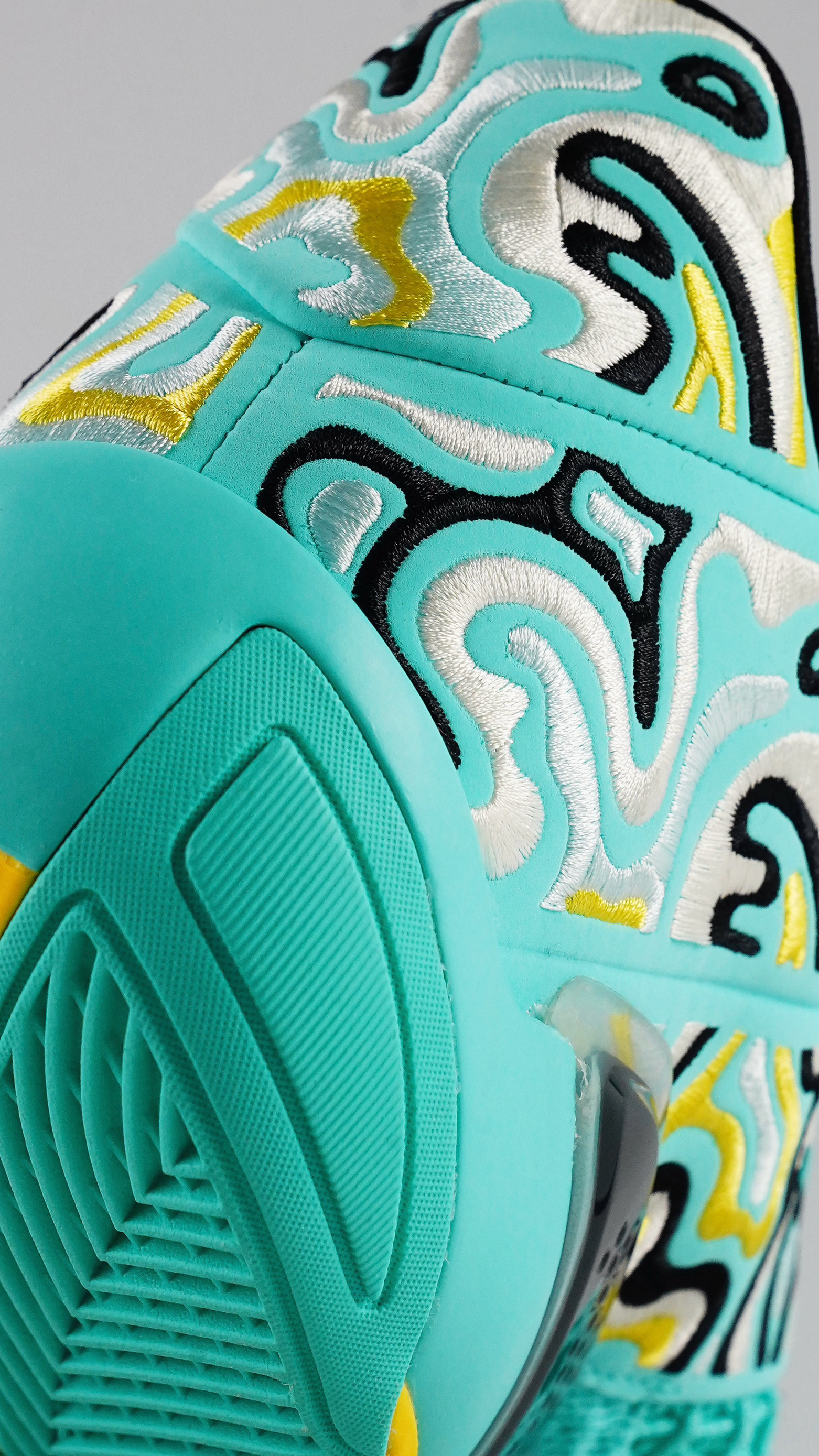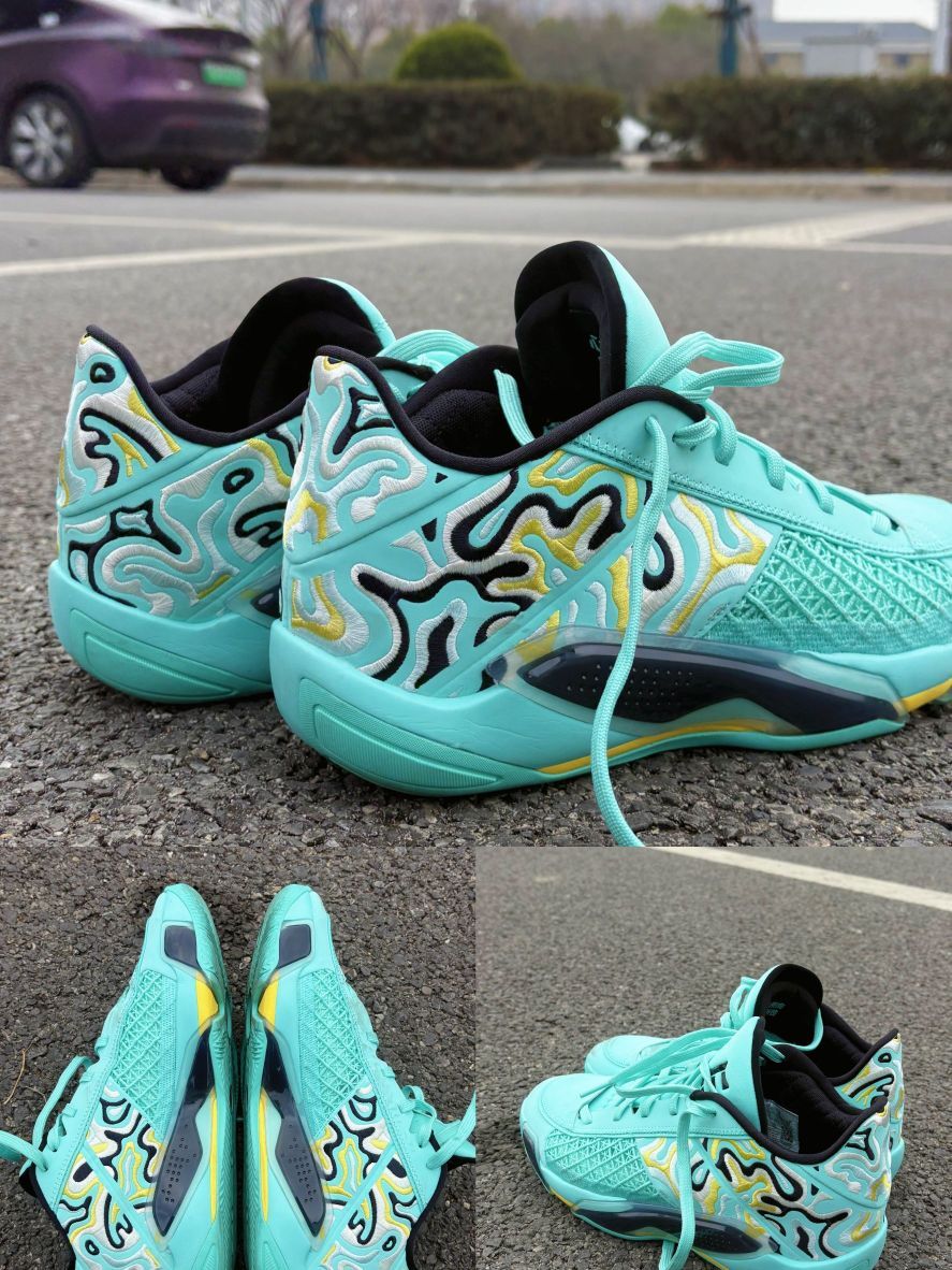 郭艾伦的PE配色正代鞋款来到了AJ38 Low,这次的蓝绿色颜色更特别,后跟刺绣的花纹也很特殊,还加入了黄色细节点缀。