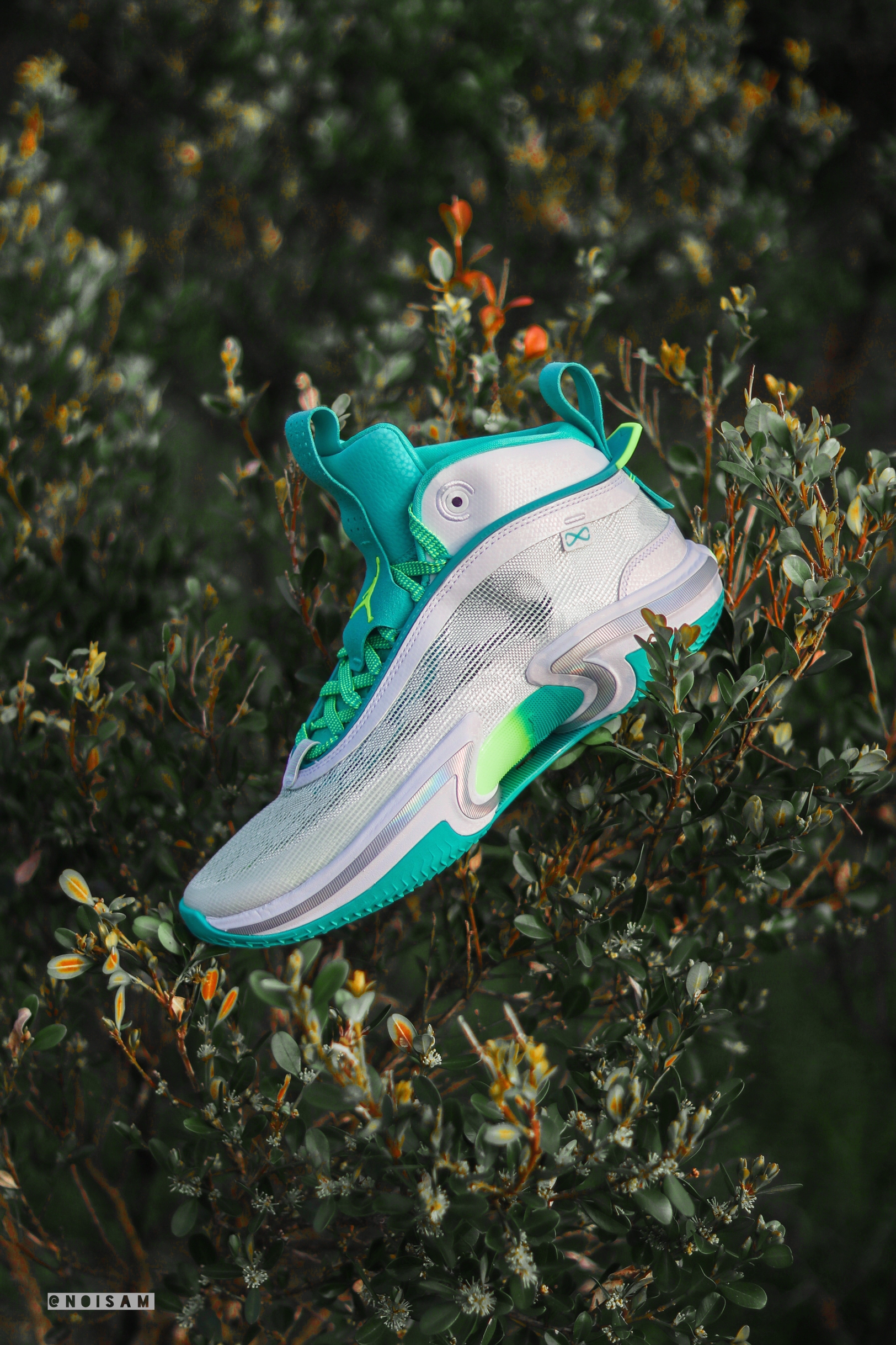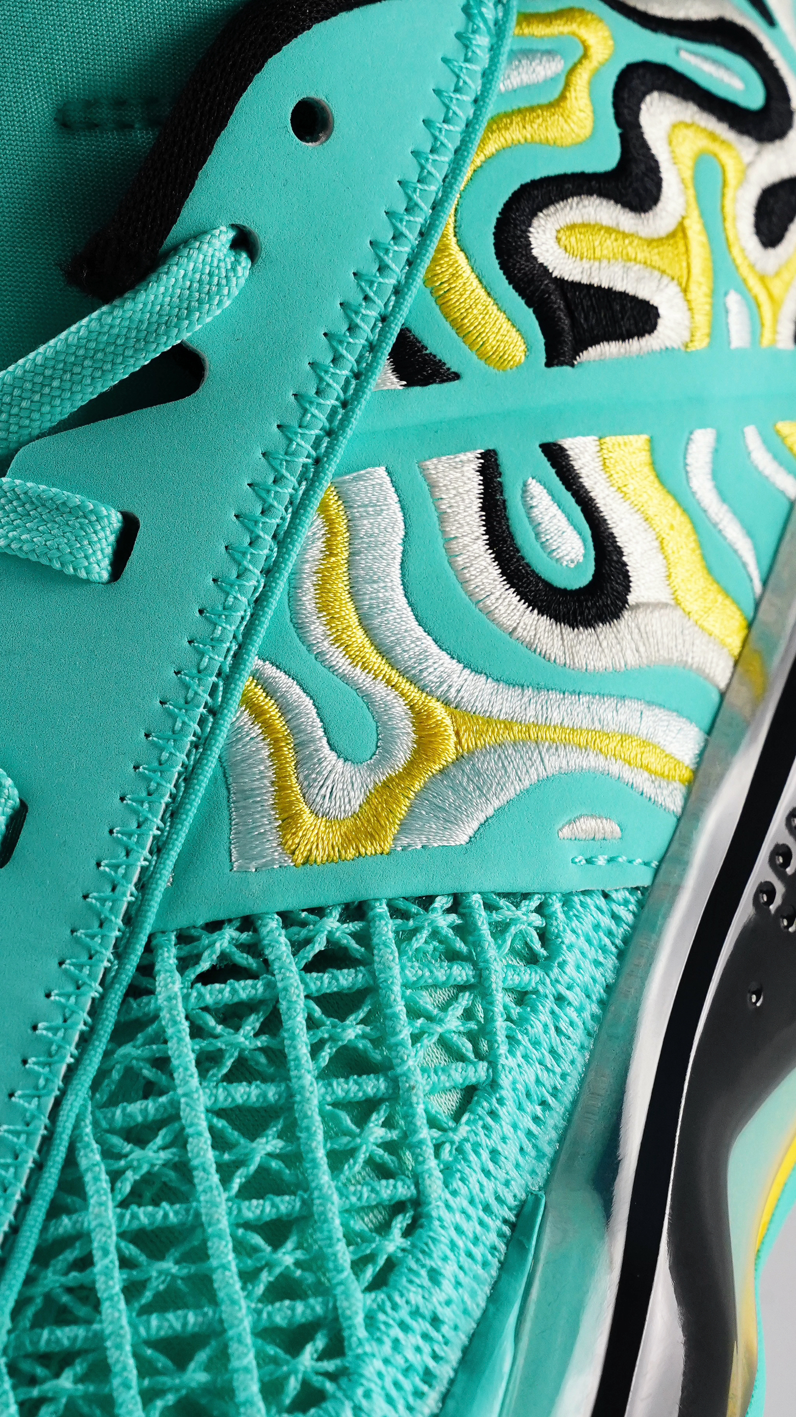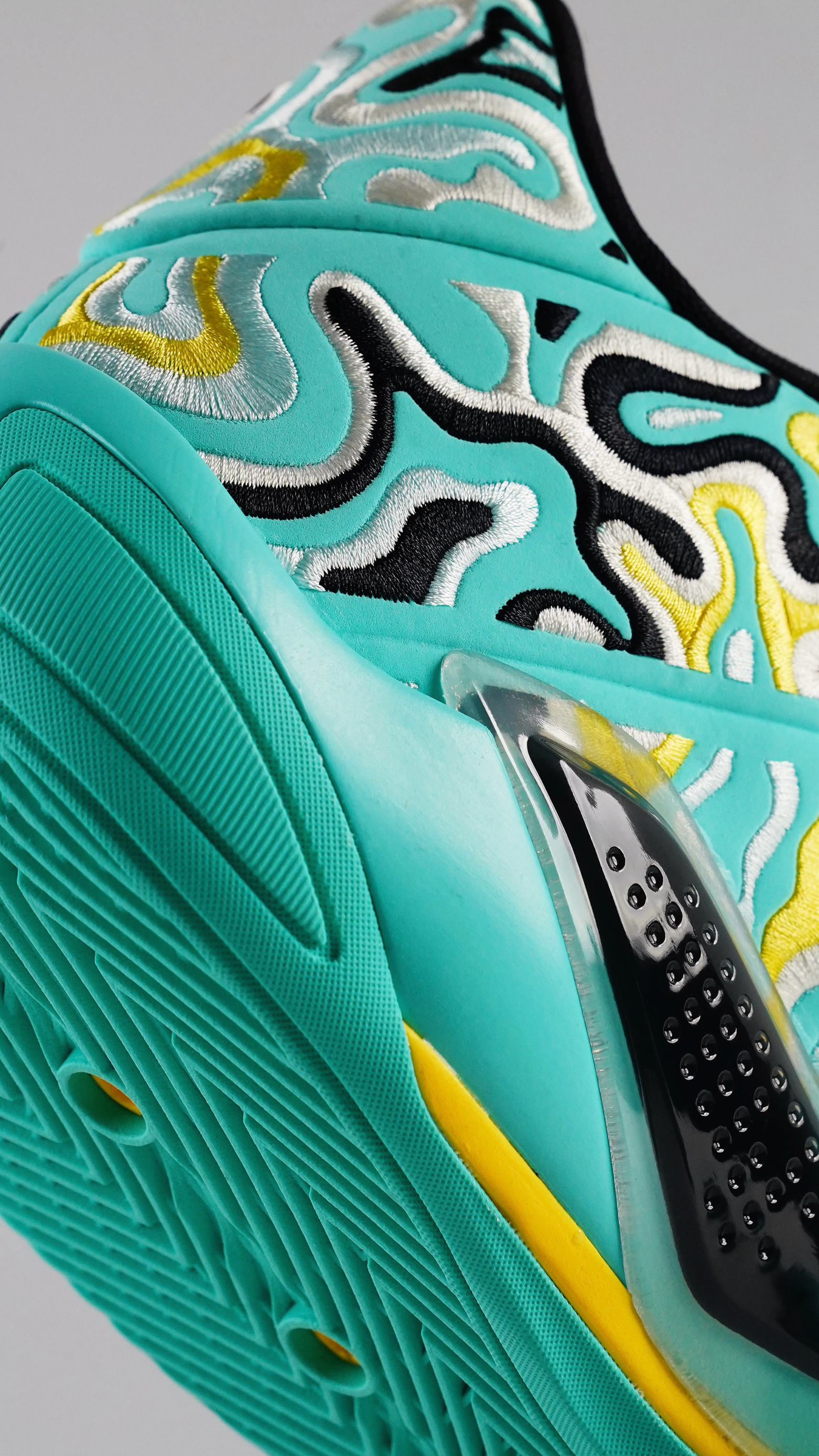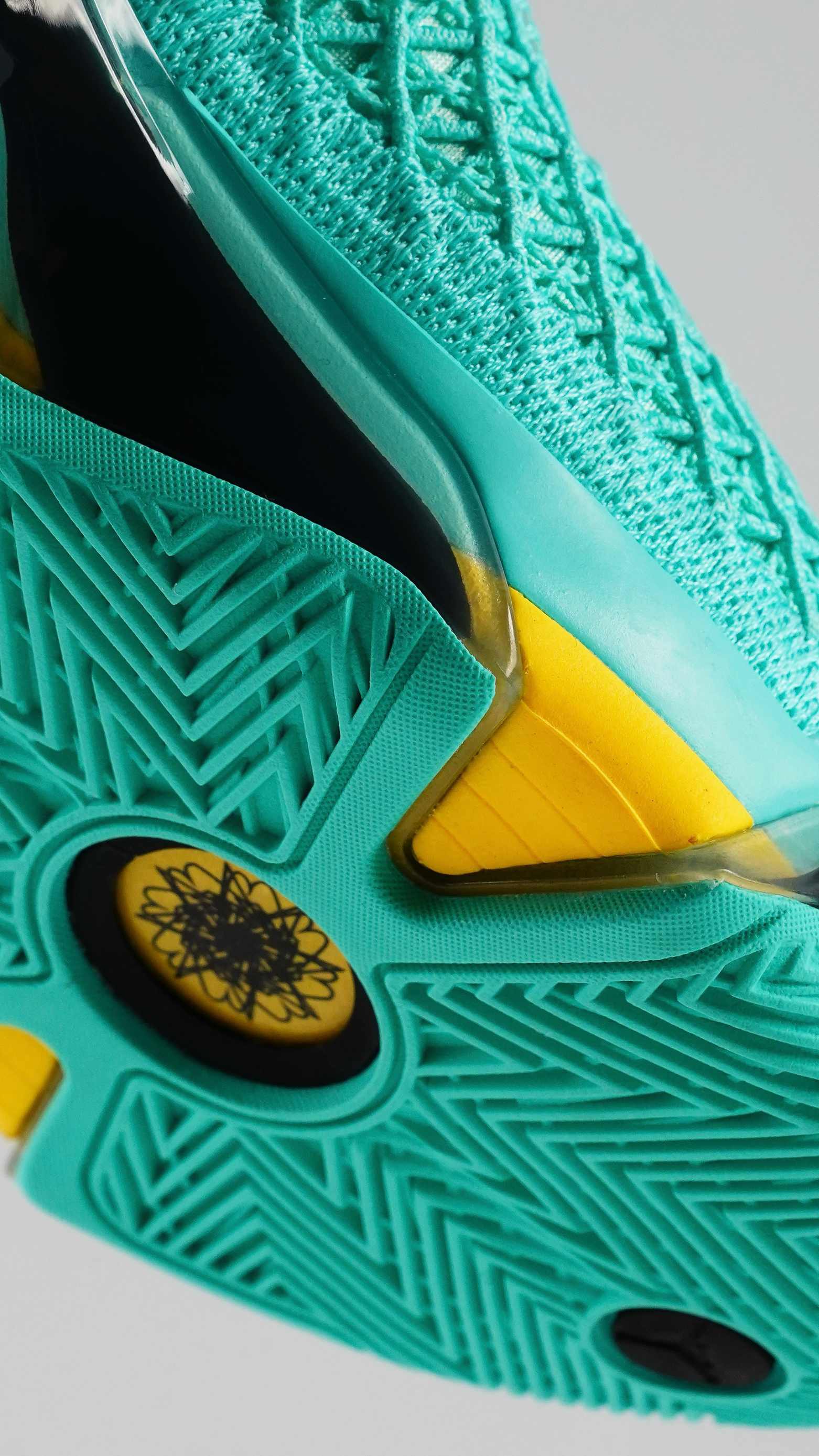 郭艾伦的PE配色正代鞋款来到了AJ38 Low,这次的蓝绿色颜色更特别,后跟刺绣的花纹也很特殊,还加入了黄色细节点缀。