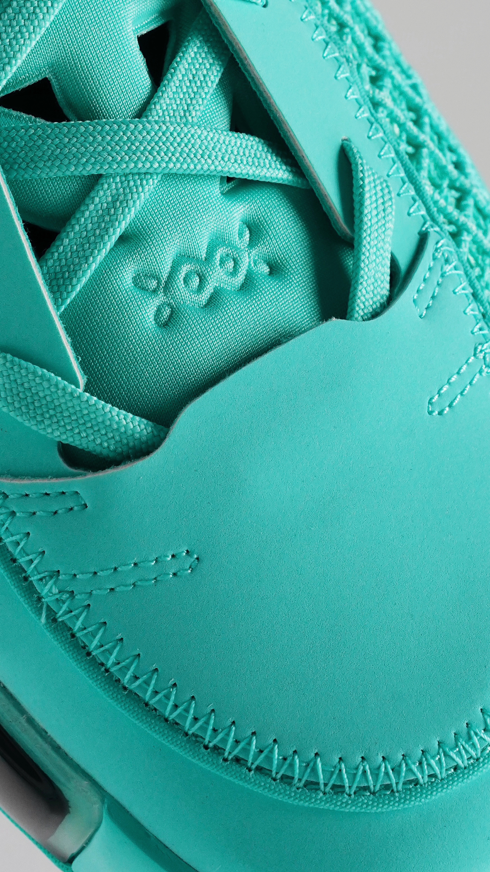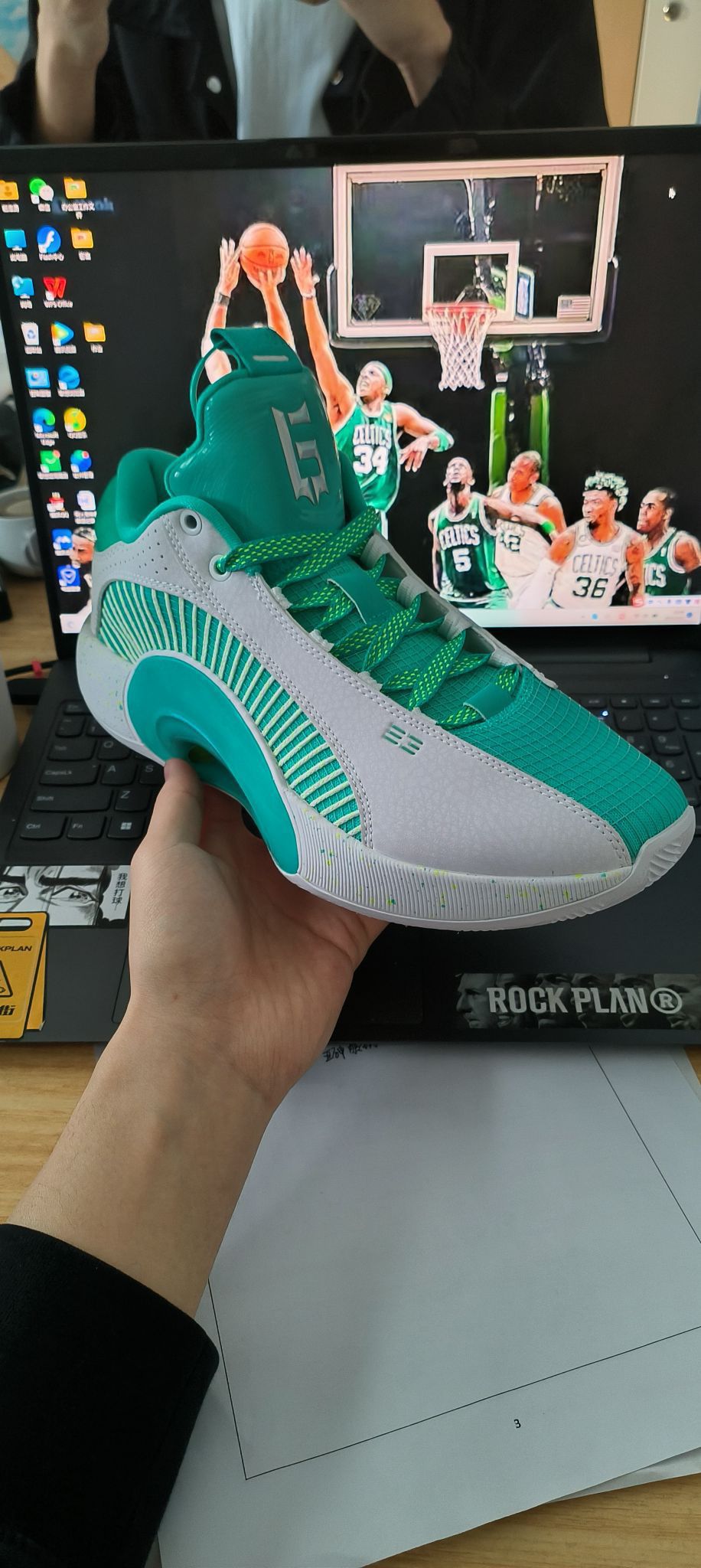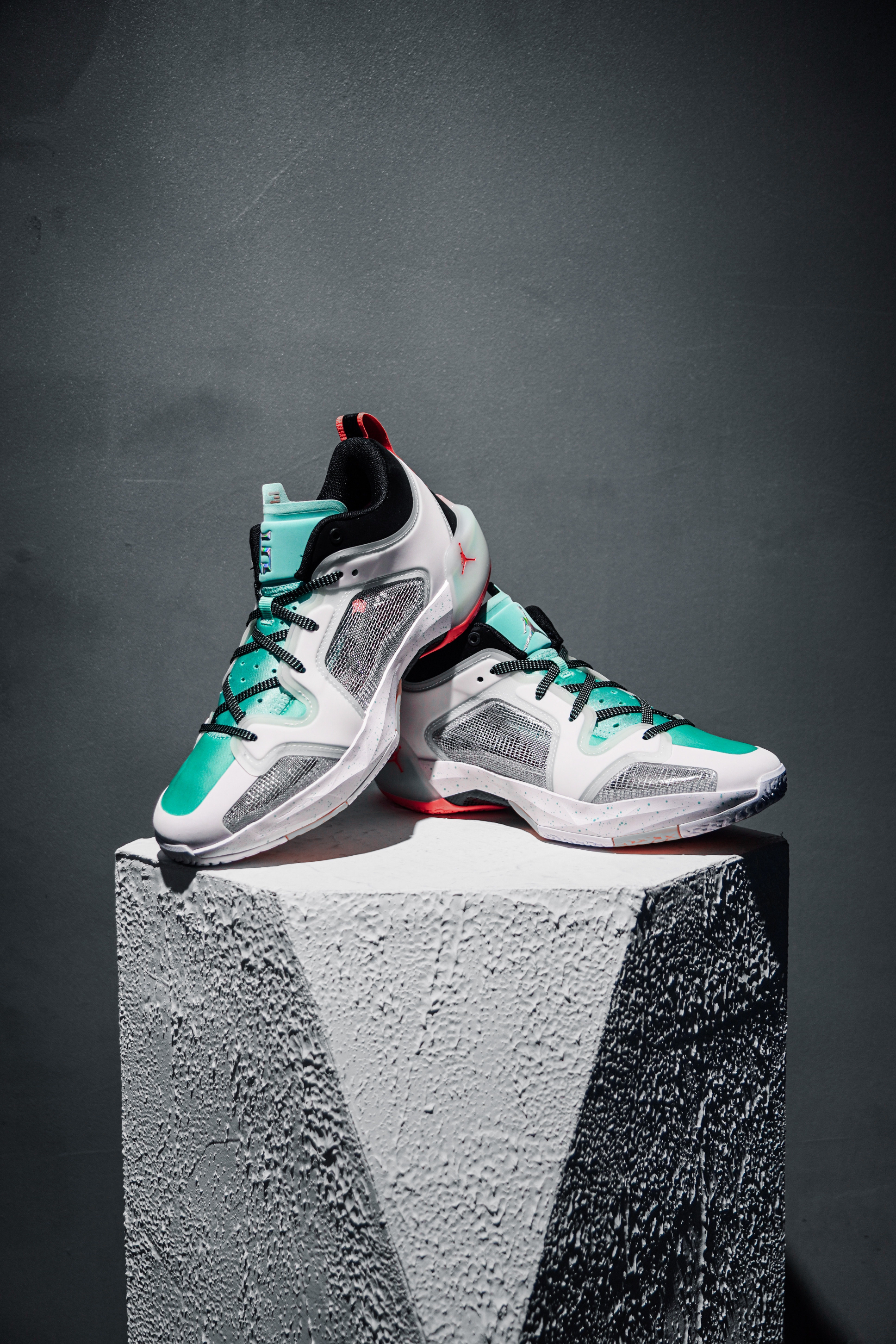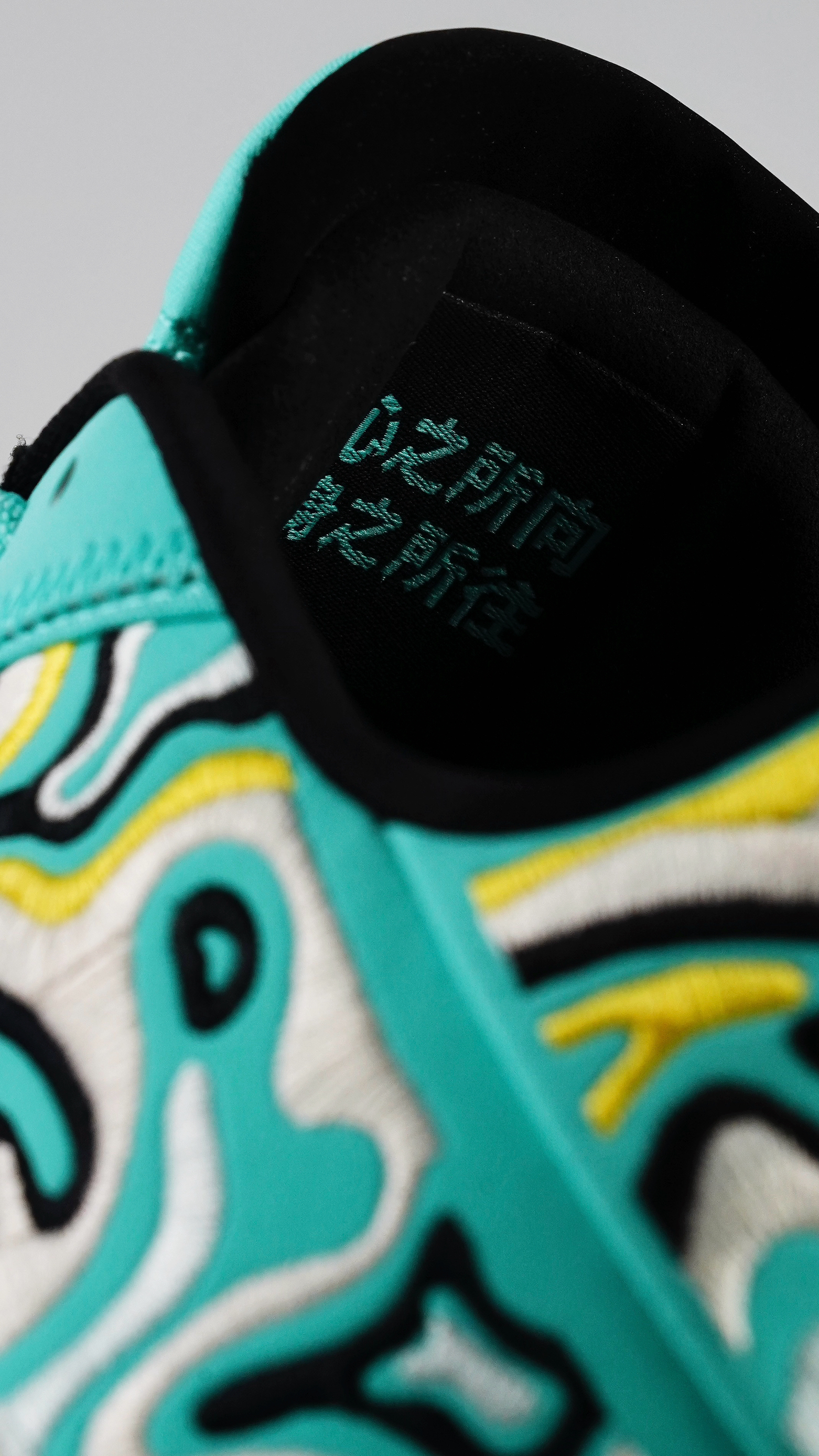 郭艾伦的PE配色正代鞋款来到了AJ38 Low,这次的蓝绿色颜色更特别,后跟刺绣的花纹也很特殊,还加入了黄色细节点缀。