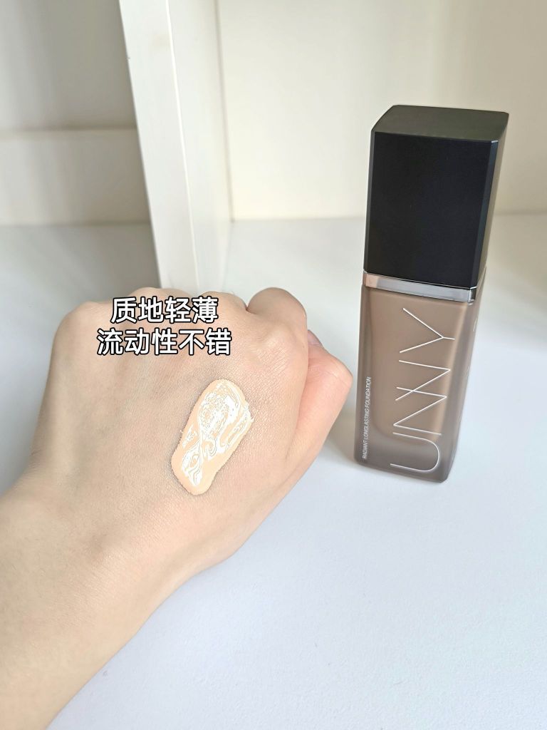 :UNNY 持妆控油粉底液 快到夏天了,油皮最怕的是脱妆和出油! 我是混油皮黄一白,用的是哑光版N01自然色 质地轻薄好推开,上脸薄薄的一层就可以啦 我用的是湿粉扑拍开的,整个妆效是雾面哑光 遮瑕力也在线,粉底液上脸服帖不厚重 到晚上鼻翼两侧也没咋脱妆 一天带妆下来都是没问题,而且越夜越美丽~